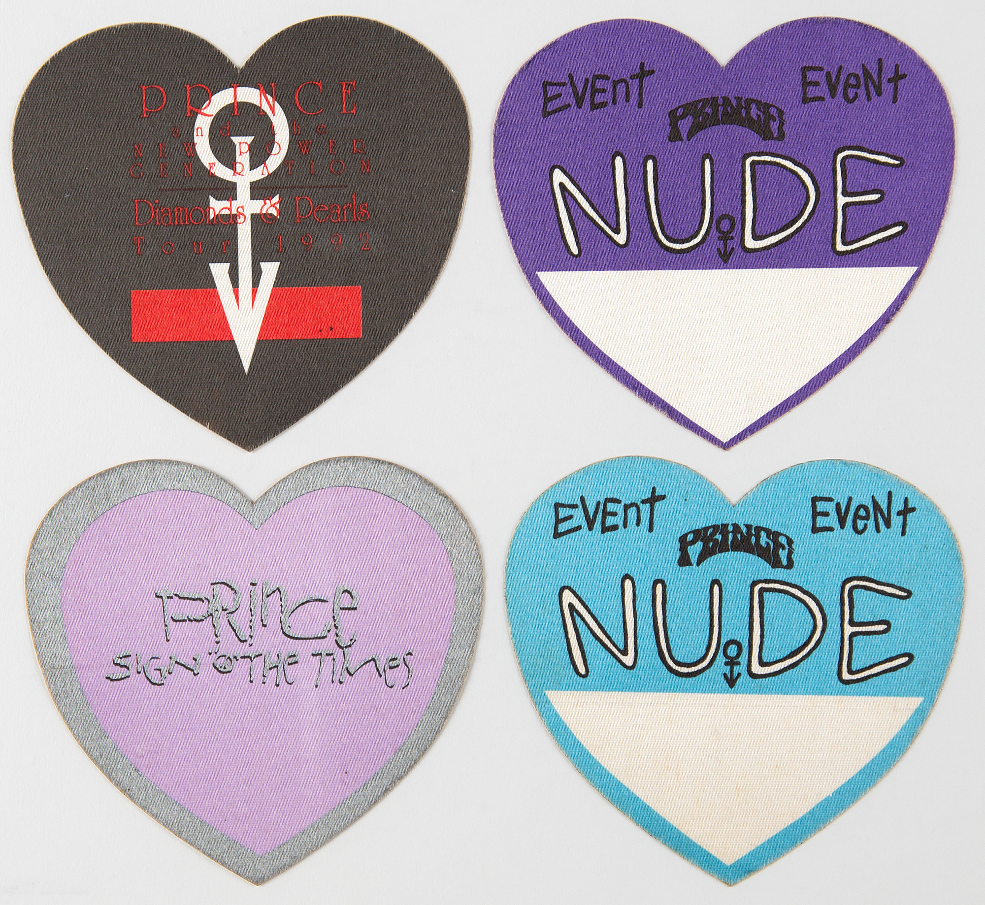Four unused cloth 4 x 3.75 heart-shaped backstage passes for Prince tours for the late 1980s and early 1990s, including: a pass for the 1987 Sign o' the Times Tour, two passes for the 1990 Nude Tour, and a pass for the 1992 Diamonds & Pearls Tour. In overall fine condition.