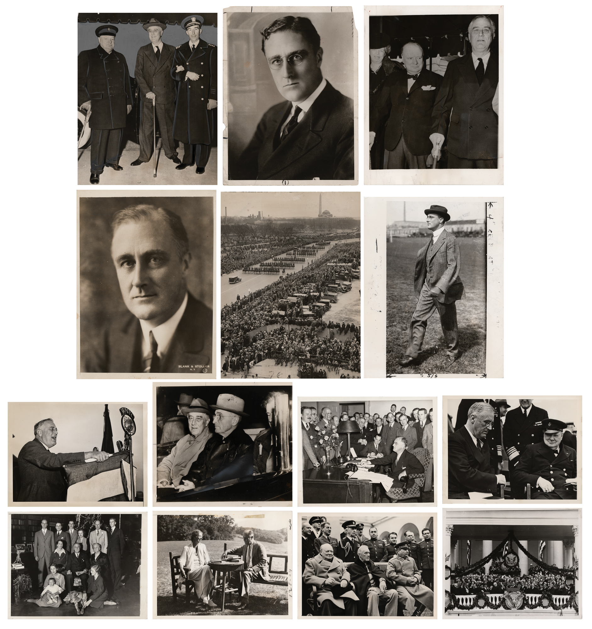 Archive of 50 original vintage press photographs of Franklin D. Roosevelt, ranging in size from 6 x 8 to 8 x 10, highlighted by several of him with Winston Churchill, plus a pair of early portraits taken circa 1916–1917, one showing him standing prior to his bout with polio. Another highlight is a photo of the 'Big Three'—FDR, Churchill, and Joseph Stalin—meeting at the historic Yalta Conference, taken in 1945 and printed in 1958. Other notable subjects include FDR with his family, including First Lady Eleanor Roosevelt; President Roosevelt giving addresses, signing bills into law, and meeting with dignitaries; FDR with Vice President Harry S. Truman; the inaugural parade; various portraits; and other interesting subjects, largely from his presidency. Most bear affixed press captions on the reverse. In overall very good to fine condition.