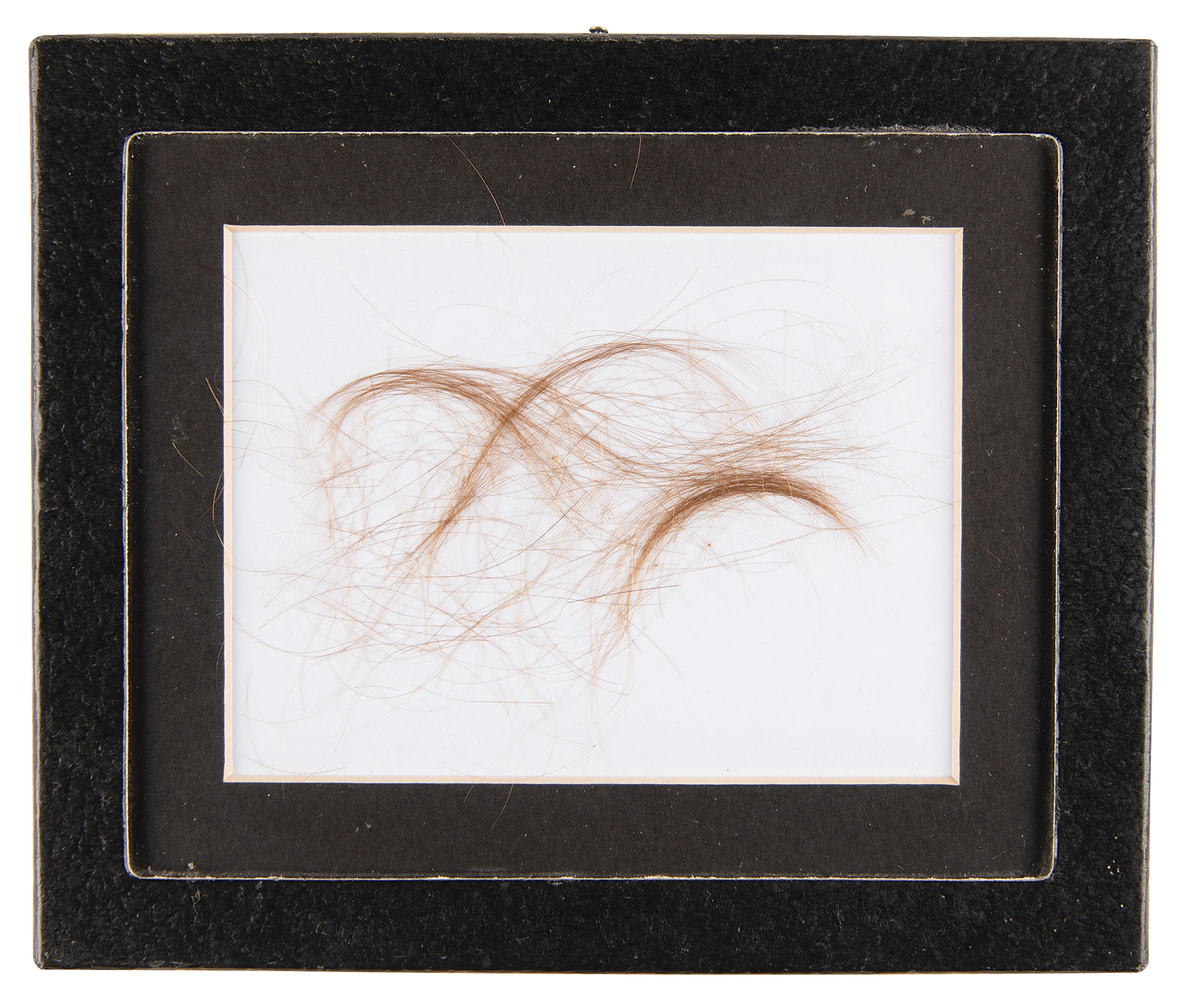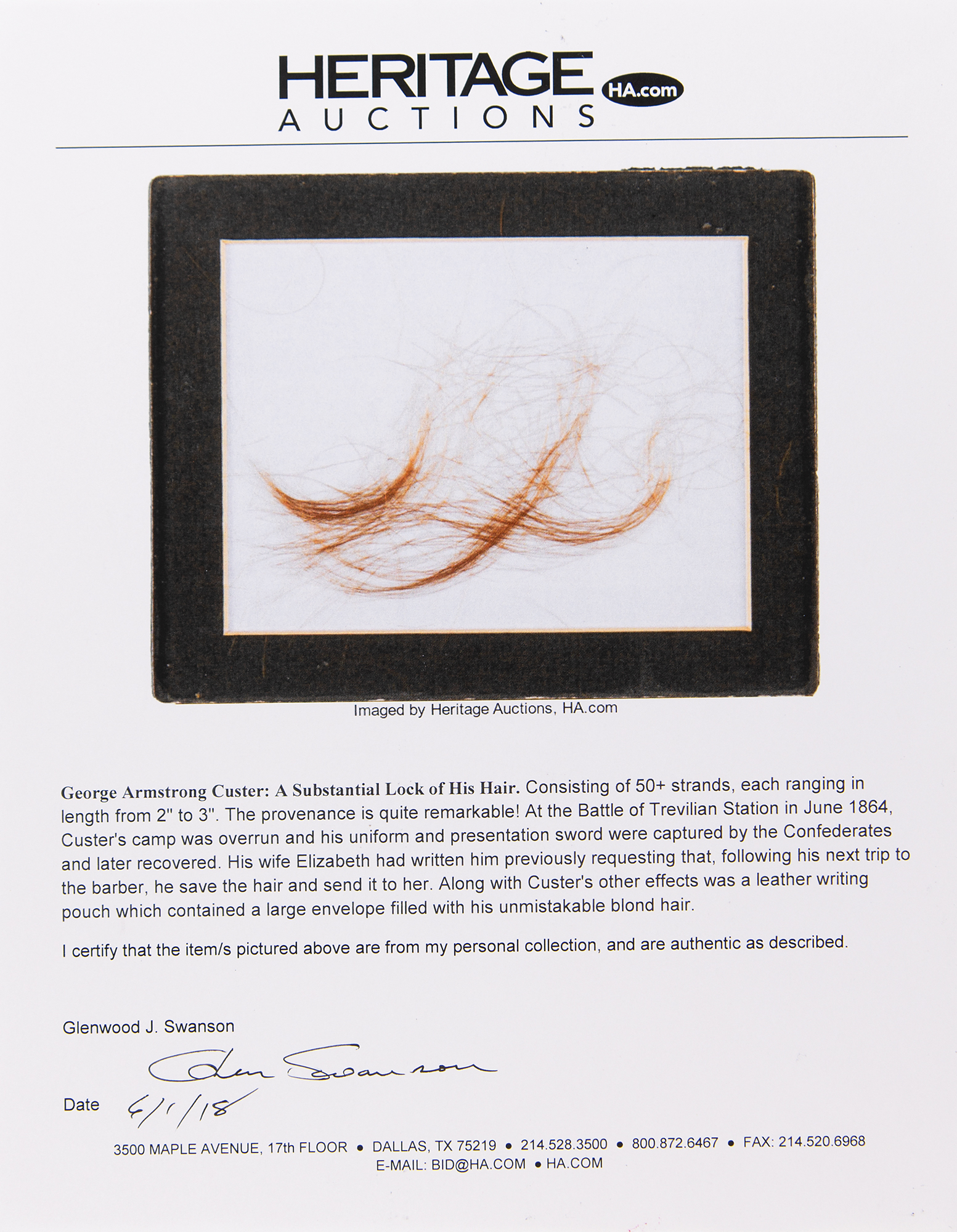 Remarkable lock of 50+ strands of George Armstrong Custer's hair, ranging in length from about 2˝ to 3˝ per strand, displayed in a 6.25˝ x 5.25˝ Riker box. The hair originates from the collection of Glenwood Swanson, sold by Heritage Auctions on June 9, 2018. Swanson was involved in expertizing an ensemble which included Custer's Tiffany cavalry saber, uniform, and writing pouch; when those items were sold, he was permitted to take a small sample of the hair found in the writing pouch. Accompanied by Swanson's signed provenance statement, in part: "At the Battle of Trevilian Station in June 1864 Custer's camp was overrun and his uniform and presentation sword were captured by the Confederates and later recovered. His wife Elizabeth had written him previously requesting that, following his next trip to the barber, he save the hair and send it to her. Along with Custer's other effects was a leather writing pouch which contained a large envelope filled with his unmistakable blond hair."