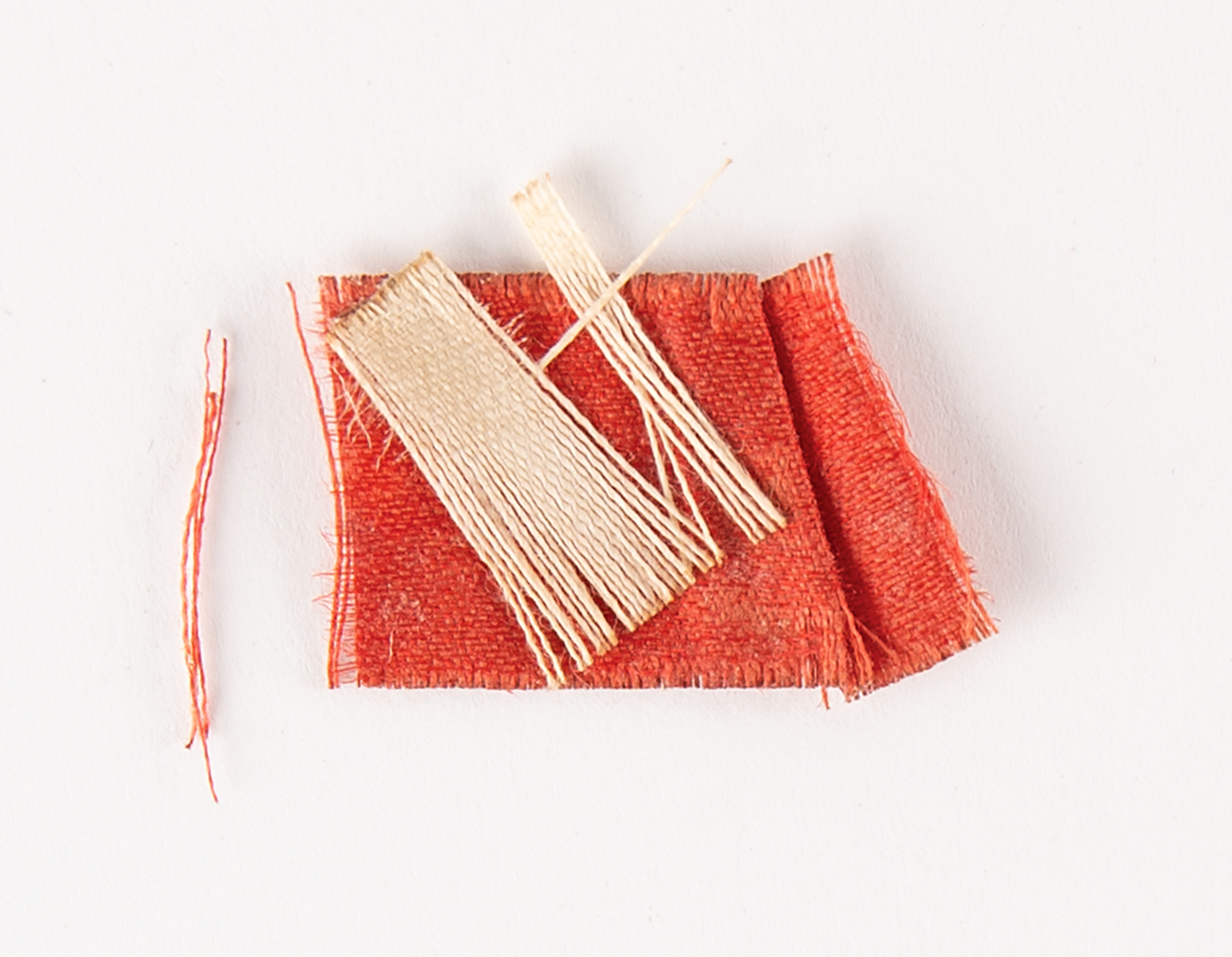 Red and white damask curtain relic from the Lincoln home in Springfield, Illinois, measuring approximately 1.25˝ x 1˝, displayed in a small Riker box. Includes a certificate of authenticity from The Historical Shop, in part: "The fabric remnant in this display originated from a larger piece wrapped in the brown paper shown below purchased by Harry Wilton of Springfield, Illinois from the Lincolns before they left for Washington, DC. The damask remnant once was part of a drape that was in the Lincoln parlor in Springfield, Illinois. Wilton was the United States Marshall in Springfield and a friend of the Lincolns. Other items that Wilton purchased from the Lincolns later were sold to the Henry Ford Museum by his relatives." In fine condition.