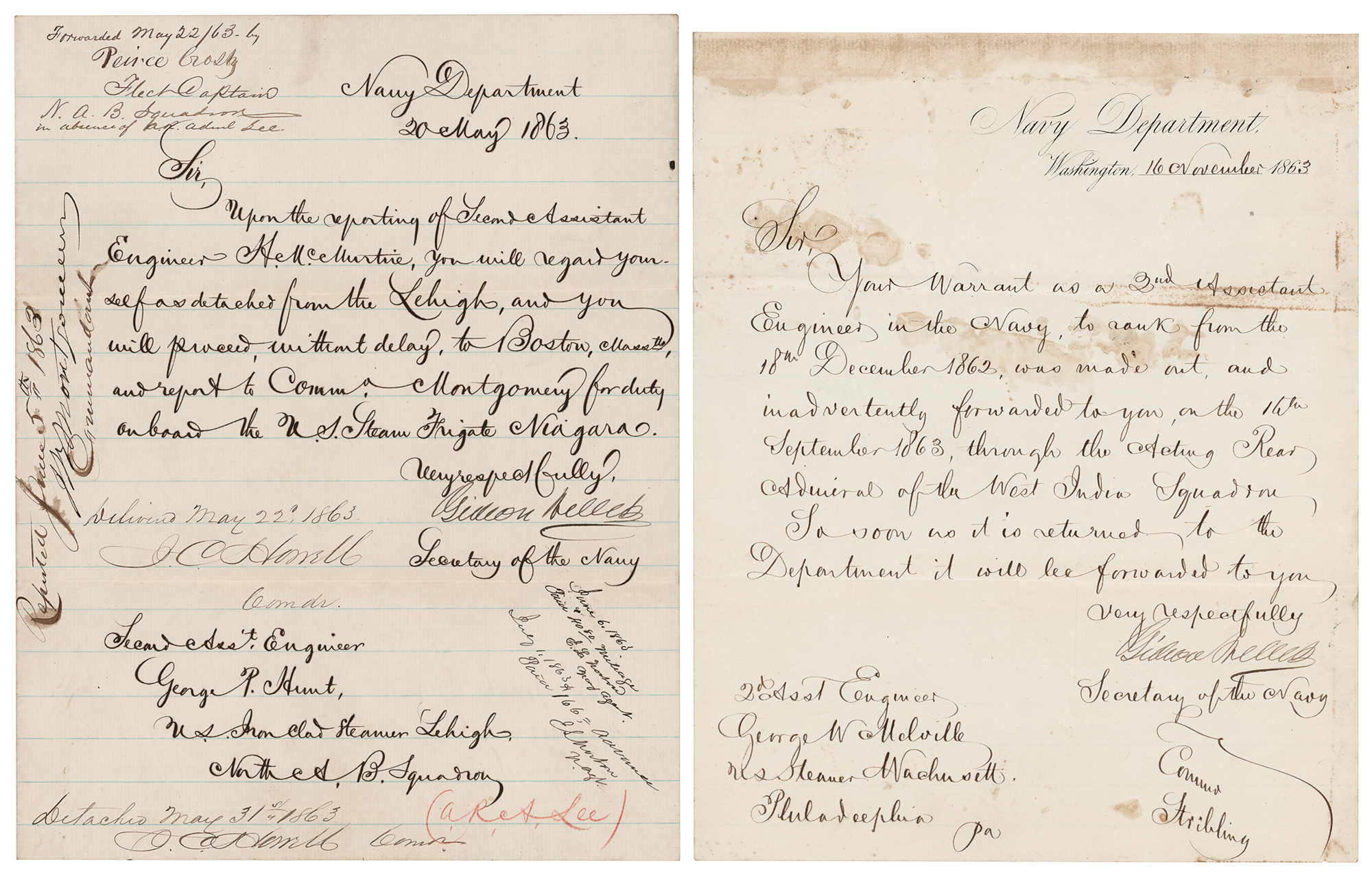 Two Civil War-dated LSs from Gideon Welles as Secretary of the Navy, both one page, 7.75 x 10, both dated to 1863. The earlier letter, May 20, 1863, sent to First Assistant Engineer George P. Hunt of the ironclad steamer Lehigh, in part: “You will regard yourself detached from the Lehigh, and…report to Commd. Montgomery for duty onboard the U.S. Steam Frigate Niagara.” This letter is also signed by future admirals John B. Montgomery, John C. Howell (twice), and Peirce Crosby. The second letter, November 16, 1863, addressed to future admiral and Arctic hero George Melville, informing him that his warrant as 2nd Assistant Engineer was inadvertently forwarded to him “through the Acting Rear Admiral of the West India Squadron. So soon as it is returned to the Department it will be forwarded to you.” In overall very good to fine condition, with scattered staining to the November letter.