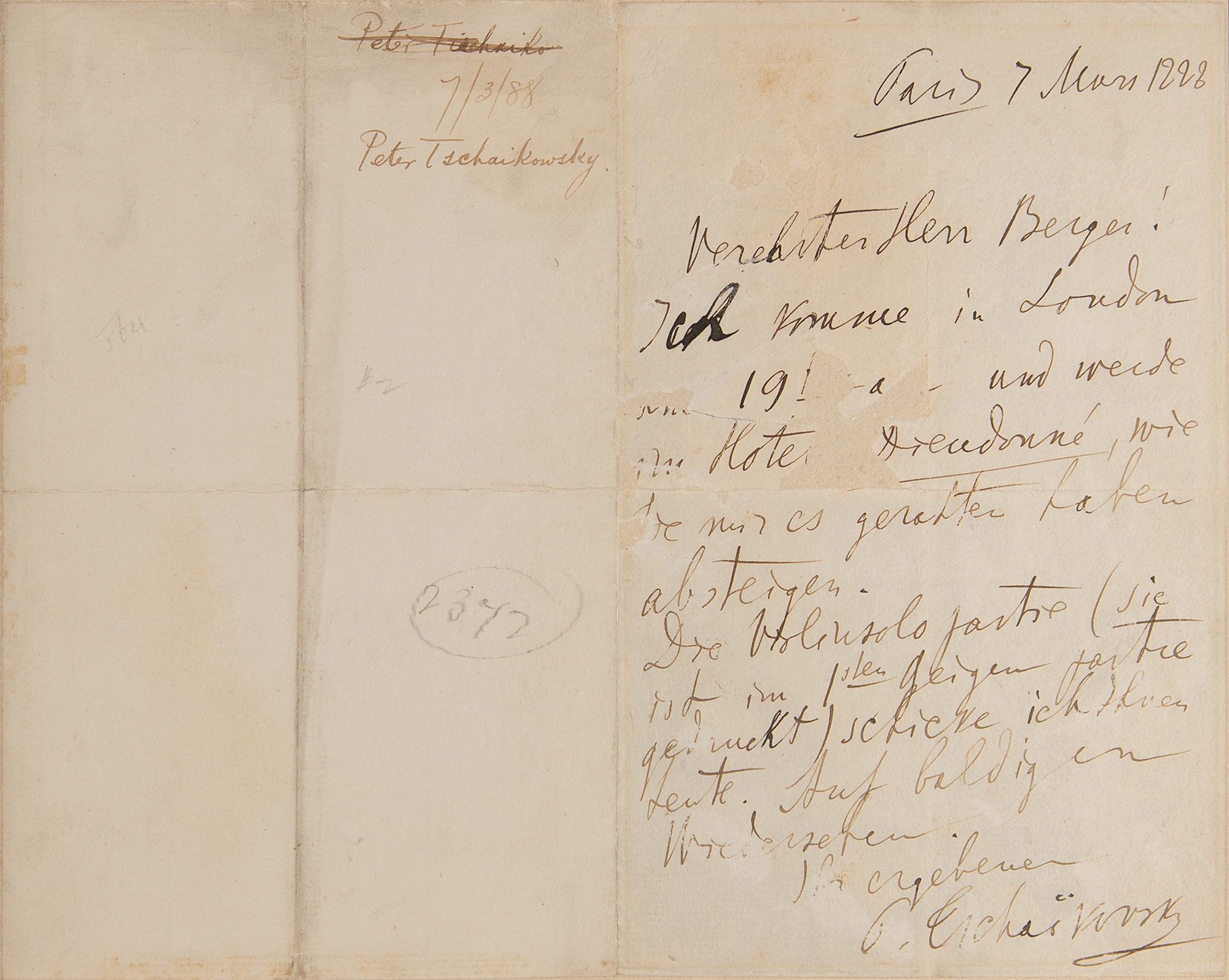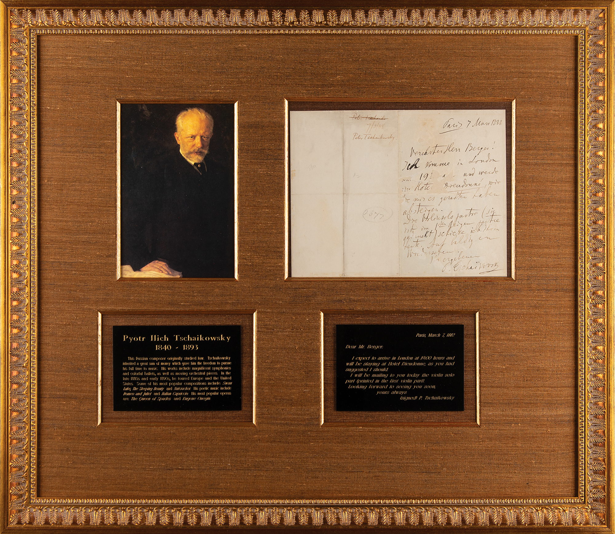 ALS in German, signed “P. Tschaikowsky,” one page, 5 x 7.75, March 7, 1888. Handwritten letter to "Herr Berger," the pianist and composer Francesco Berger, in full (translated): "I expect to arrive in London at 19:00 hours and will be staying at Hotel Dieudonne, as you had suggested I should. I will be mailing to you today the violin solo part (printed in the 1st violin part). Looking forward to seeing you soon." Impressively cloth-matted and framed with a portrait, biographical plaque, and translation to an overall size of 28.25 x 24.75. In fine condition.