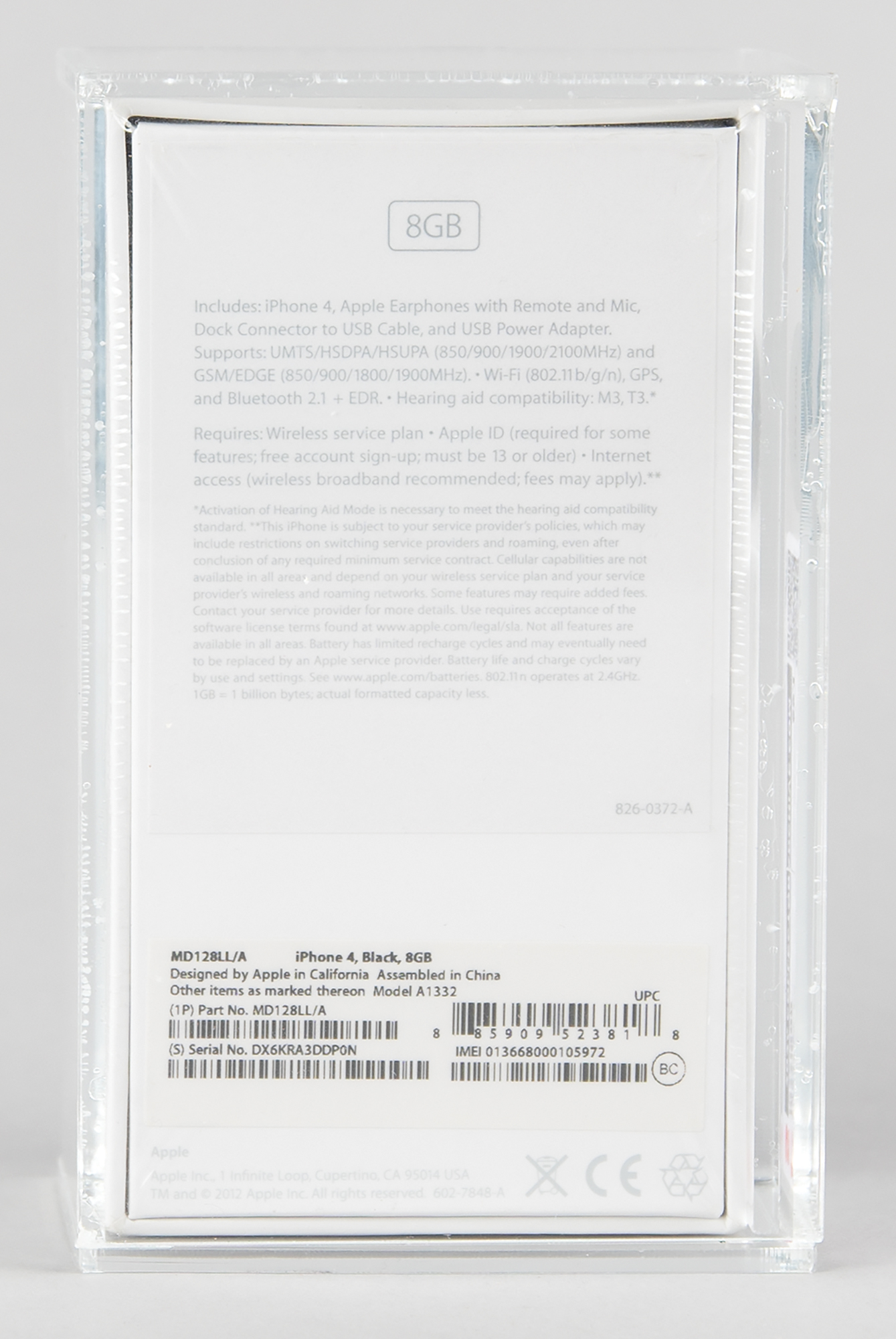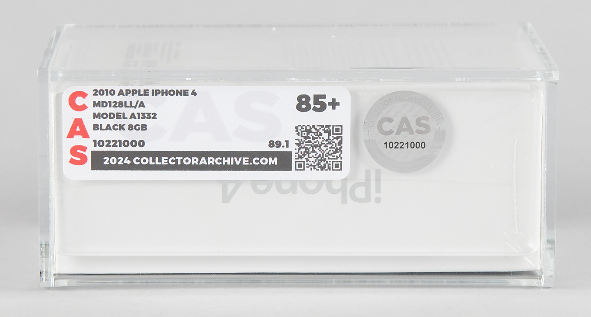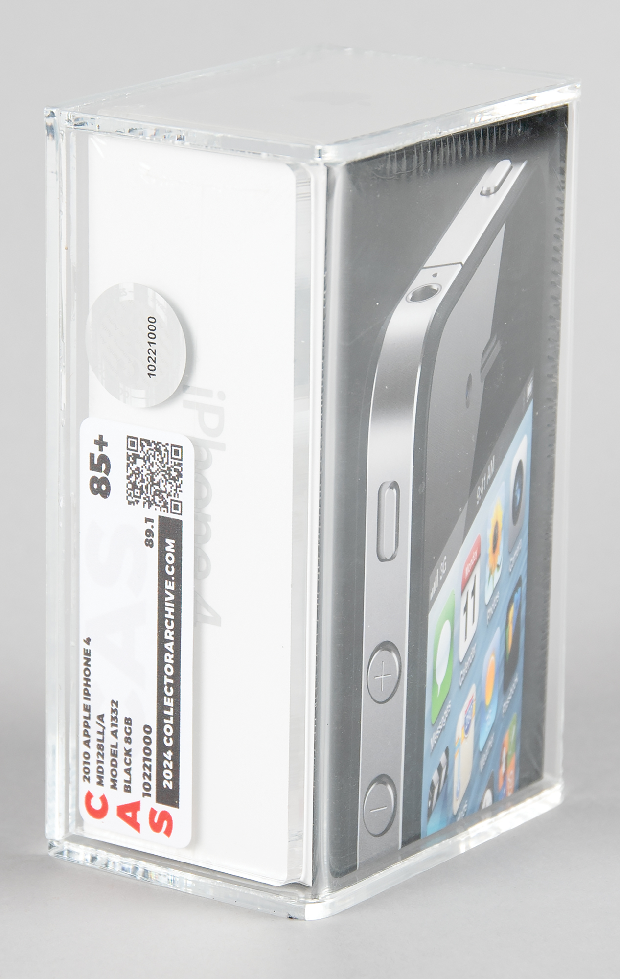 Unopened original black Apple iPhone 4, Part No. MD128LL/A (8GB), Serial No. DX6KRA3DDP0N. The front of the box shows an image of the device’s front screen and upper left shoulder, and the back features the device’s specifications. In brand new, factory-sealed condition. Encapsulated and graded by CAS with a master grade of “85+” and a real grade of “89.1.”