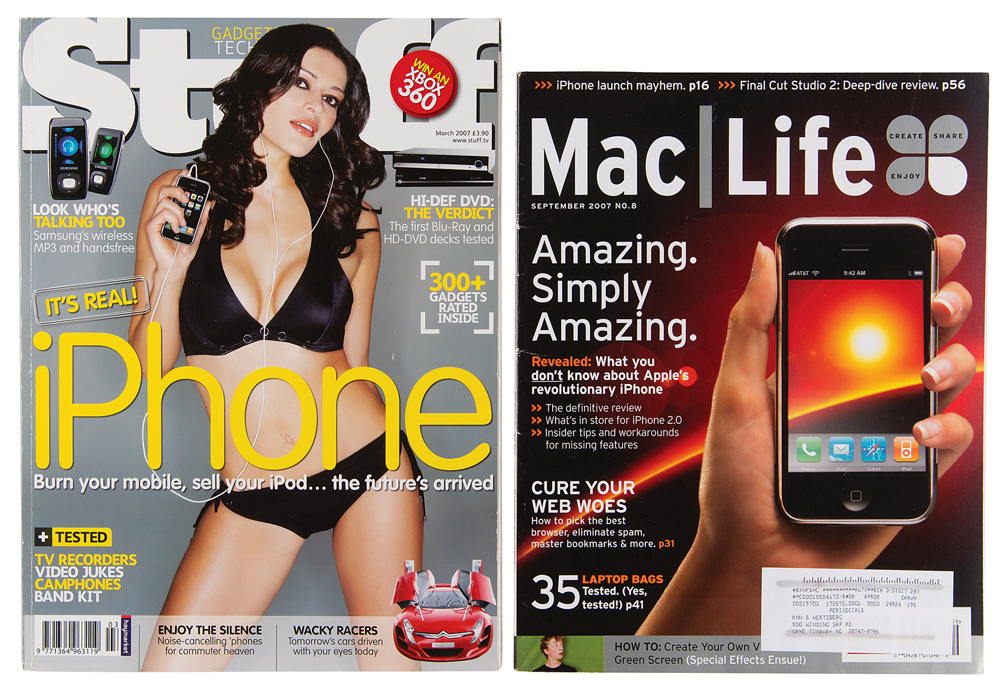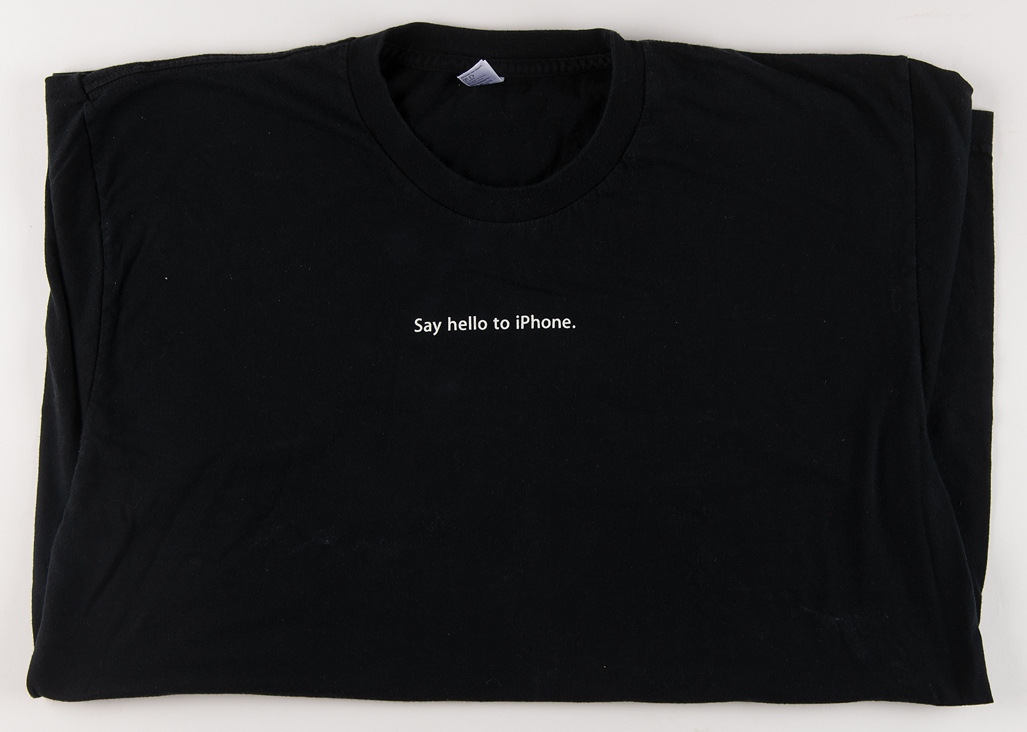 Collection of material related to the release of the original iPhone, including four accessories sealed in their original packaging: an iPhone Dock (MA816B/A); an iPhone Stereo Headset (MA814LL/A); an iPhone Bluetooth Travel Cable (MA820G/A); and an iPhone TTY Adapter (MA854G/A). Also includes a black short-sleeve T-shirt by American Apparel, as worn by Apple store employees, size large, with simple white text, "Say hello to iPhone"; an issue of Stuff from March 2007 ("It's real! iPhone: Burn your mobile, sell your iPod… the future's arrived"); and an issue of Mac Life from September 2007 ("Amazing. Simply Amazing. Revealed: What you don't know about Apple's revolutionary iPhone"). In overall fine condition.