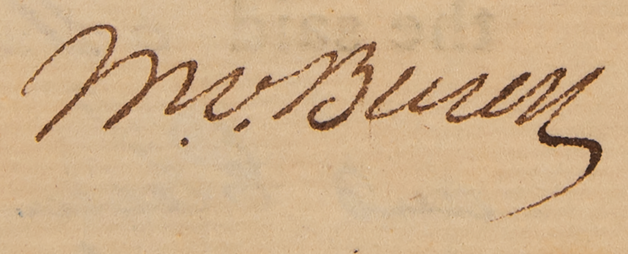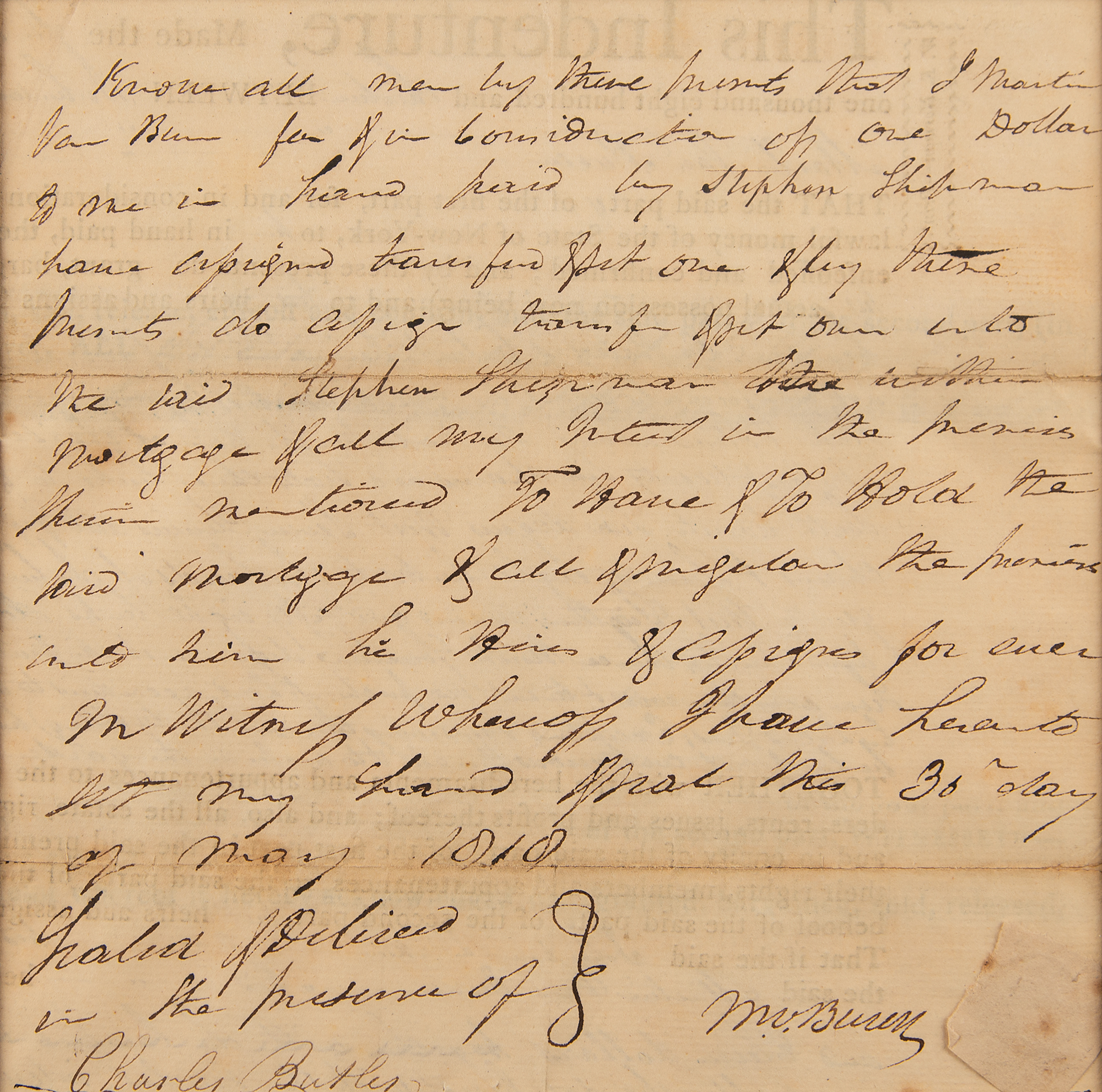 Manuscript DS as Attorney General of New York, signed “M. V. Buren,” one page, 7.5 x 7.5, May 30, 1818. Mortgage assumption document, in part: “Know all men by these presents that I Martin Van Buren for in consideration of one Dollar to me hand paid by Stephen Shipman have assigned transferred & set…the within mortgage & all my Interest in the monier therein mentioned.” Signed at the conclusion by Martin Van Buren. Double-matted and framed with an engraved portrait to an overall size of 19 x 14.5. In very good to fine condition, with intersecting folds and light creasing.