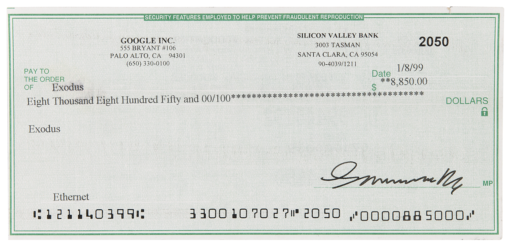 Google, Inc. business check, 6 x 2.75, filled out and signed by Page, "Lawrence Page," payable to Exodus for $8,850, January 8, 1999, with the memo: "Ethernet." Google's address is given as "555 Bryant #106, Palo Alto, CA 94301." In fine condition.