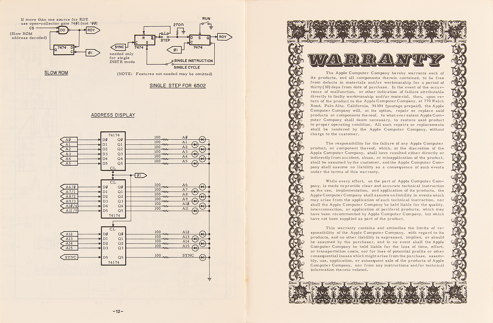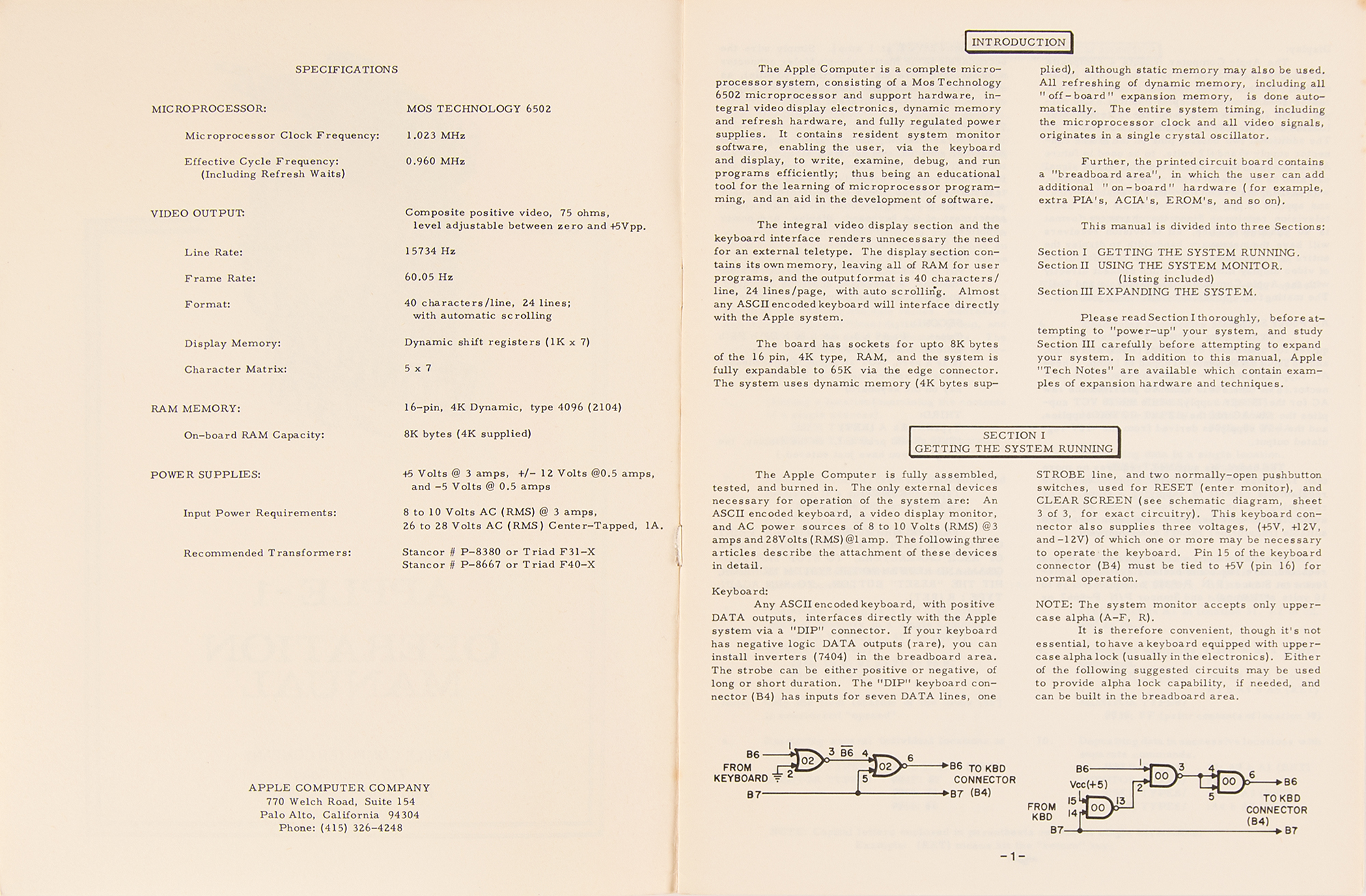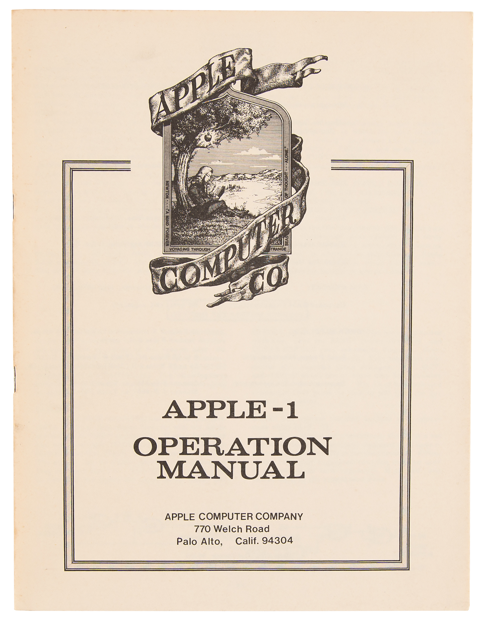 Early 1990s Apple-approved reproduction of the original vintage Apple-1 Operation Manual issued by the Apple Computer Company circa 1976, 12 pages, 8.5 x 11, printed exclusively for a German developers conference in Frankfurt, Germany, circa 1992. This manual was printed in a limited edition after Uwe Falk, the German head of Apple Developer Support, requested and received permission from Apple headquarters to reproduce the manuals with the same layout and matching paper quality as the originals. These ‘original’ manuals were offered at an Apple-1 showcase, but only a handful of attendees took one as a souvenir. Like the original, this facsimile features Apple's original logo on the front cover, designed by third Apple co-founder Ron Wayne and showing Isaac Newton thoughtfully seated beneath a tree, with a shining apple dangling overhead. The Operation Manual contains an impressive fold-out schematic of the Apple-1 computer and features information on getting the system up and running, using the system monitor, and expanding the Apple system. Three pages are headed "6502 Hex Monitor Listing" and detail an innovative memory program devised by Steve Wozniak that is commonly called the 'Woz Monitor.' In fine condition, with some light toning to edges.