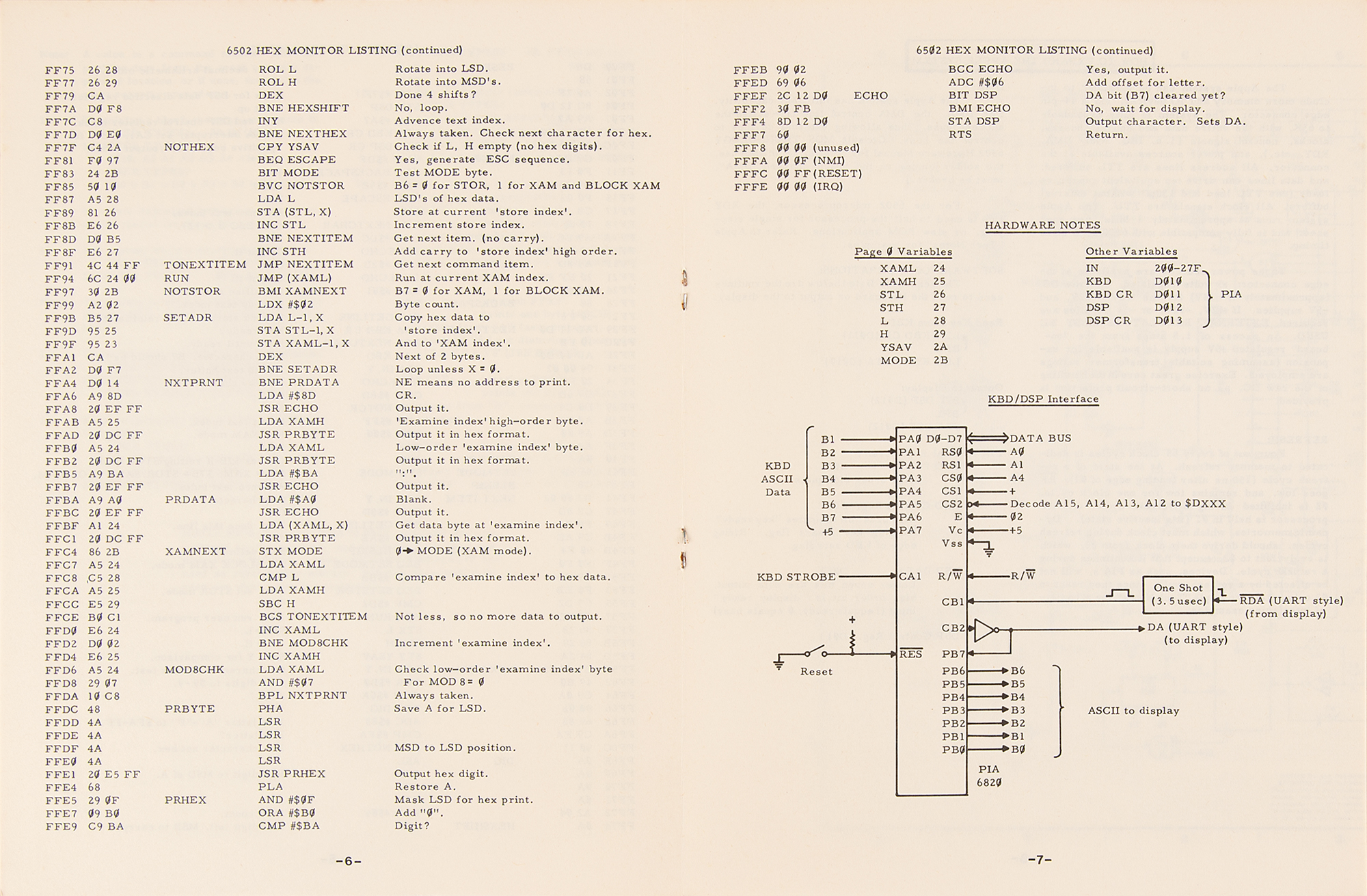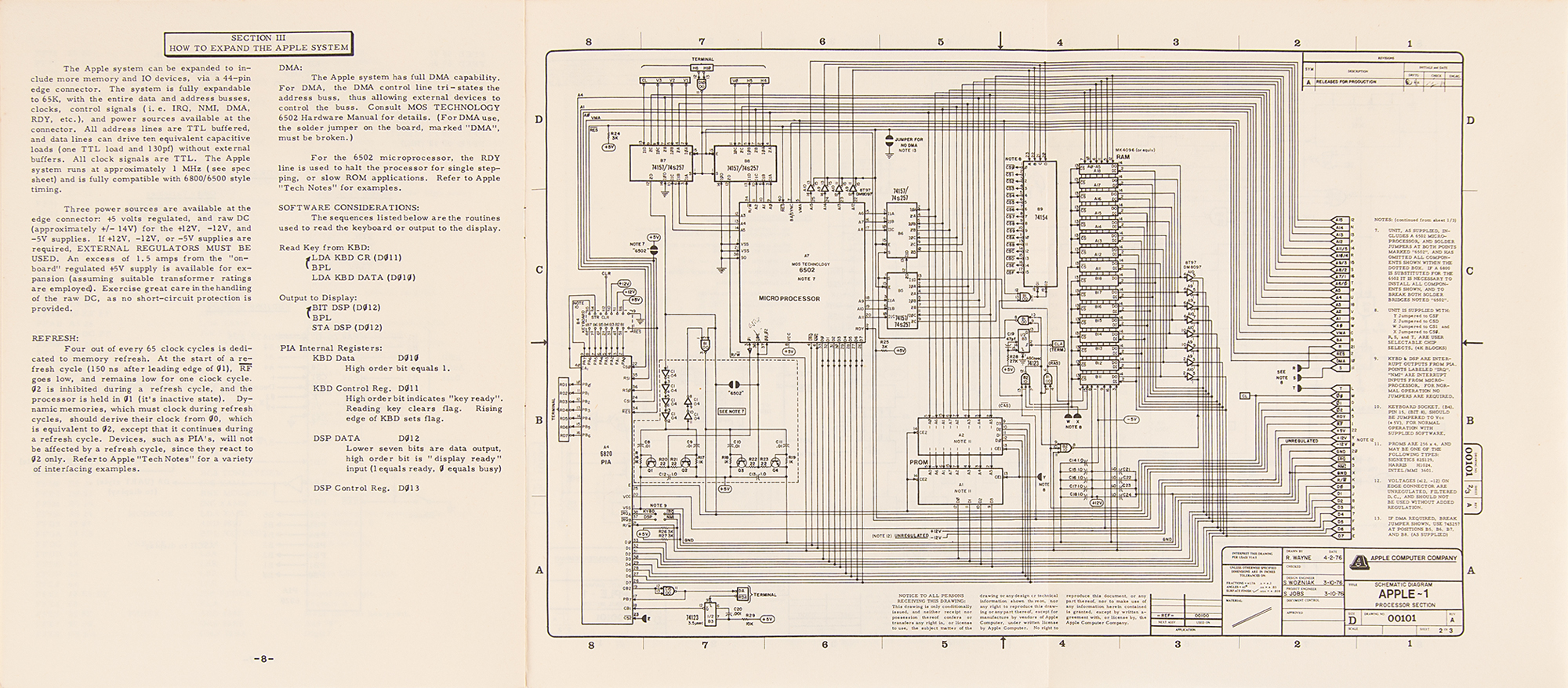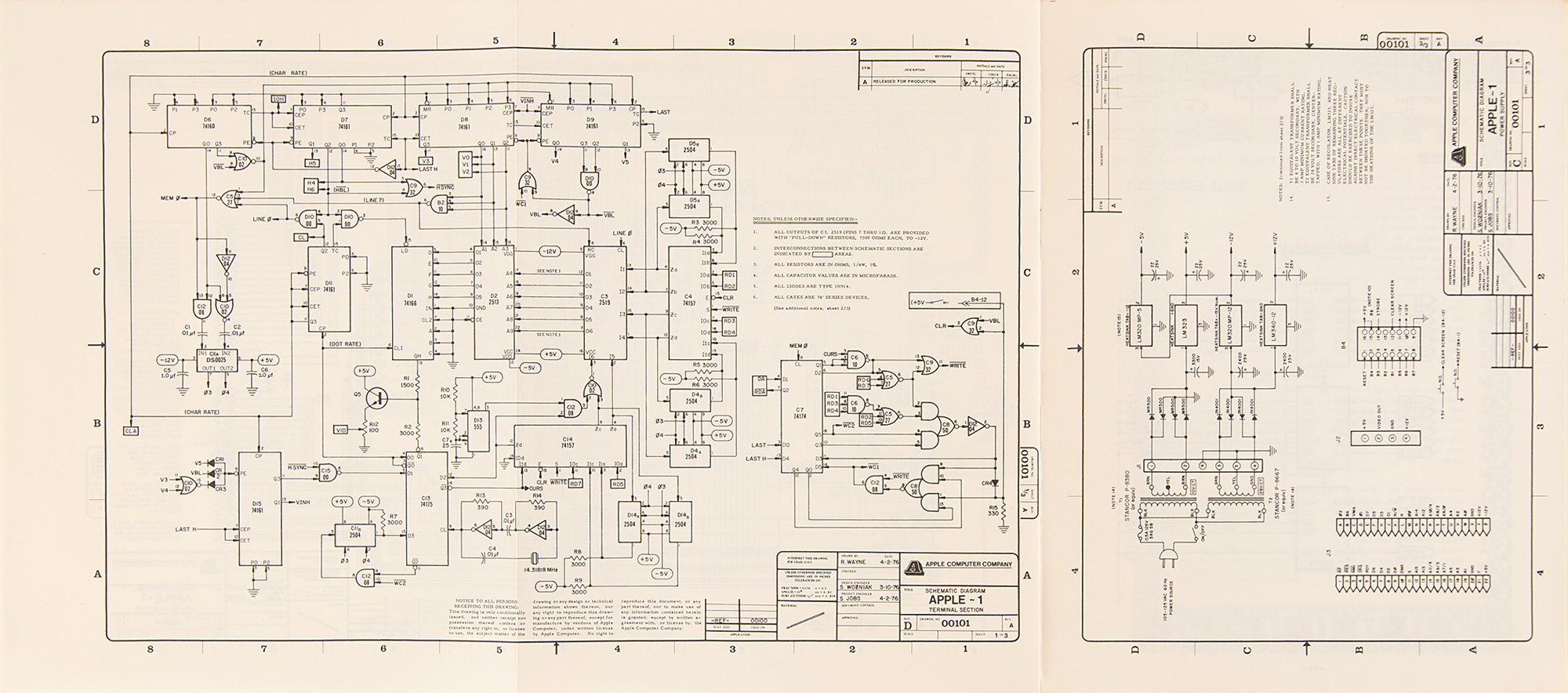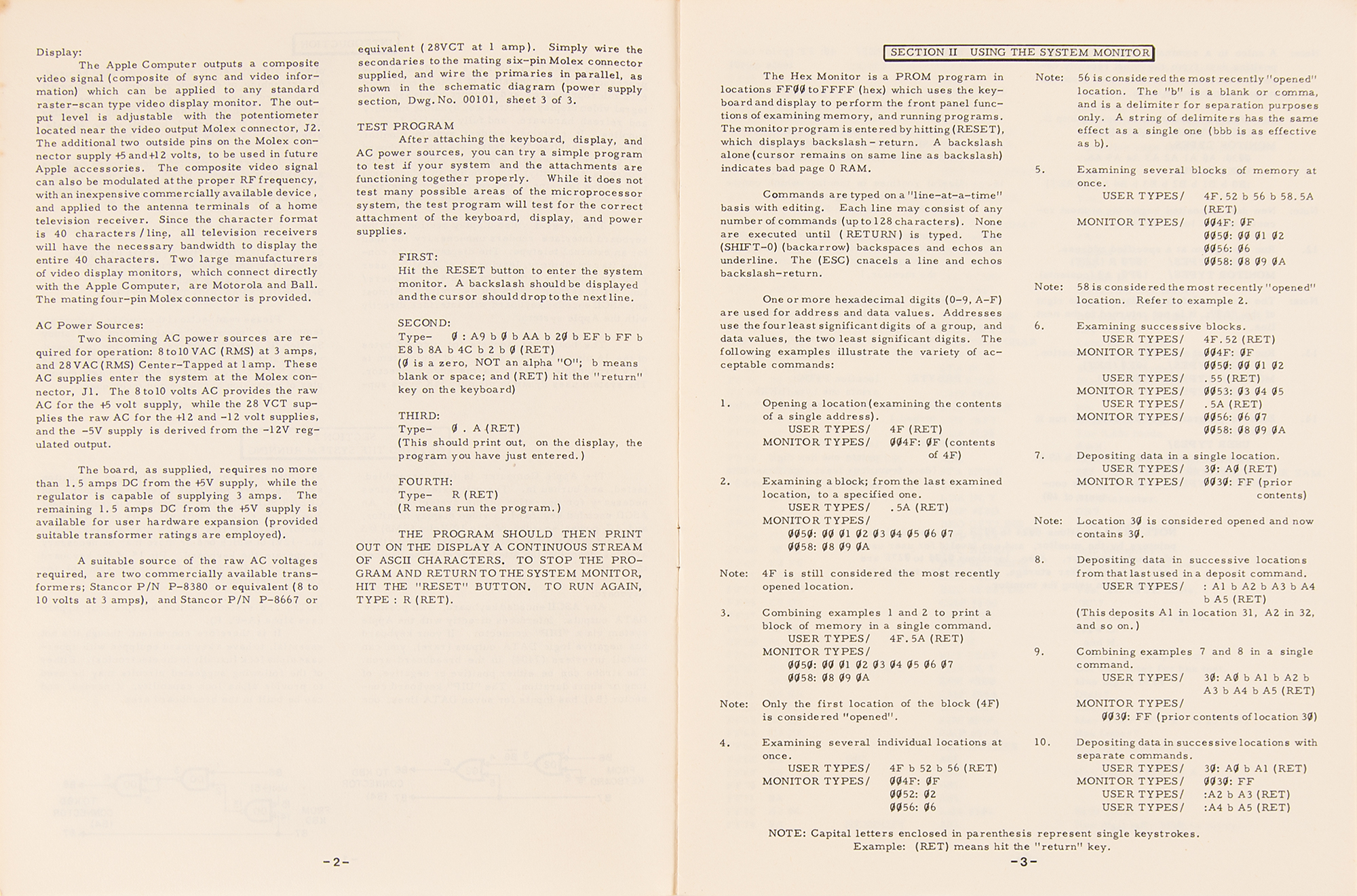 Early 1990s Apple-approved reproduction of the original vintage Apple-1 Operation Manual issued by the Apple Computer Company circa 1976, 12 pages, 8.5 x 11, printed exclusively for a German developers conference in Frankfurt, Germany, circa 1992. This manual was printed in a limited edition after Uwe Falk, the German head of Apple Developer Support, requested and received permission from Apple headquarters to reproduce the manuals with the same layout and matching paper quality as the originals. These ‘original’ manuals were offered at an Apple-1 showcase, but only a handful of attendees took one as a souvenir. Like the original, this facsimile features Apple's original logo on the front cover, designed by third Apple co-founder Ron Wayne and showing Isaac Newton thoughtfully seated beneath a tree, with a shining apple dangling overhead. The Operation Manual contains an impressive fold-out schematic of the Apple-1 computer and features information on getting the system up and running, using the system monitor, and expanding the Apple system. Three pages are headed "6502 Hex Monitor Listing" and detail an innovative memory program devised by Steve Wozniak that is commonly called the 'Woz Monitor.' In fine condition, with some light toning to edges.