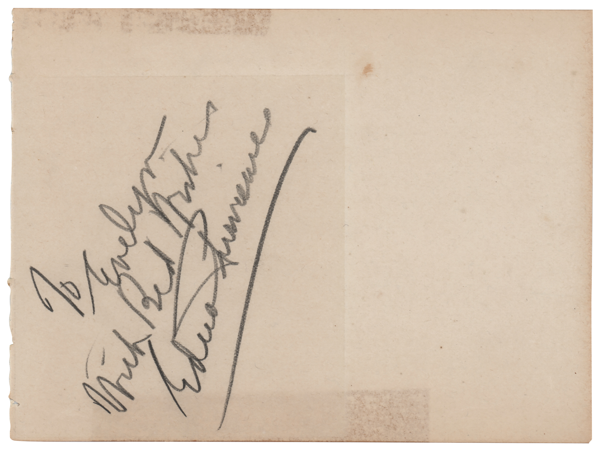 Vintage ink signature, "To my little friend, Evelyn, with my very best wishes, Charlie Chaplin,” on an off-white 6.75 x 4 album page. In fine condition, with an old tape stain the bottom edge. Accompanied by a vintage pencil signature of actress Edna Purviance, who was the leading lady in many of Charlie Chaplin's early films, and, in a span of eight years, appeared in over 30 films with him.