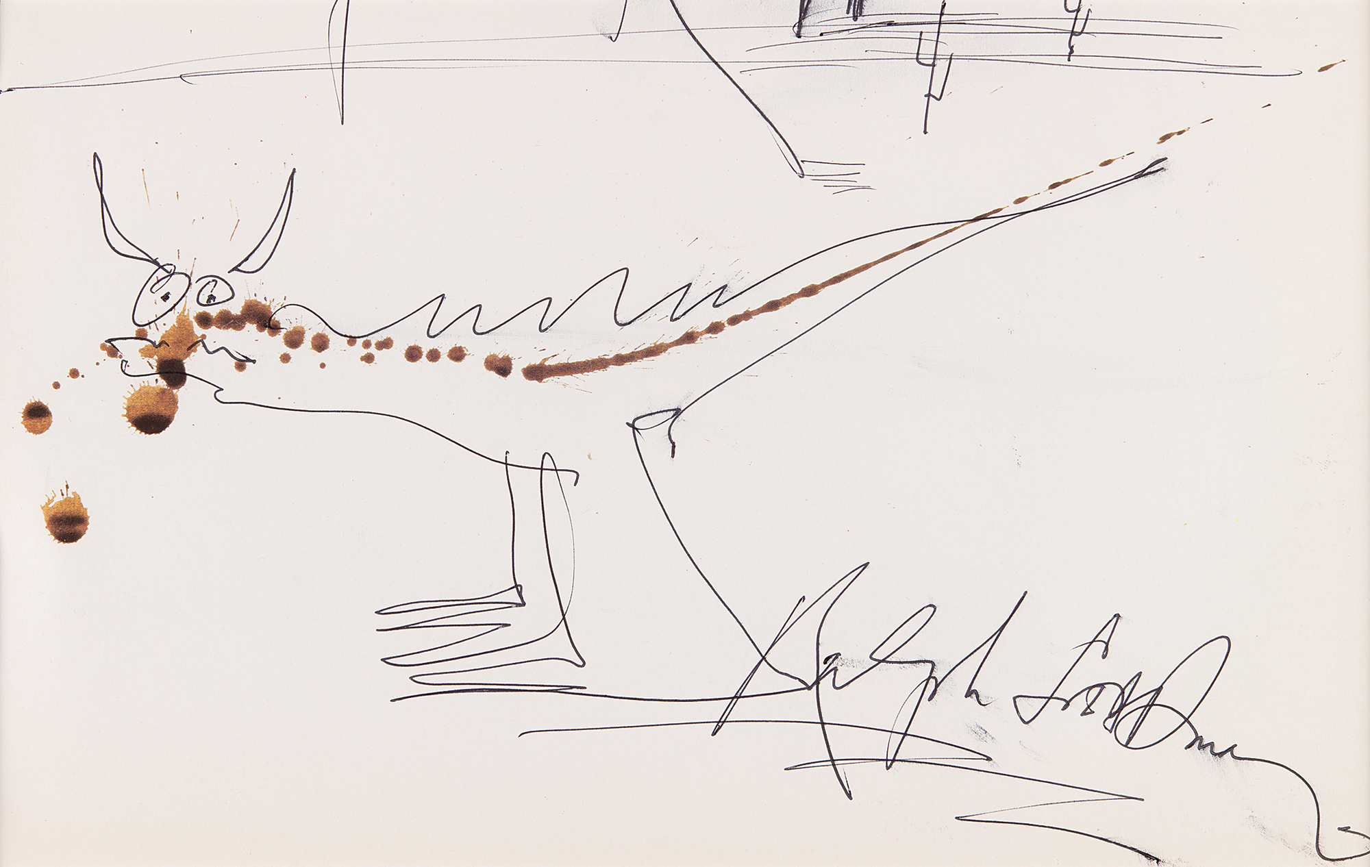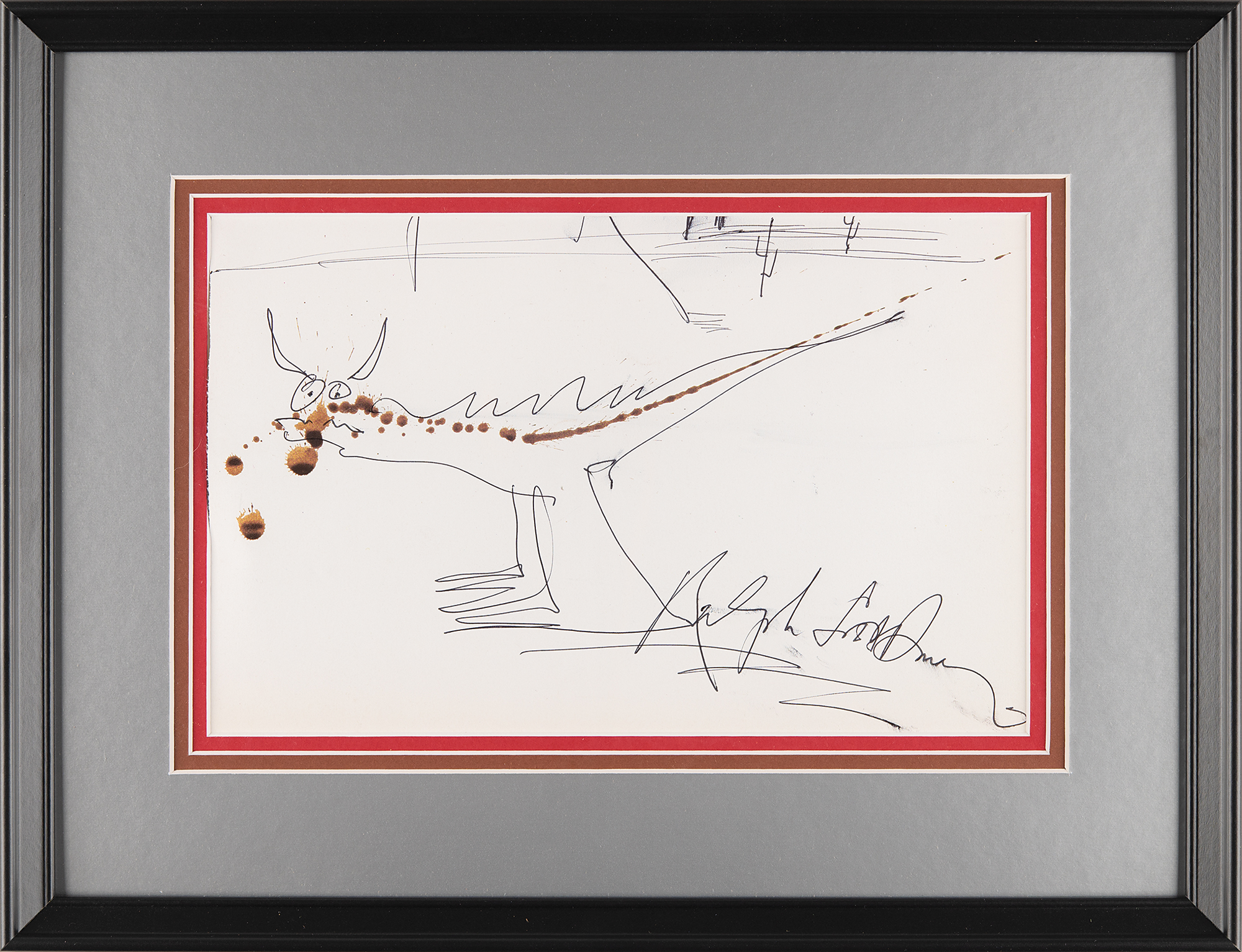 Original artwork by Ralph Steadman of a lizard or dinosaur in the desert, accomplished in ink with watercolor drips on an off-white 11.25 x 7.25 sheet, signed below, “Ralph Steadman.” Triple-matted and framed to an overall size of 17 x 13. In fine condition, with light brushing to the signature.