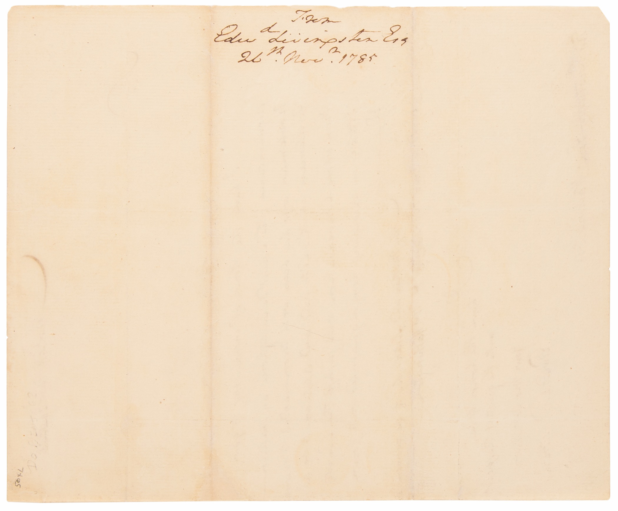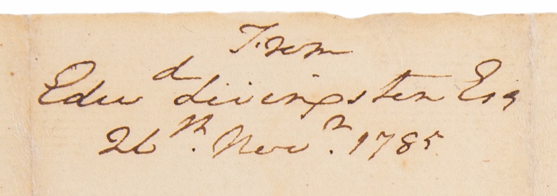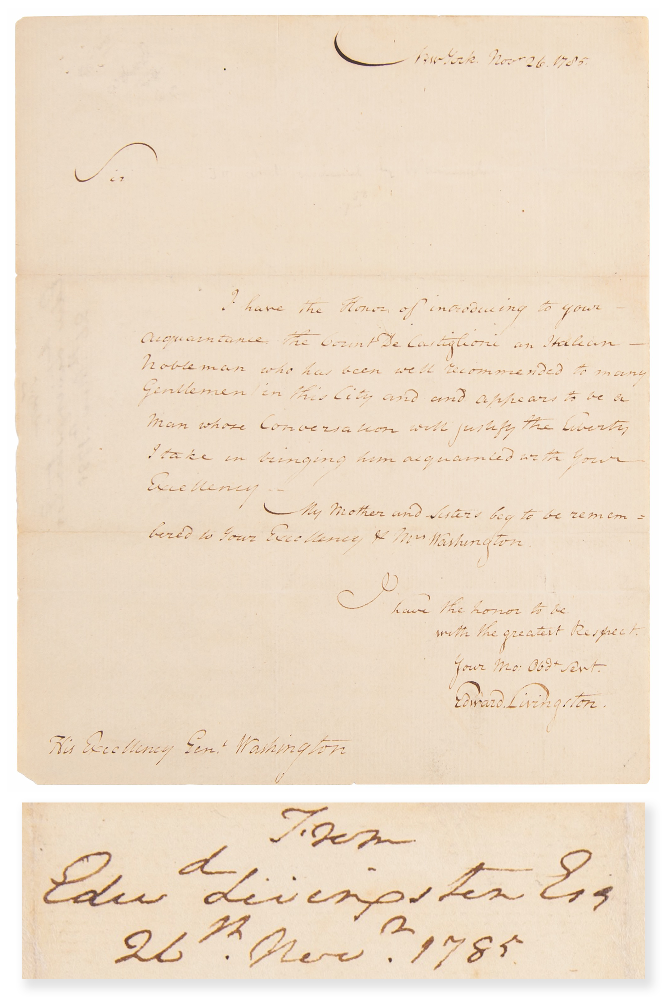 Ink docketing notation in the hand of George Washington, “From, Edw’d Livingston, Esq., 26th Nov’r 1785,” penned on the reverse of an ALS from Edward Livingston, one page, 7.25 x 9, November 26, 1785. Addressed from New York and sent to “His Excellency Gen’l Washington, Livingston’s handwritten letter reads: “I have the honor of introducing to your acquaintance the Count De Castiglioni, an Italian Nobleman who has been well recommended to many Gentlemen in this City and [and] appears to be a man whose Conversation will justify the liberty I take in bringing him acquainted with your Excellency. My Mother and Sisters beg to be remembered to your Excellency & Mrs. Washington.” In fine condition.