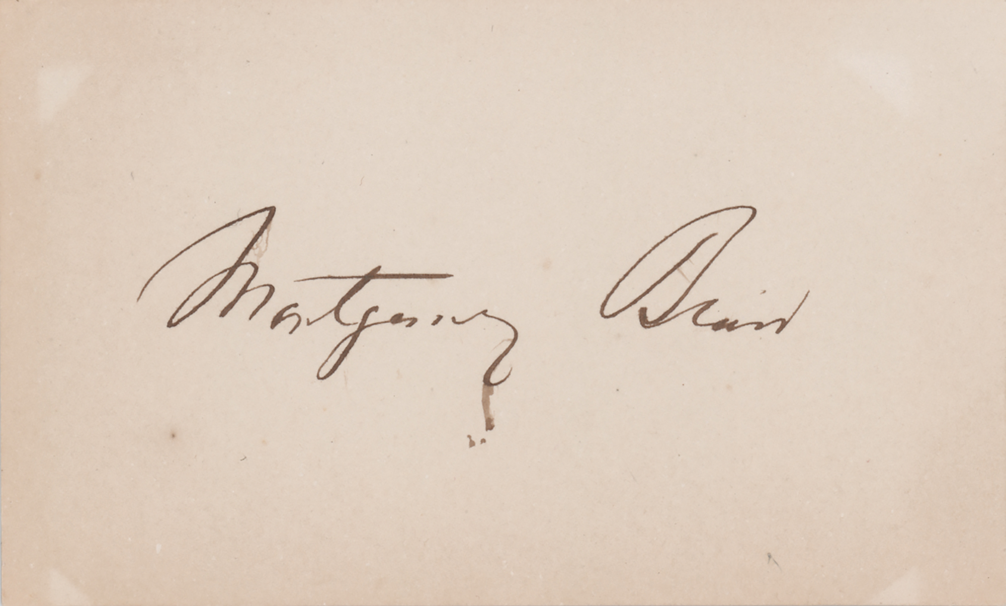 Politician and lawyer from Maryland (1813–1883) who served in Lincoln's cabinet as postmaster general during the Civil War. Ink signature, "Montgomery Blair,” on an off-white 4 x 2.5 card. In fine condition. Accompanied by an original cabinet card portrait of Blair by Brady's National Portrait Gallery.