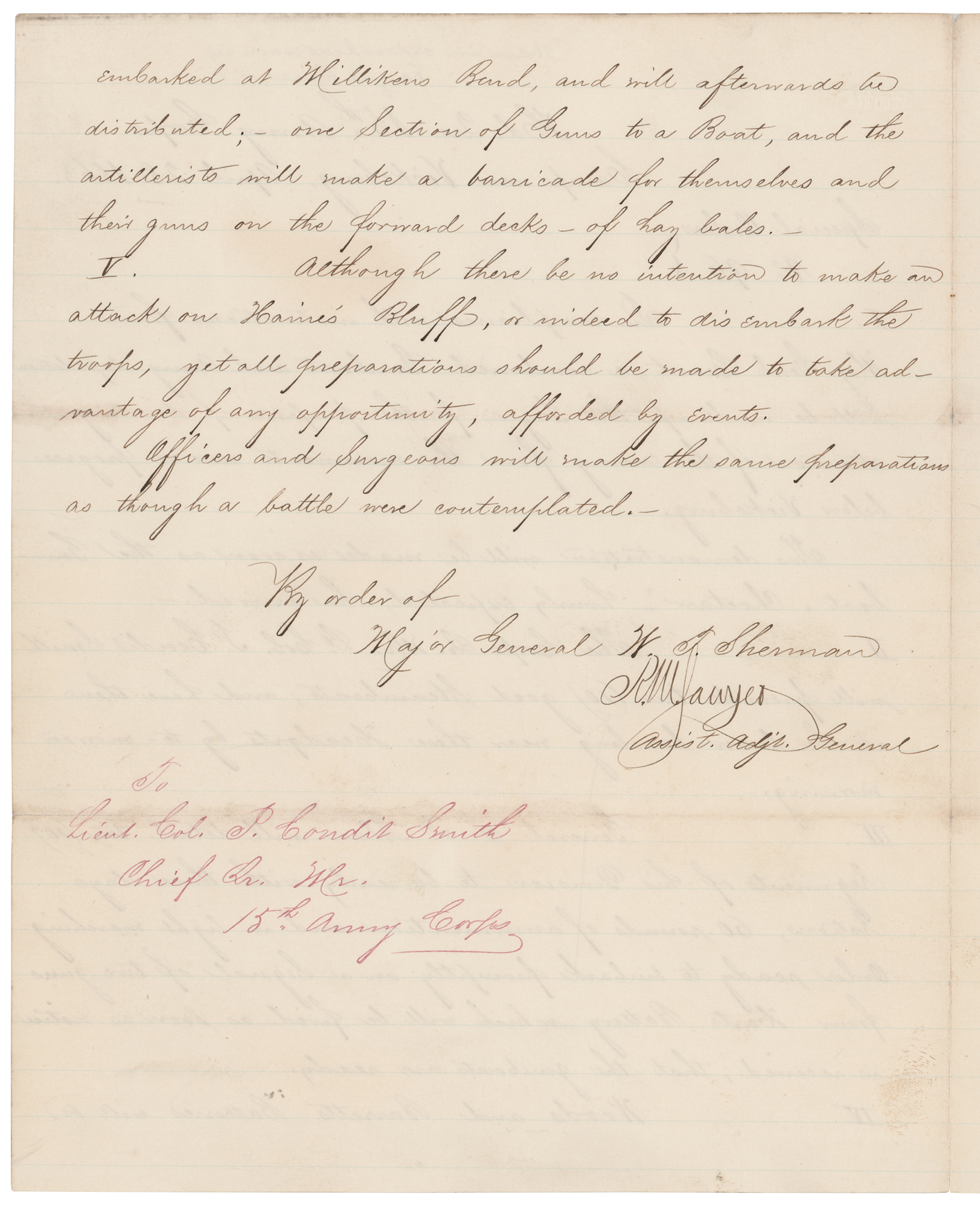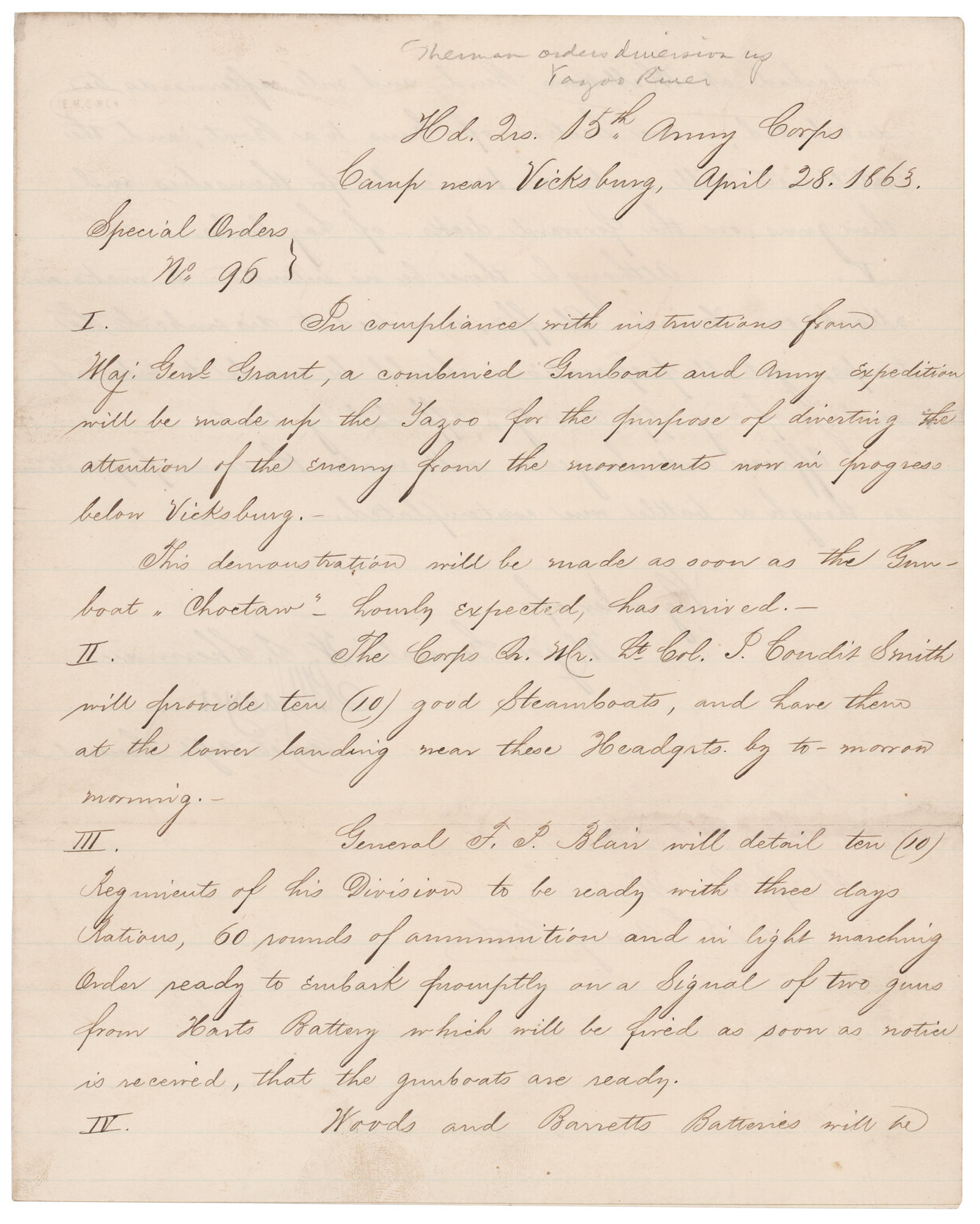 LS signed “R. M. Sawyer,” one page both sides, 7.75 x 9.75, April 28, 1863. "Special Orders No. 96," issued under command of General William T. Sherman at "Hd. Qrs. 15th Army Corps, Camp near Vicksburg," in part: "In compliance with instructions from Maj. Gen'l Grant, a combined Gunboat and Army Expedition will be made up the Yazoo for the purpose of diverting the attention of the enemy from the movements now in progress below Vicksburg. This demonstration will be made as soon as the Gunboat 'Choctaw,' hourly expected, has arrived…The Corps…will provide ten (10) good Steamboats, and have them at the lower landing near these Headqrts. by to-morrow morning…General F. P. Blair will detail ten (10) Regiments of his Division to be ready with three days Rations, 60 rounds of ammunition and in light marching order ready to embark…Woods and Barrett's Batteries will be embarked at Millikens Bend, and will afterwards be distributed;—one Section of Guns to a Boat, and the artillerists will make a barricade for themselves and their guns in the forward decks, of hay bales…Although there be no intention to make an attack on Haines' Bluff, or indeed to disembark the troops, yet all preparations should be male to take advantage of any opportunity, afforded by events." In fine condition.
