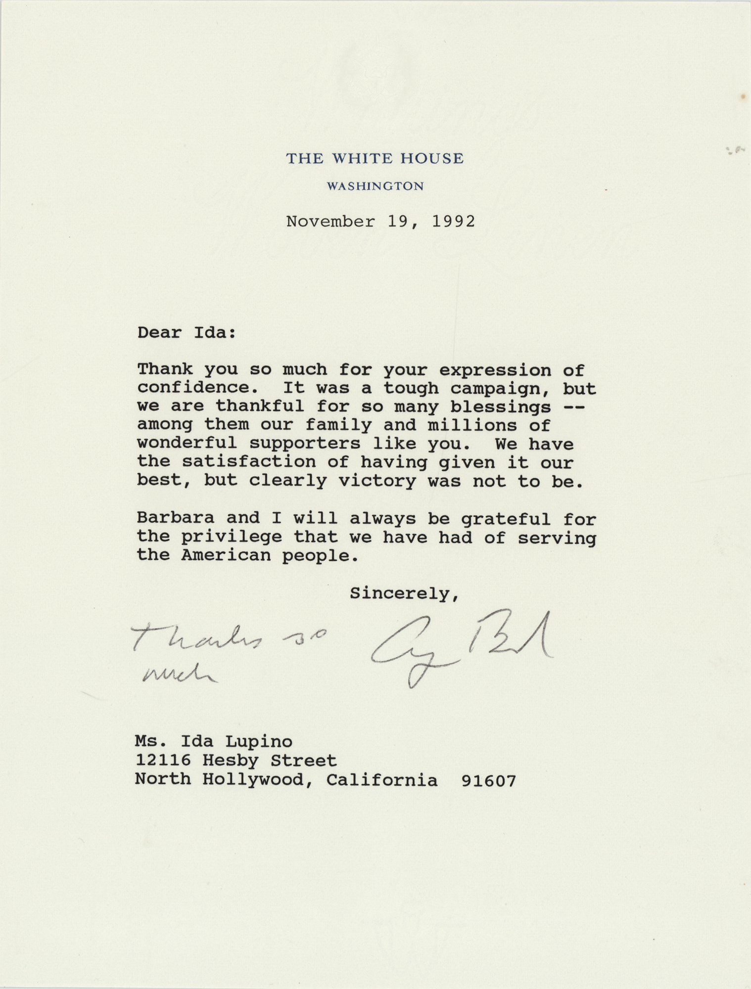 TLS as president, one page, 6.75 x 8.75, White House letterhead, November 19, 1992. Letter to legendary actress and filmmaker Ida Lupino, in full: “Thank you so much for your expression of confidence. It was a tough campaign, but we are thankful for so many blessings – among them our family and millions of wonderful supporters like you. We have the satisfaction of having given it our best, but clearly victory was not to be. Barbara and I will always be grateful for the privilege that we have had of serving the American people.” Bush adds in his own hand at the conclusion, "Thanks so much." In very fine condition. This letter dates to a little over two weeks after the 1992 United States presidential election, when Democratic candidate Bill Clinton defeated the Republican ticket of incumbent president George Bush and vice president Dan Quayle; the election marked the end of 12 consecutive years of Republican rule of the White House.