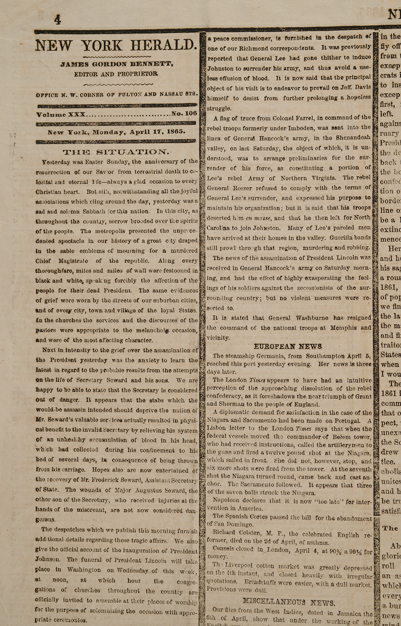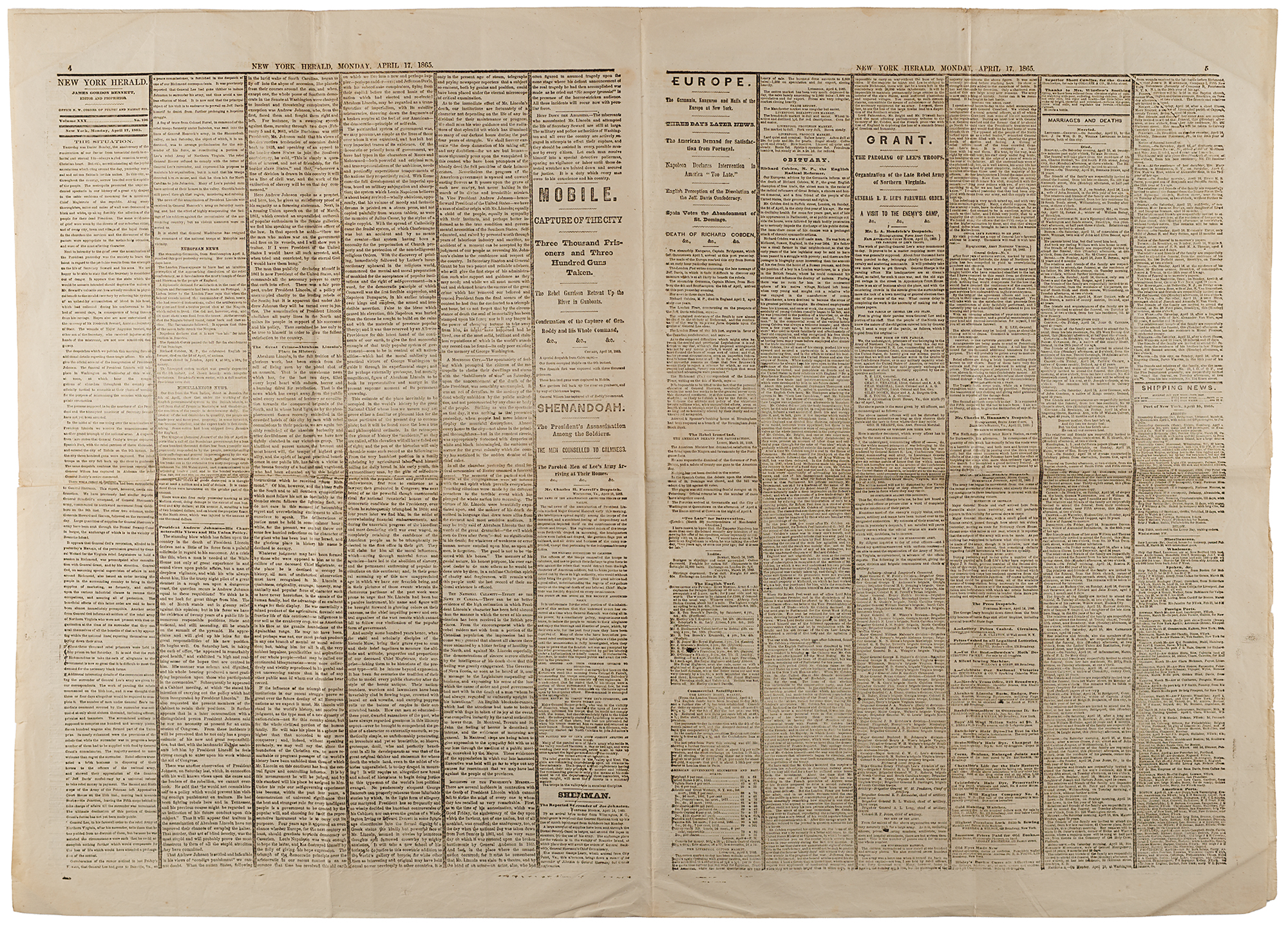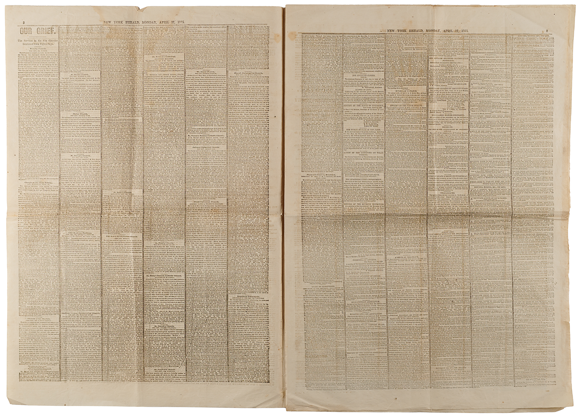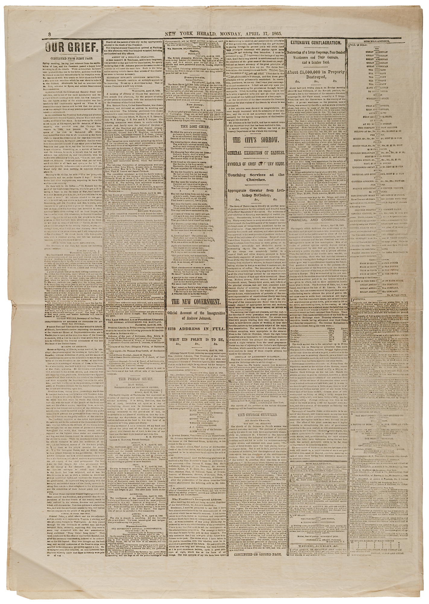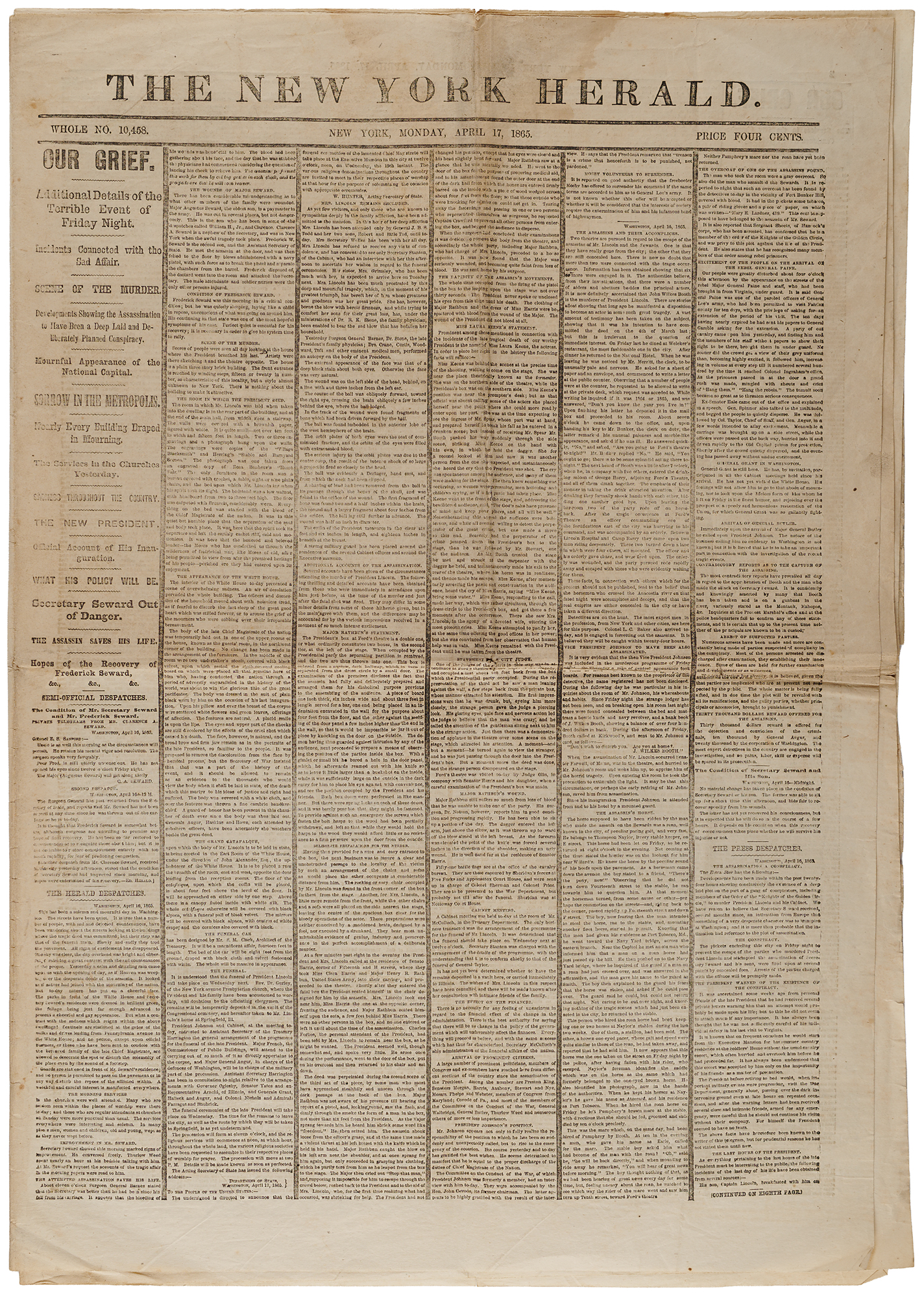 Complete issue of the New York Herald from April 17, 1865, eight pages, 15.5 x 22.5, reporting on the assassination of President Abraham Lincoln, outlined with black mourning rules throughout the entire paper. The first column begins with a series of large headlines covering the tragedy: "Our Grief. Additional Details of the Terrible Event of Friday Night. Incidents Connected with the Sad Affair. Scene of the Murder. Developments Showing the Assassination to Have Been a Deep Laid and Deliberately Planned Conspiracy. Mournful Appearance of the National Capital. Sorrow in the Metropolis. Nearly Every Building Draped in Mourning." These are followed by coverage of more positive developments, including: the inauguration of President Andrew Johnson; the recovery of Secretary of State William Seward, who was also attacked as part of the conspiracy; and the manhunt for the assassin and his accomplices. In fine condition.