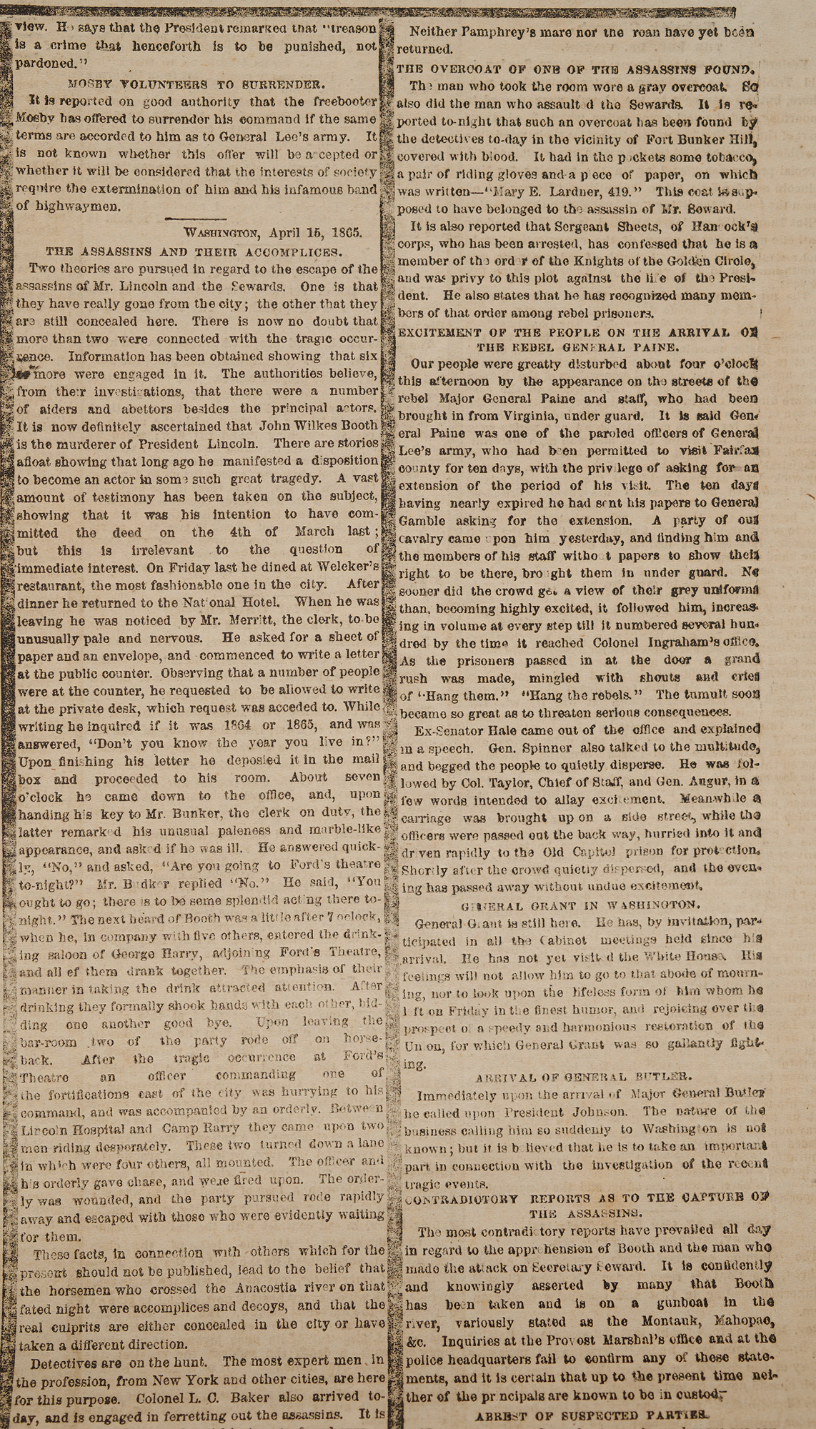 Coverage of Lincoln's death from the nation's most widely circulated newspaper: "Developments Showing the Assassination to Have Been a Deep Laid and Deliberately Planned Conspiracy"