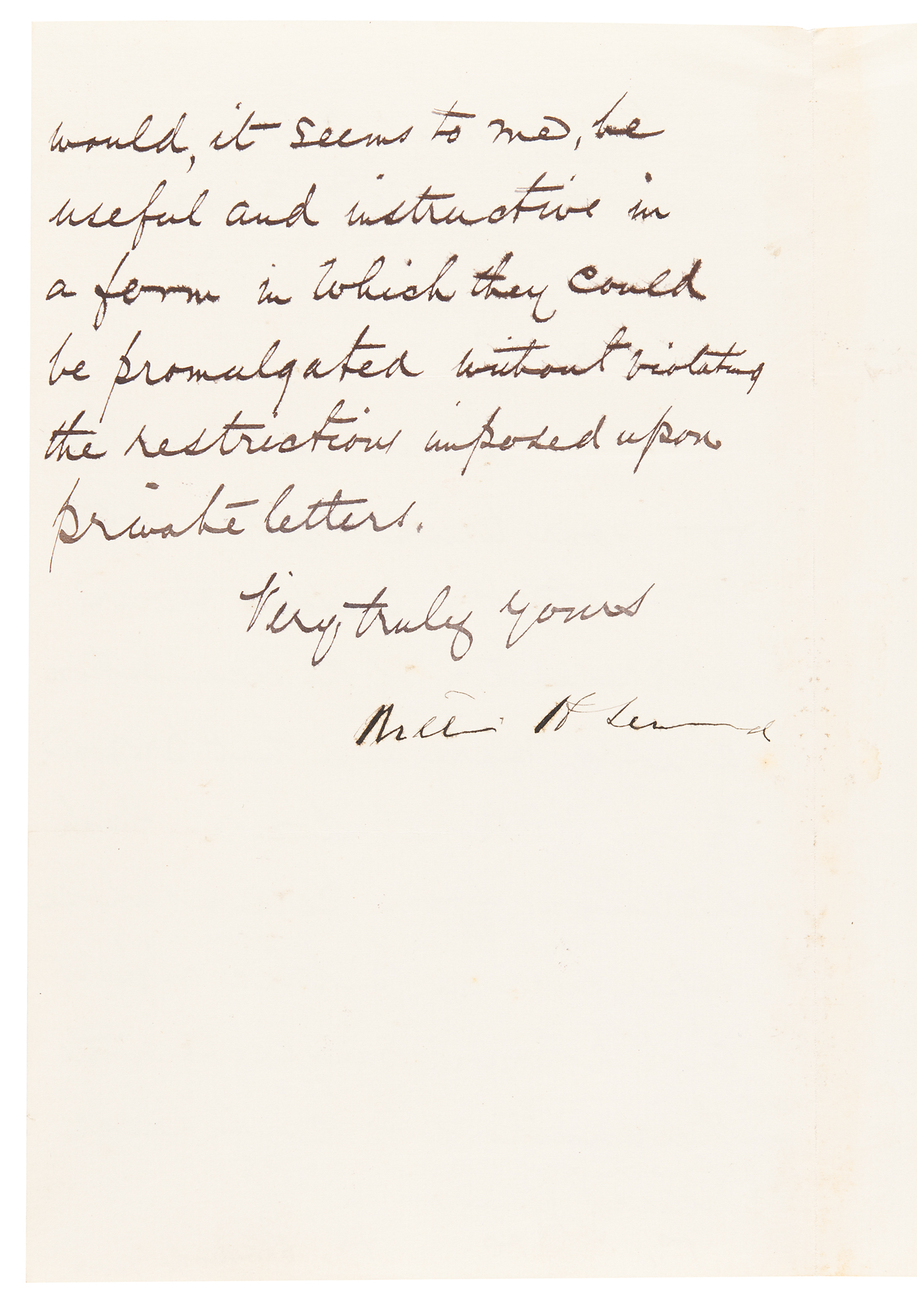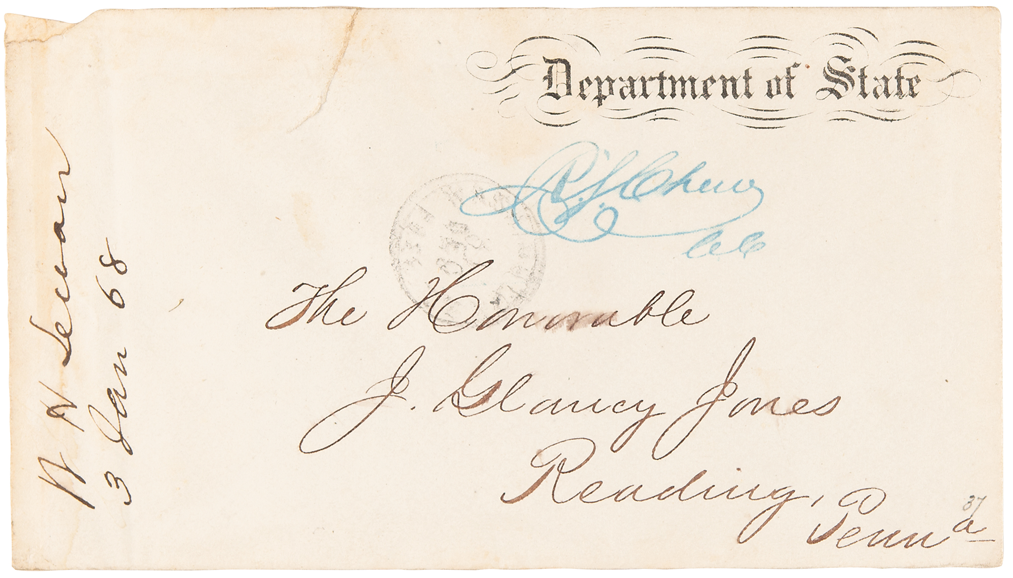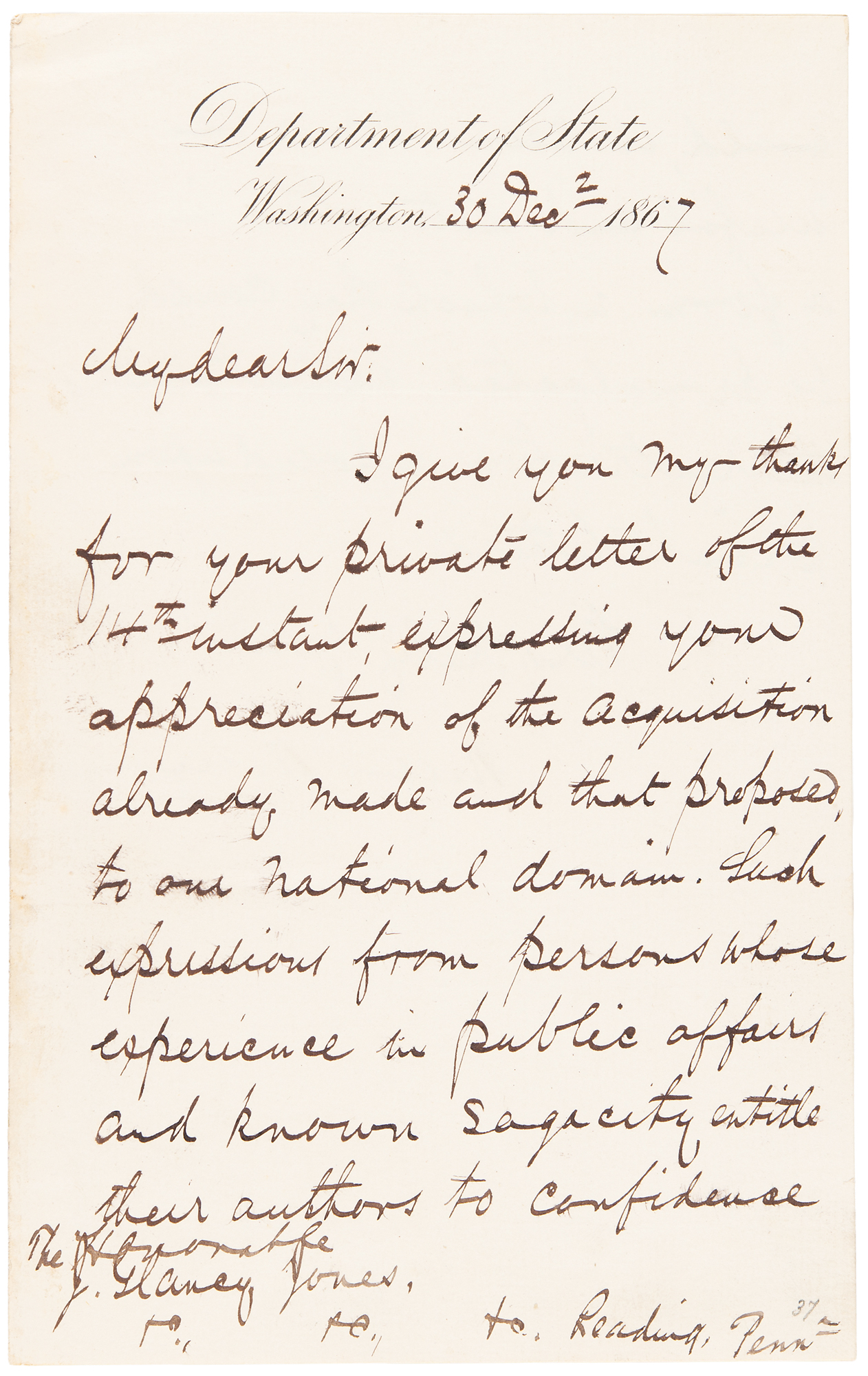 LS signed “William H. Seward,” one page both sides, 5 x 8, Department of State letterhead, December 30, 1867. Letter to the Hon. J. Glancy Jones, thanking him for comments in relation to the recent purchase of Alaska, and alluding to a proposal for the acquisition of British Columbia. In full: "I give you my thanks for your private letter of the 14th instant, expressing your appreciation of the acquisition already made and that proposed, to our national domain. Such expressions from persons whose experience in public affairs and known sagacity entitle their authors to confidence would, it seems to me, be useful and instructive in a form in which they could be promulgated without violating the restrictions imposed upon private letters." In fine condition. Accompanied by the original mailing envelope, retaining its red "Department of State" wax seal on the reverse.