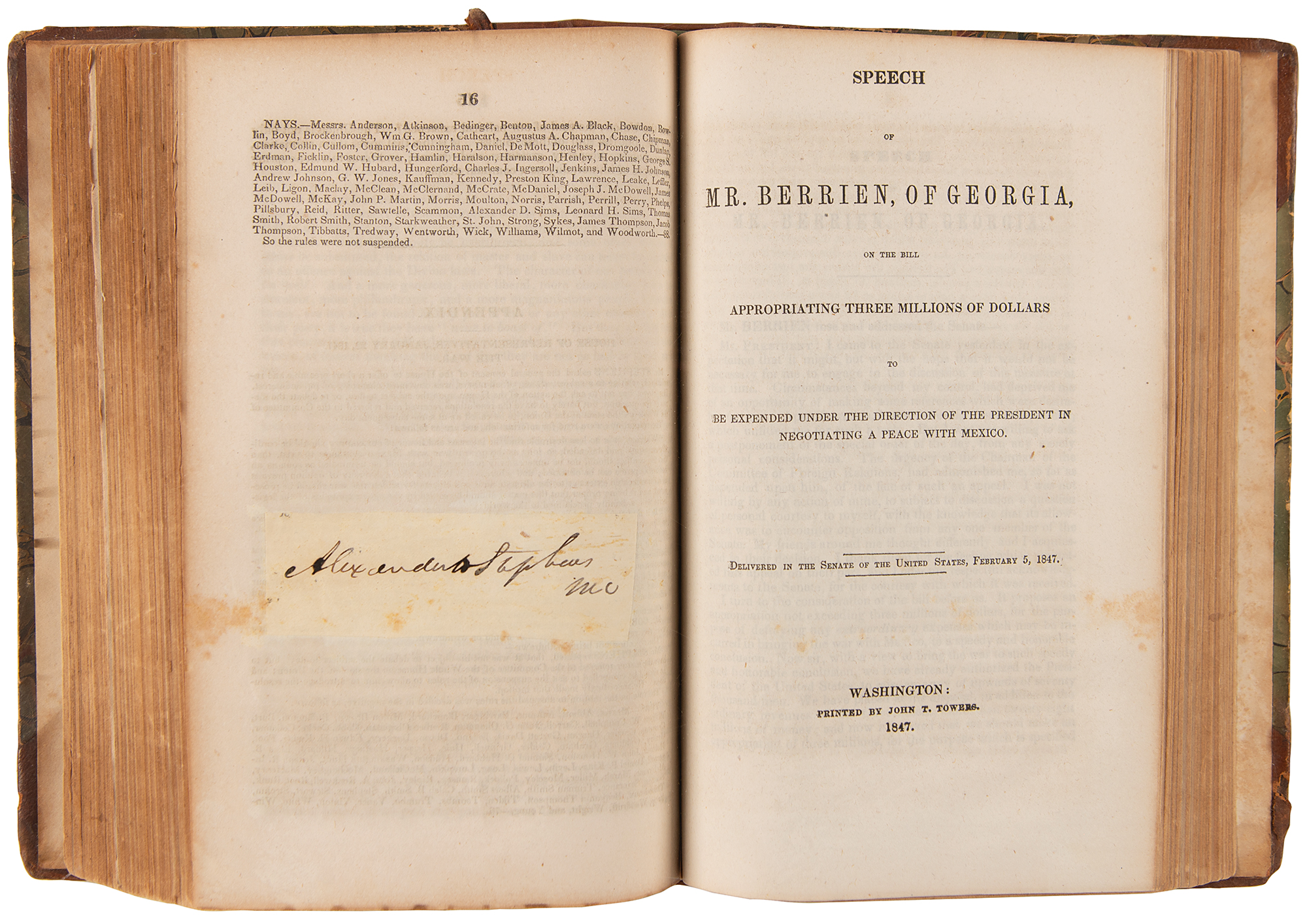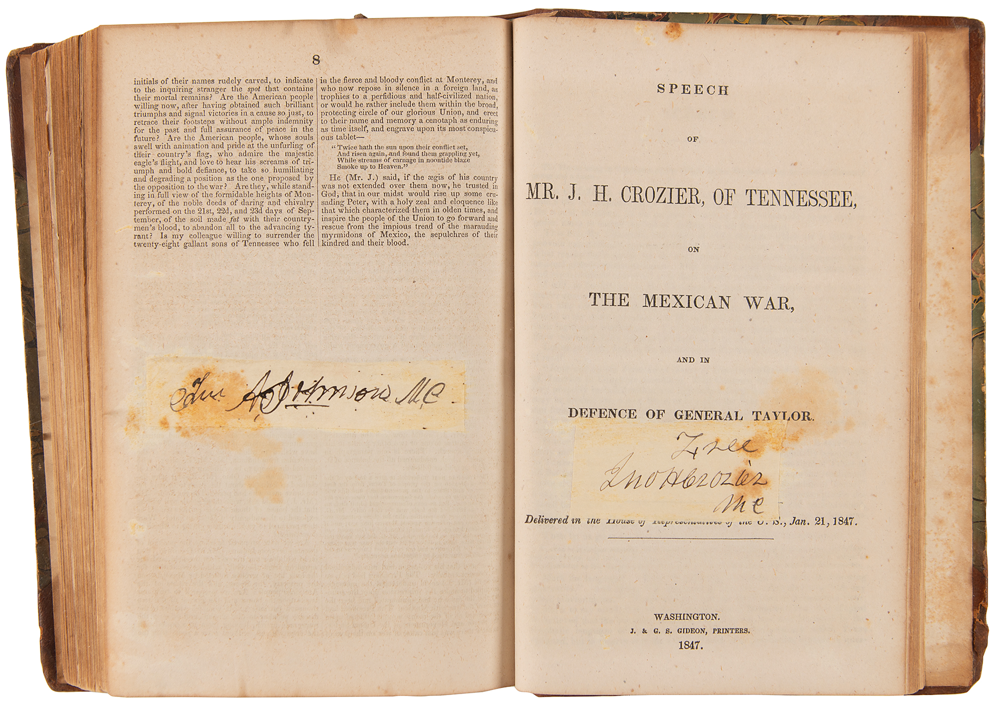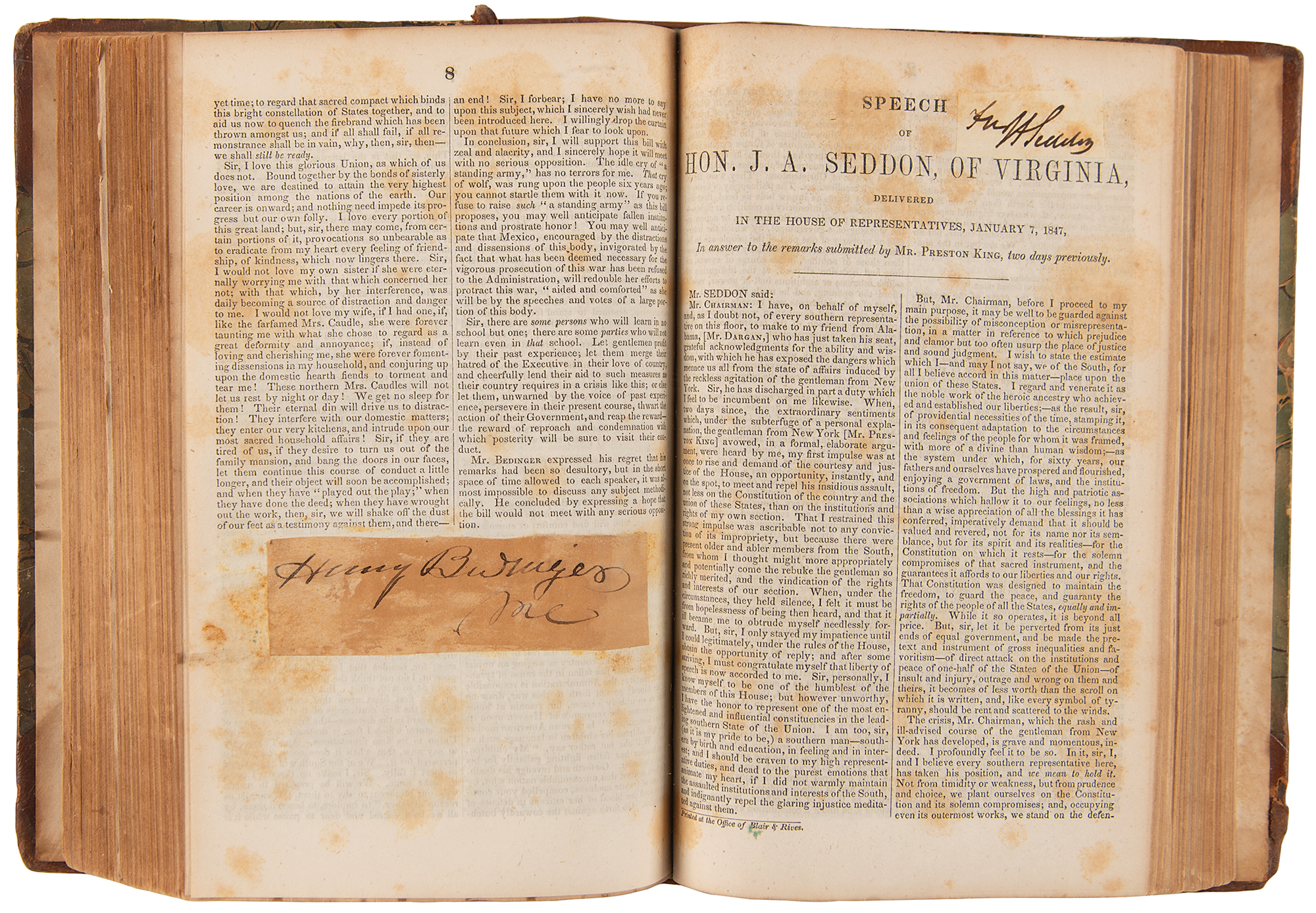 Unique book of speeches made by members of the 29th Congress of the United States, leatherbound hardcover with marbled boards, 6 x 9, containing more than 60 clipped and affixed signatures inside, mostly taken from free franked covers. Most speeches pertain to the 'Three Million Bill,' the Mexican-American War, or the slavery question, focusing on the Wilmot Proviso—a proposal to ban slavery in territories acquired from Mexico. Signed and dated on the first free end page with the ownership signature of T. A. D. Fessenden, "Thomas A. D. Fessenden, 1847."