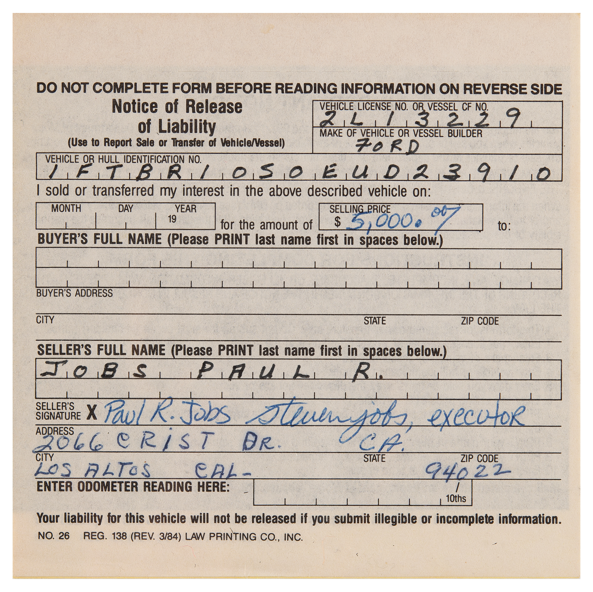 Unique partly-printed DS, signed "steven jobs, executor," one page, 4.75 x 4.75, no date but circa mid-1990s. California Department of Motor Vehicles "Notice of Release of Liability" form, partially filled out in blue ballpoint by Steve Jobs for the sale of his father's car. Jobs writes his father's name,"Paul R. Jobs," notes the vehicle's price as "$5,000.00," and signs as the executor of the estate; the vehicle data and seller's address—that of the famous Jobs family home in Los Altos—are filled out in another hand. The document retains its attached carbon copy, which carries an interesting 'ghost' of a second Steve Jobs signature, apparently formed while signing a second document over this one during the settlement of his father's estate. In fine condition.