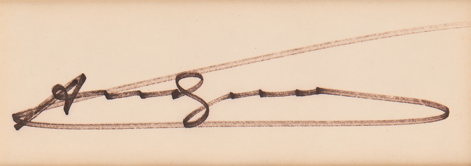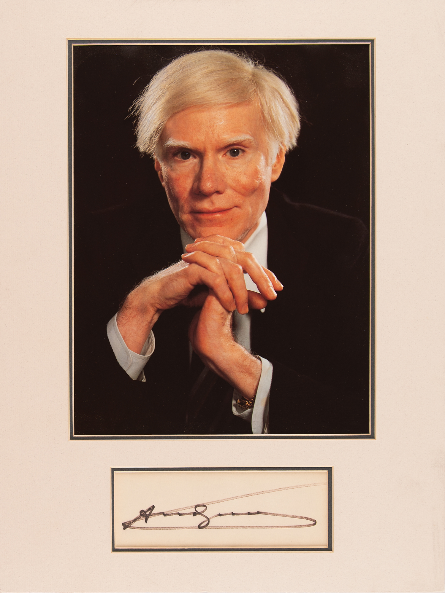 Felt tip signature, "Andy Warhol,” on an off-white 5.5 x 2 card, double-matted with a portrait to an overall size of 12 x 15.75. In fine condition.
