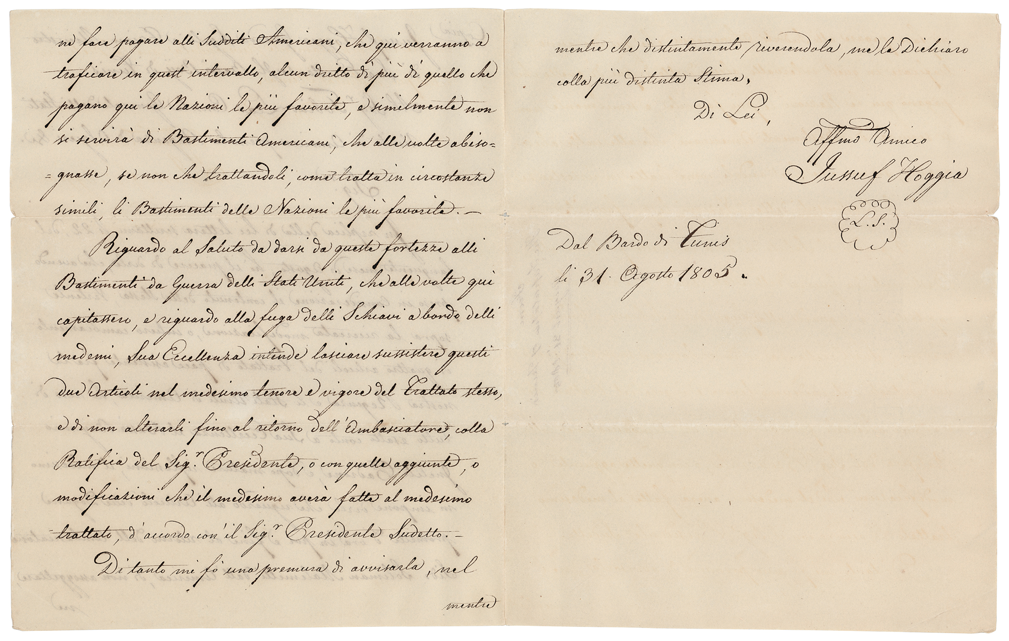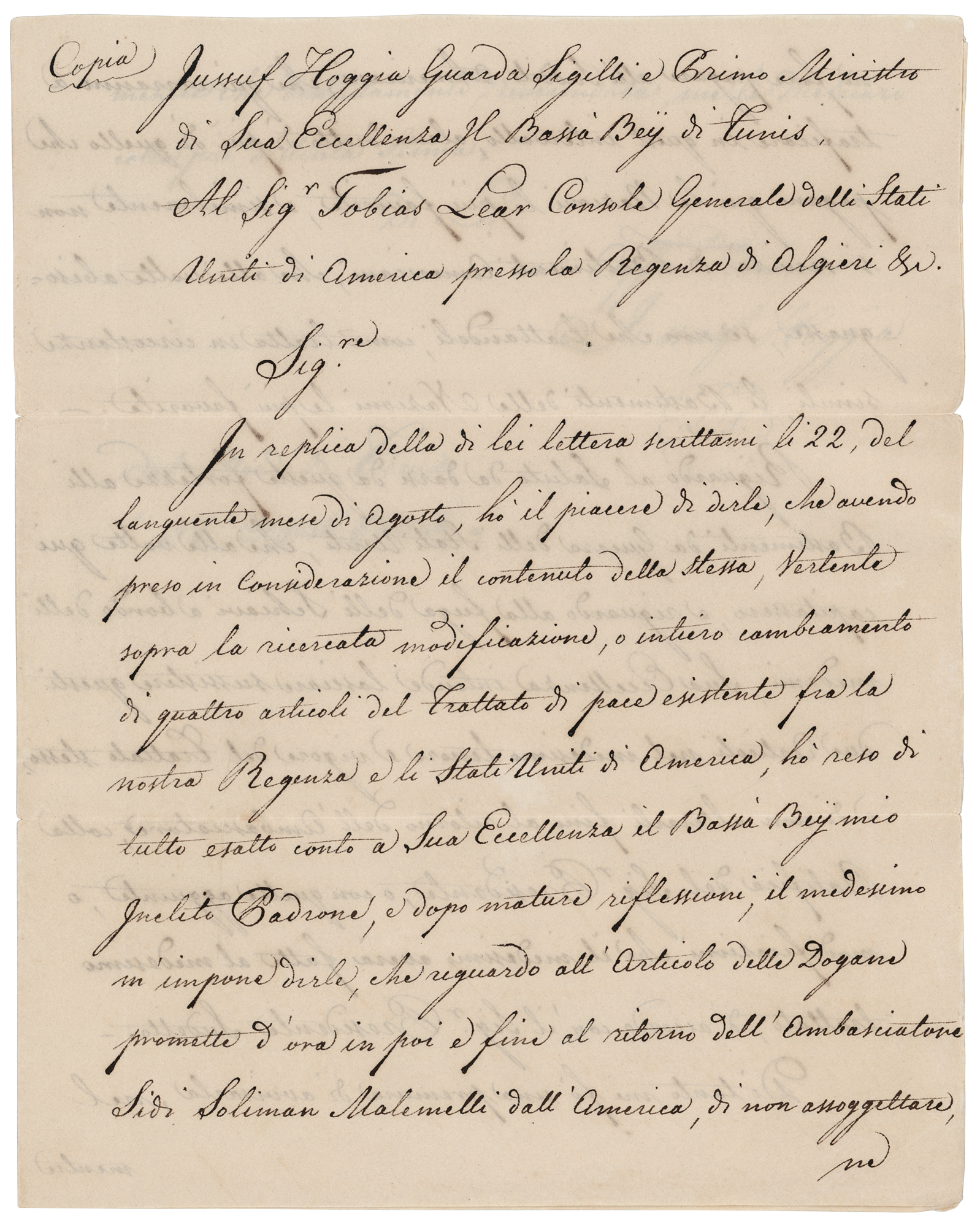 Contemporary manuscript copy of a letter to Tobias Lear by Jusuf Hoggia, three pages on two adjoining sheets, 8 x 10, August 31, 1805. Untranslated letter in Italian pertaining to modifications to a treaty between Tunis and the United States, marked "Copia" at upper left. In fine condition. Lear was responsible for negotiating a peace treaty with the Bey of Tripoli that ended the first Barbary War.