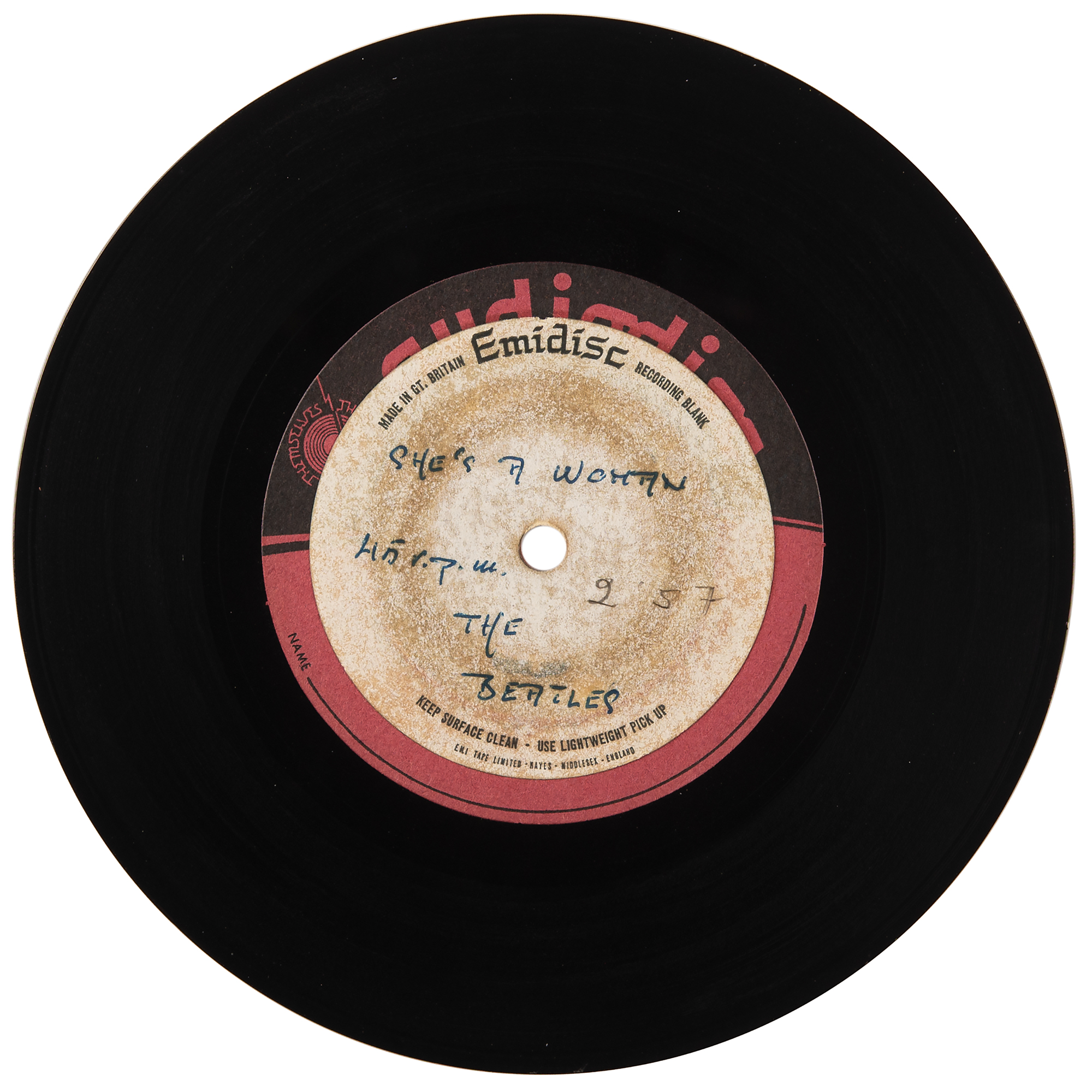 Sought-after 7˝ EMI one-sided acetate pressing of the Beatles' hit "She's a Woman," as heard on the mono 45 RPM single released on November 23, 1964. The acetate disc bears a black-and-white Emidisc label over a black-and-red Audiodiscs label, filled out in bold ballpoint: "She's a Woman, 45 r.p.m., The Beatles." The song's runtime is also annotated in pencil: "2:57."
