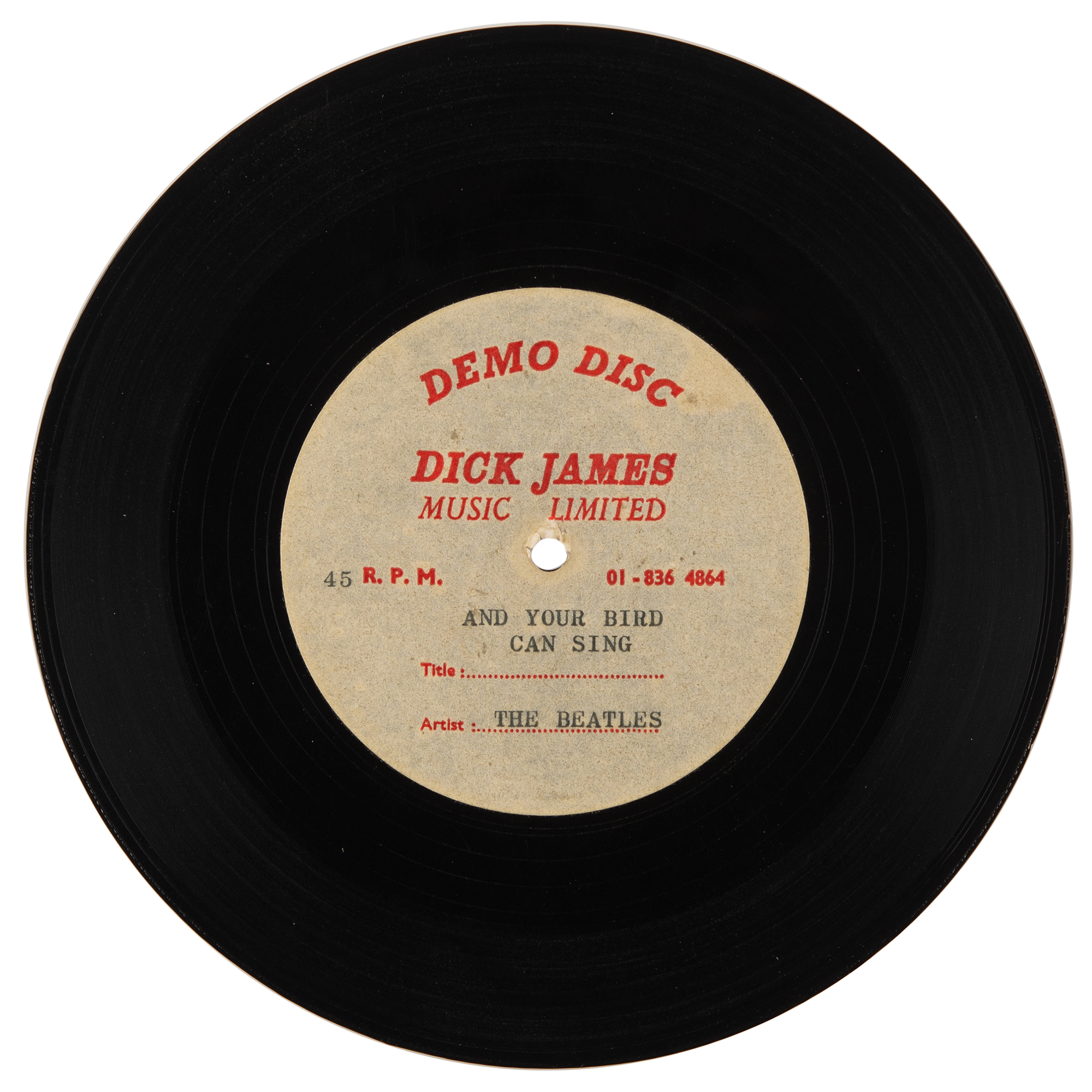 Uncommon 7˝ Dick James Music Limited one-sided acetate for the Beatles' song "And Your Bird Can Sing," first released in 1966 on Yesterday and Today in the United States and on Revolver in the United Kingdom. The acetate disc bears a red-and-white Dick James "Demo Disc" label, filled out in type: "45 R.P.M., Title: And Your Bird Can Sing, Artist: The Beatles."