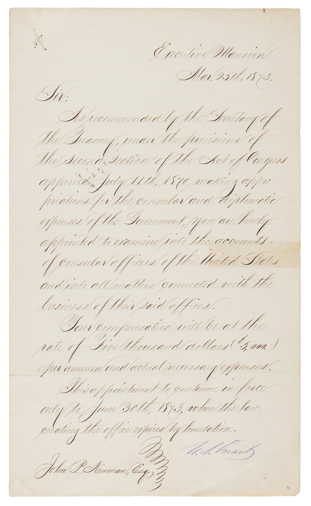LS as president, signed "U. S. Grant," one page, 8.5 x 14, March 25, 1873. Official letter to John P. Newman, sent from the Executive Mansion. In part: "As recommended by the Secretary of the Treasury, under the provisions of the second section of the Act of Congress approved July 11th, 1870, making appropriations for the consular and diplomatic expenses of the Government, you are hereby appointed to examine into the accounts of consular officers of the United States and into all matters connected with the business of their said offices." In fine condition, with an old tape stain to the right side of the central horizontal fold.