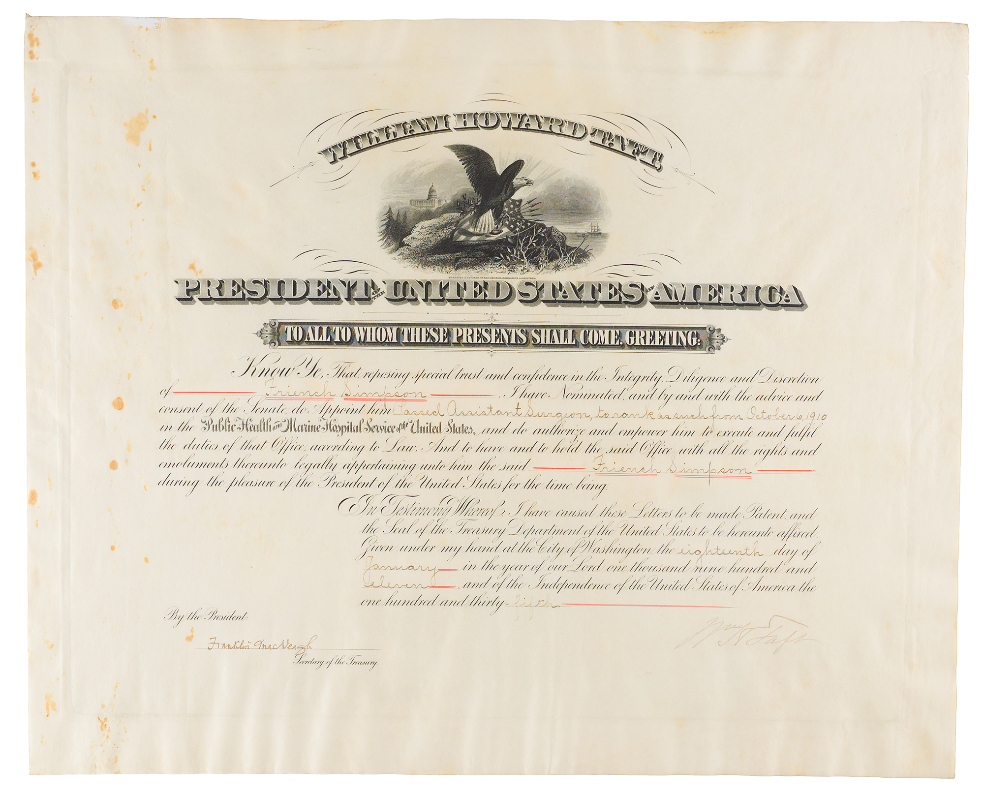Partly-printed vellum DS as president, signed “Wm. H. Taft,” one page, 19.5 x 15.75, January 18, 1911. President Taft appoints Friench Simpson as "Passed Assistant Surgeon, to rank as such from October 6, 1910, in the Public Health and Marine Hospital Service of the United States." Neatly signed at the conclusion in ink by President William H. Taft and countersigned by Secretary of the Treasury Franklin MacVeagh. In very good to fine condition, with staining along the left side.