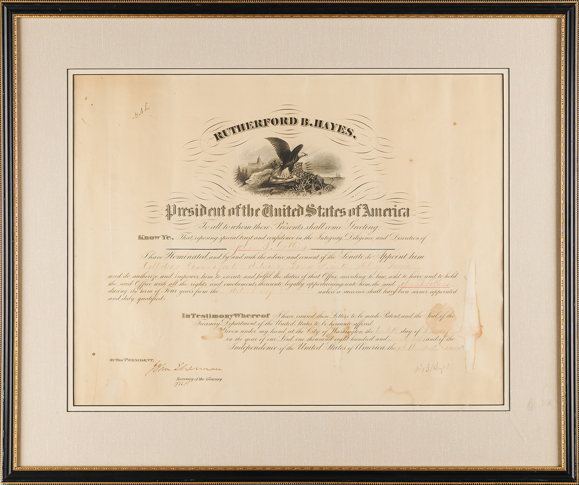 Partly-printed DS as president, signed “R. B. Hayes,” one page, 18.5 x 14.5, February 20, 1878. President Hayes appoints John T. Collins as "Collector of Customs for the district of Brunswick, in the State of Georgia." Signed at the conclusion in ink by President Rutherford B. Hayes and countersigned by Secretary of the Treasury John Sherman. Double-matted and framed to an overall size of 25 x 21. In very good to fine condition, with light creasing and scattered dampstaining.