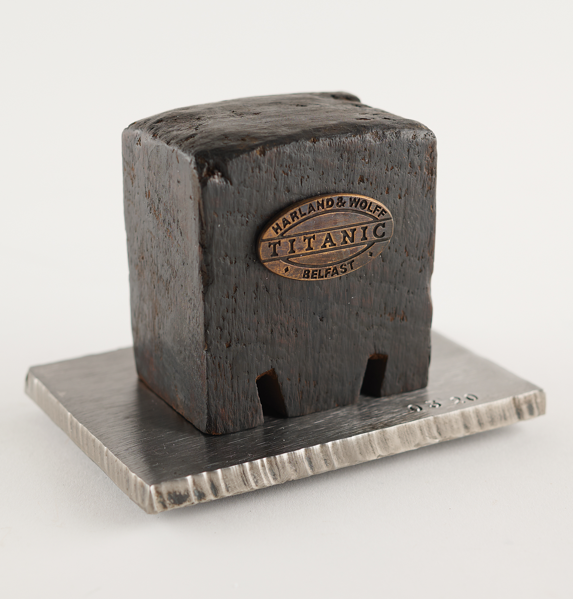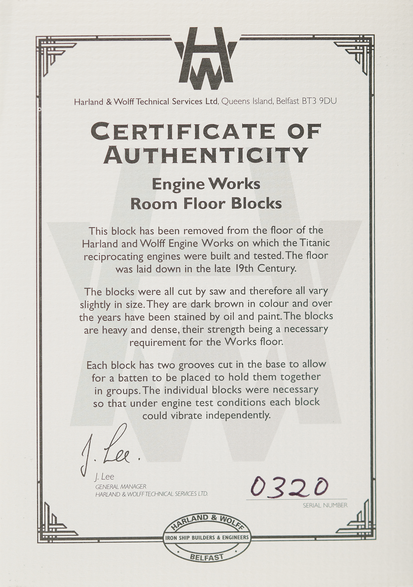 Block of wood removed Harland & Wolff’s Engine Works, measuring 2.75˝ x 3.25˝ x 2˝, with a "Harland & Wolff, Titanic, Belfast" plaque affixed to the front. Includes a metal display stand, the original box, and a certificate of authenticity from Harland & Wolff, in part: "This block has been removed from the floor of the Harland and Wolff Engine Works on which the Titanic reciprocating engines were built and tested…The blocks were all cut by saw and therefore all vary slightly in size. They are dark brown in colour and over the years have been stained by oil and paint. The blocks are heavy and dense, their strength being a necessary requirement for the Works floor. Each block has grooves cut in the base to allow for a batten to be placed to hold them together in groups. The individual blocks were necessary so that under engine test conditions each block could vibrate independently." In fine condition.