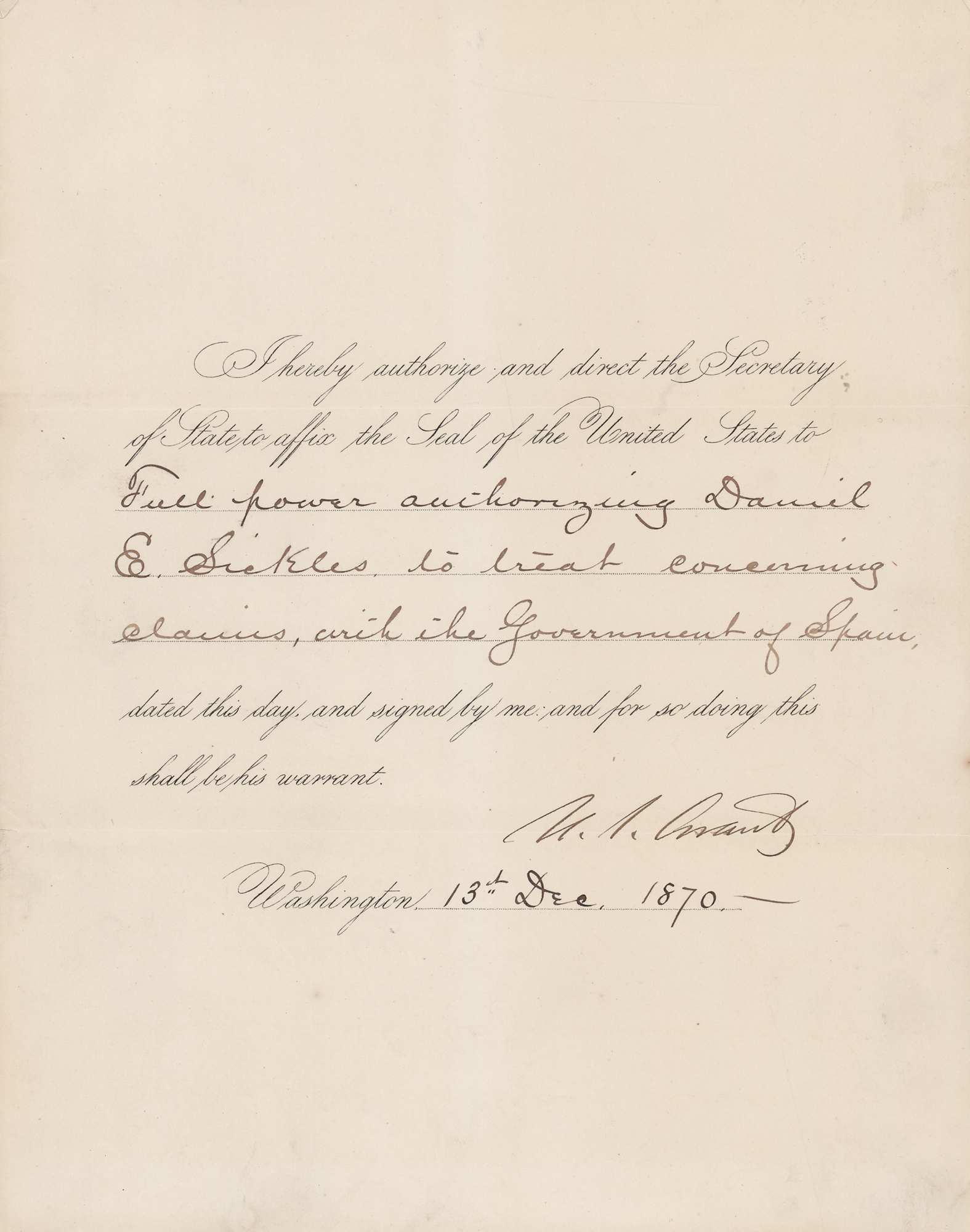 Partly-printed DS as president, one page, 8.5 x 11, December 13, 1870. President Grant authorizes and directs the Secretary of State to affix the Seal of the United States to the "Full power authorizing Daniel E. Sickles to treat concerning claims, with the Government of Spain." Neatly signed at the conclusion in ink by President Ulysses S. Grant. In fine condition.