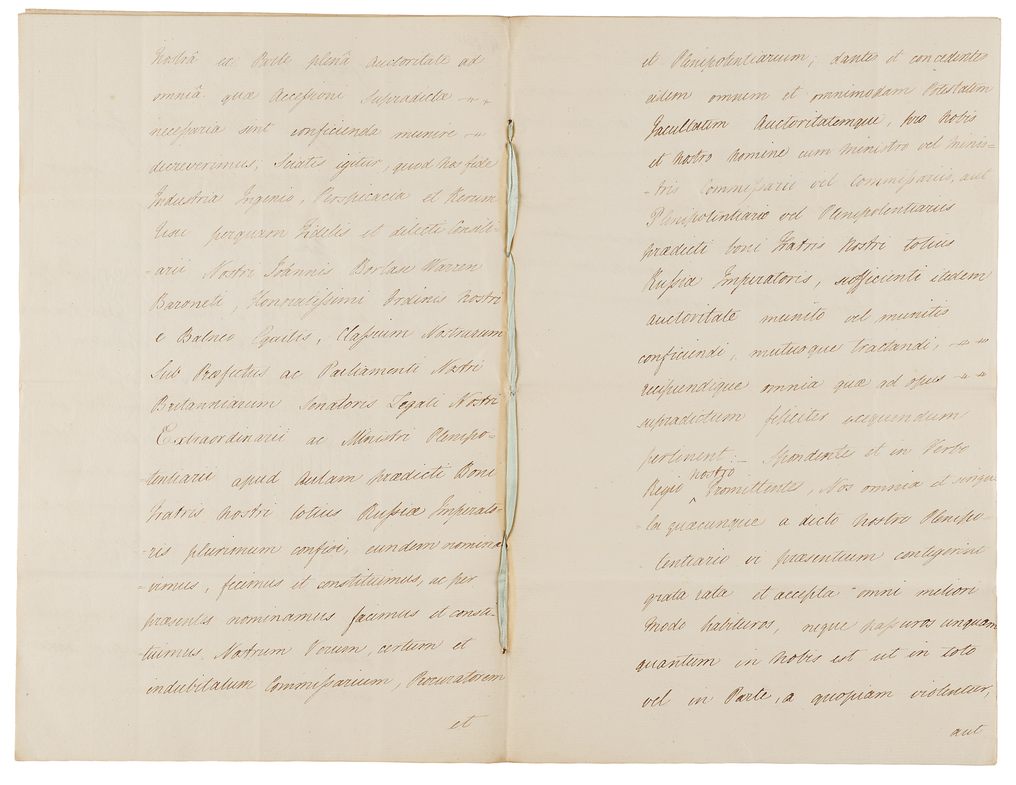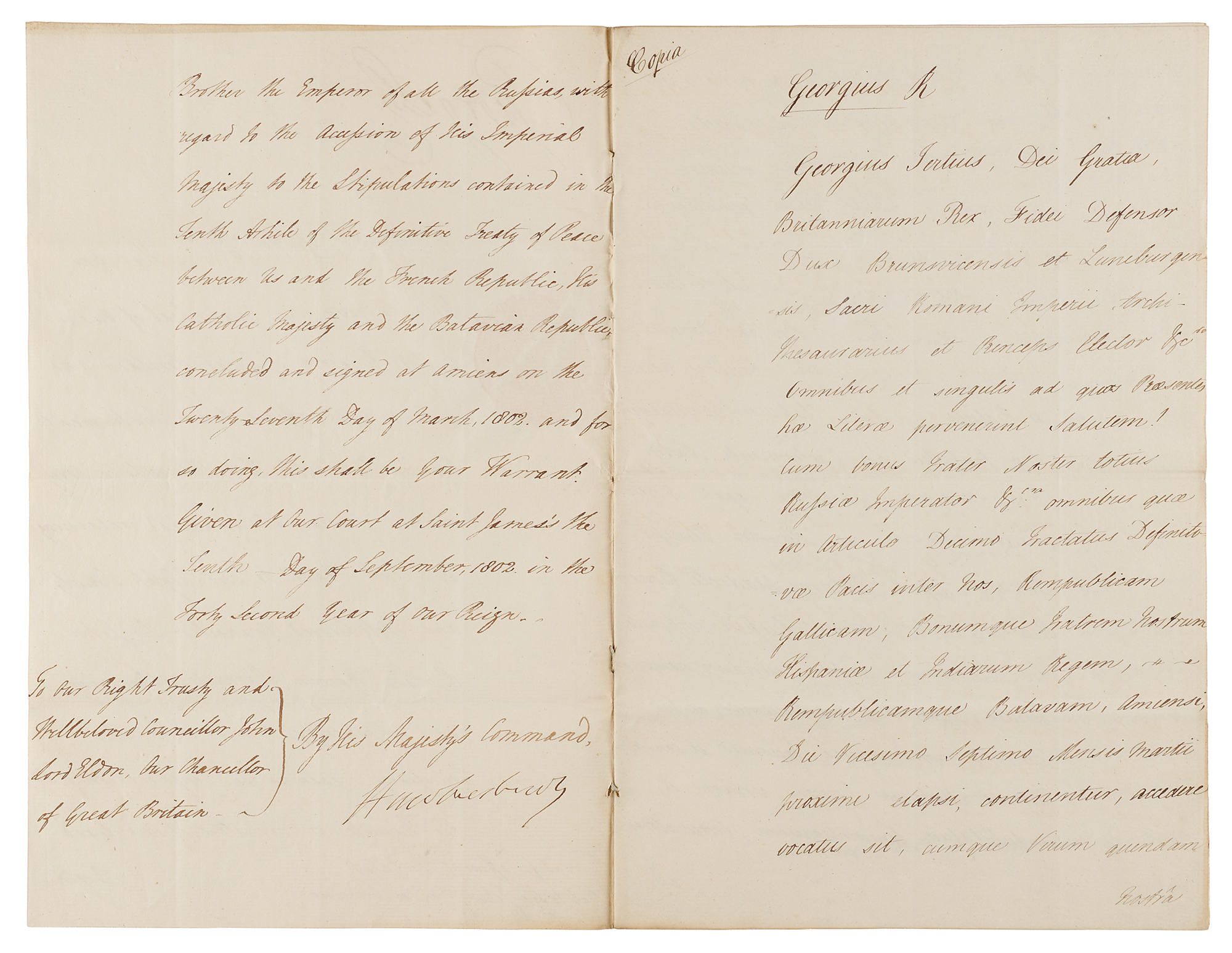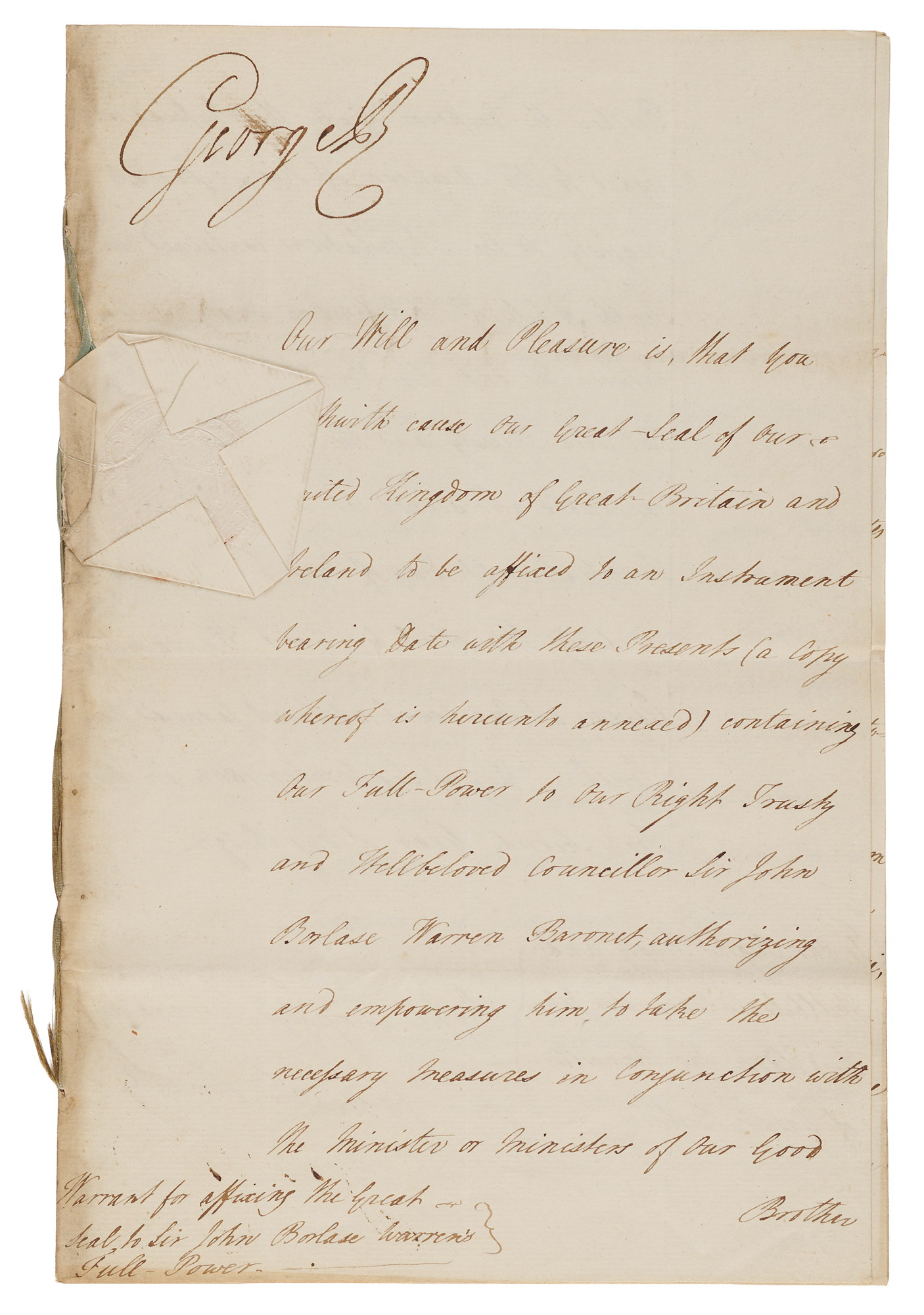 - manuscript DS, signed "George R," one page both sides, 7.75 x 12, September 10, 1802, being a warrant for affixing the Great Seal to Sir John Borlase Warren's full power to "take the necessary measures in conjunction with the minister or ministers of our good brother the Emperor of all the Russias, with regard to the accession of His Imperial Majesty to the stipulations contained in the Tenth Article of the Definitive Treaty of Peace between us and the French Republic, His Catholic Majesty and the Batavian Republic, concluded and signed at Amiens on the Twenty-Seventh Day of March, 1802," with annexed four-page manuscript of the full power's text.