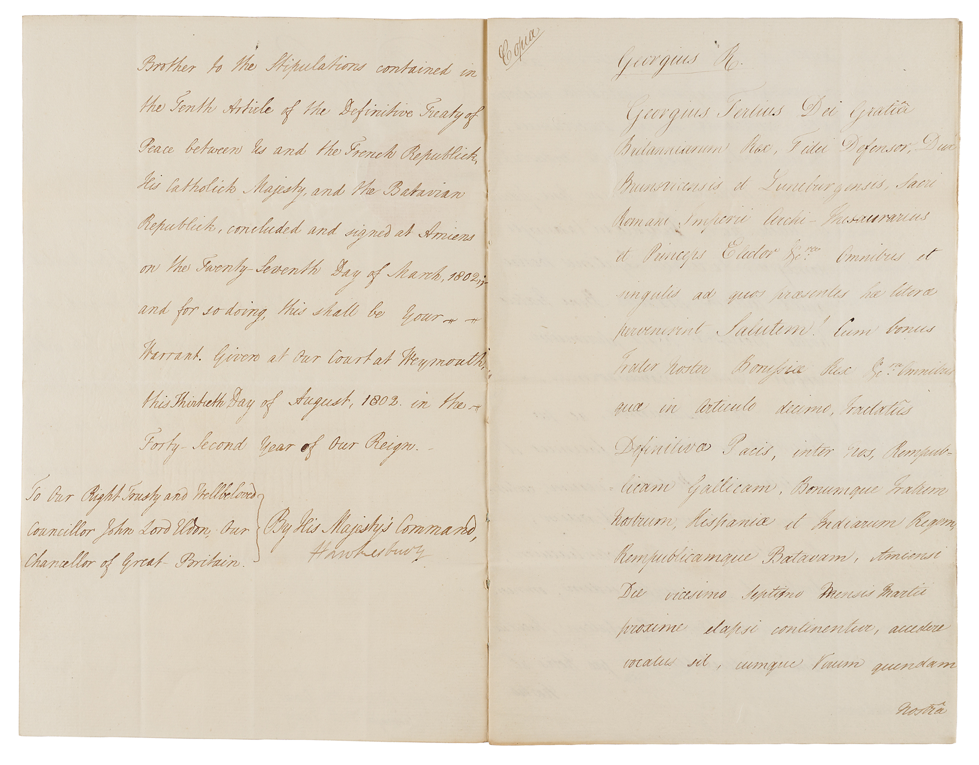 Significant pairing of documents signed by King George III, both pertaining to the Treaty of Amiens, which temporarily ended hostilities between France, the Spanish Empire, and the United Kingdom at the end of the War of the Second Coalition. It marked the end of the French Revolutionary Wars and set the stage for the Napoleonic Wars. Includes: