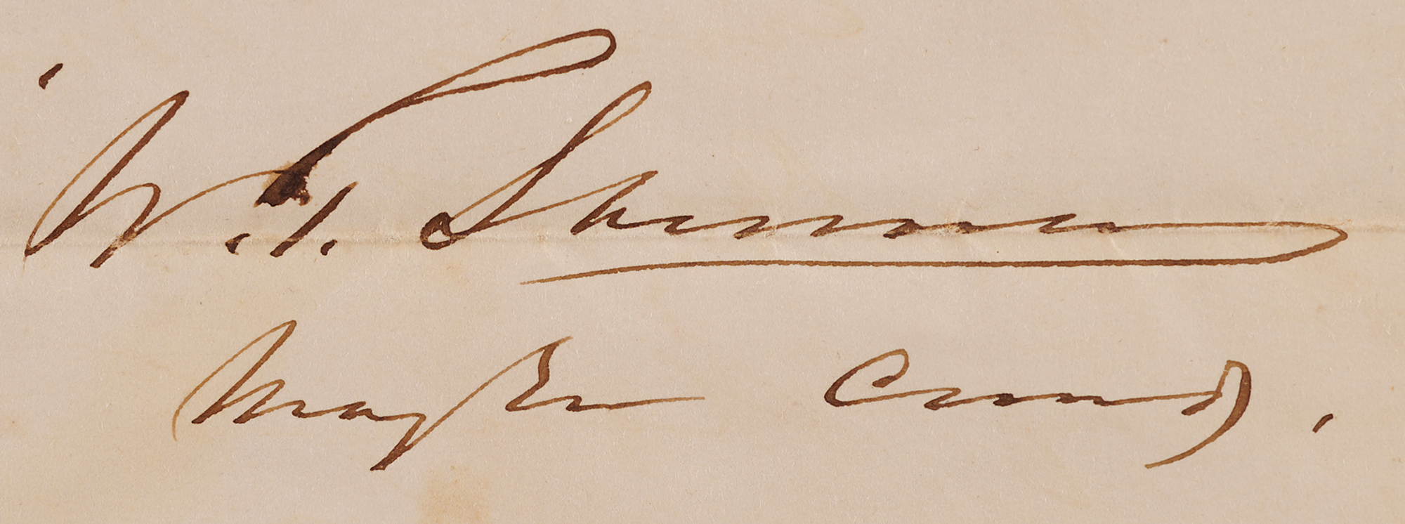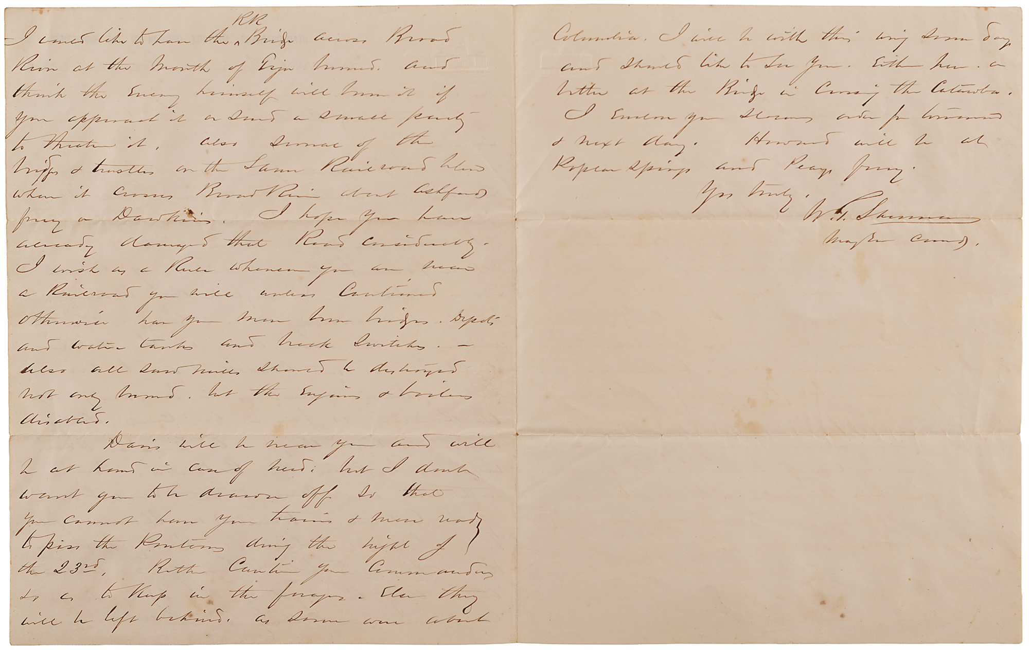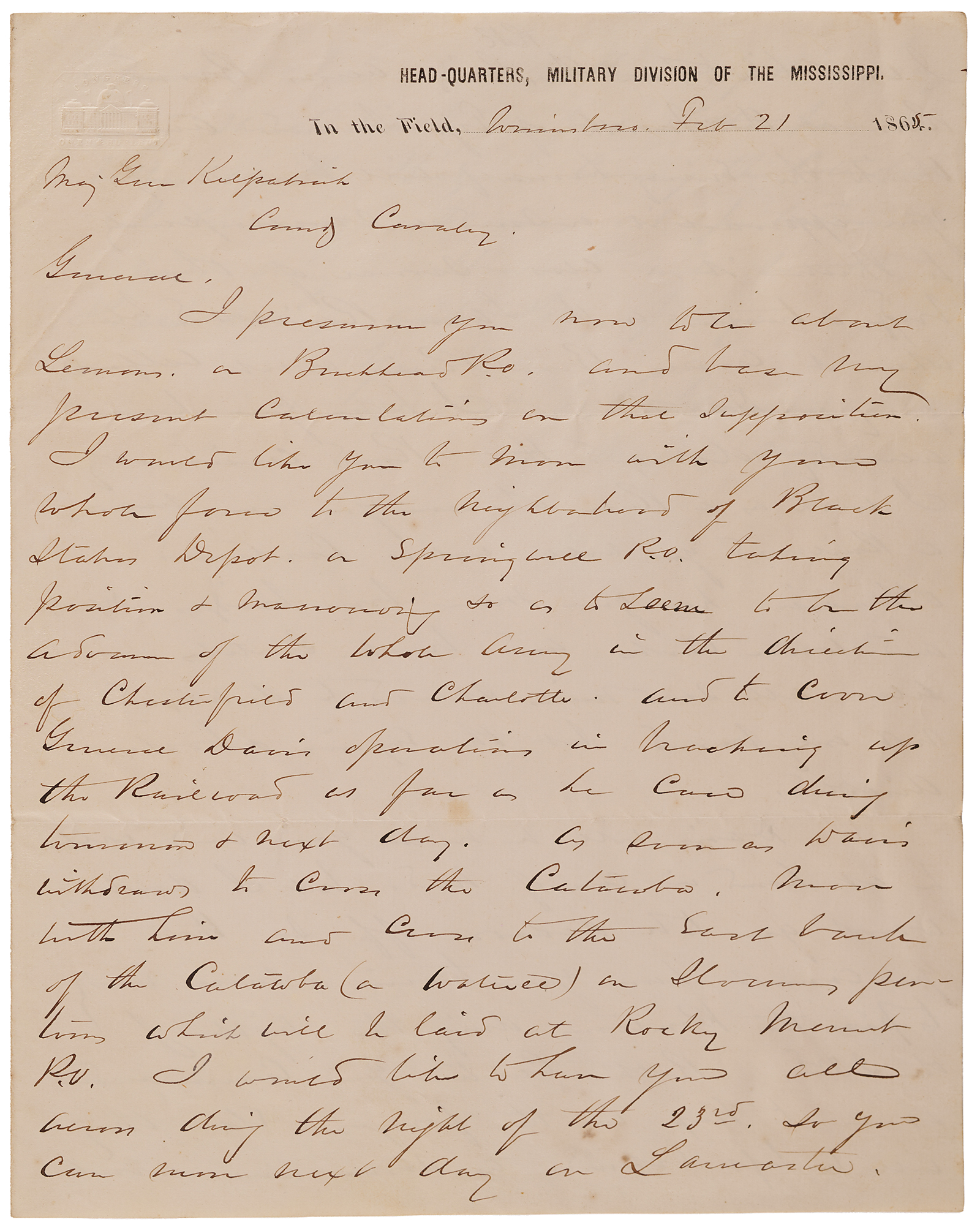 Civil War-dated ALS signed “W. T. Sherman, Maj. Gen. Comd'g,” three pages on two adjoining sheets, 7.75 x 9.75, Head-Quarters, Military Division of the Mississippi letterhead, February 21, 1865. Handwritten letter to Maj. Gen. Hugh Judson Kilpatrick, relating to operations in South Carolina. In part: "I presume you now to be about Lemon's or or Buckhead P.O. and base my present calculations on that supposition. I would like you to move with your whole force to the neighborhood of Black Station Depot or Springwell P.O. taking position & maneuvering so as to seem to be the advance of the whole army in the direction of Chesterfield and Charlotte, and to cover General Davis' operations in breaking up the Railroad as far as he can during tomorrow & next day. As soon as David withdraws to cross the Catawba, move with him and cross to the east bank…