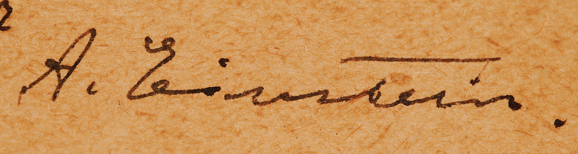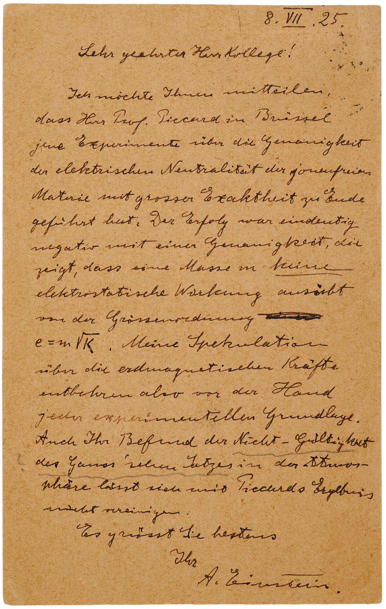 ALS in German, signed “A. Einstein,” one page, 3.5 x 5.5, July 8, 1925. Handwritten letter to Professor Albert Wigand at the University of Halle, in full (translated): "I would like to inform you that Prof. Piccard in Brussels has completed those experiments on the accuracy of the electrical neutrality of matter with great precision. The result was clearly negative with an accuracy that shows that mass exerts no electrostatic effect of the order of magnitude e=m√K. My speculation about geomagnetical forces therefore lacks any experimental basis for the time being. Your finding of the non-validity of Gauss's law in the atmosphere cannot be reconciled with Piccard's result either." Addressed on the reverse in Einstein's hand. In fine condition.