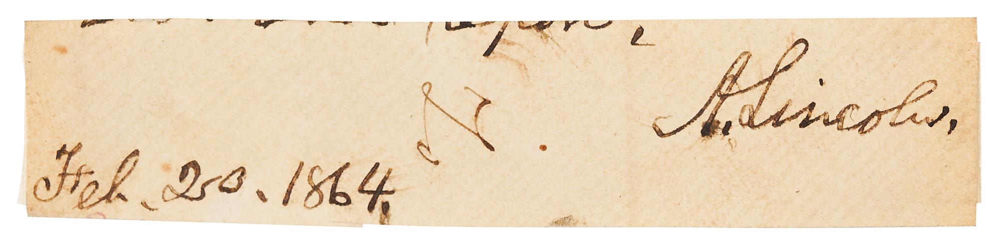 Civil War-dated ink signature as president, “A. Lincoln, Feb. 20, 1864,” on an off-white 3.75 x .75 slip. In fine condition. Accompanied by an engraving of Abraham Lincoln with a facsimile signature. According to ‘Lincoln Day By Day: A Chronology, 1809-1865,’ on February 20, 1864, the ‘President attends Mrs. Lincoln's regular Saturday afternoon reception,’ and, as noted in the ‘Collected Works of Abraham Lincoln,’ on this date Lincoln forwarded an endorsement to Edwin Stanton, his Secretary of War, on a letter from Edward Cooper and Judge Henry Cooper of Tennessee, regarding a prisoner of war, ill with tuberculosis, at Camp Morton, Indiana. Lincoln wrote: ‘I specifically request that you will see Judge Cooper and allow him to take his brother home with him.’