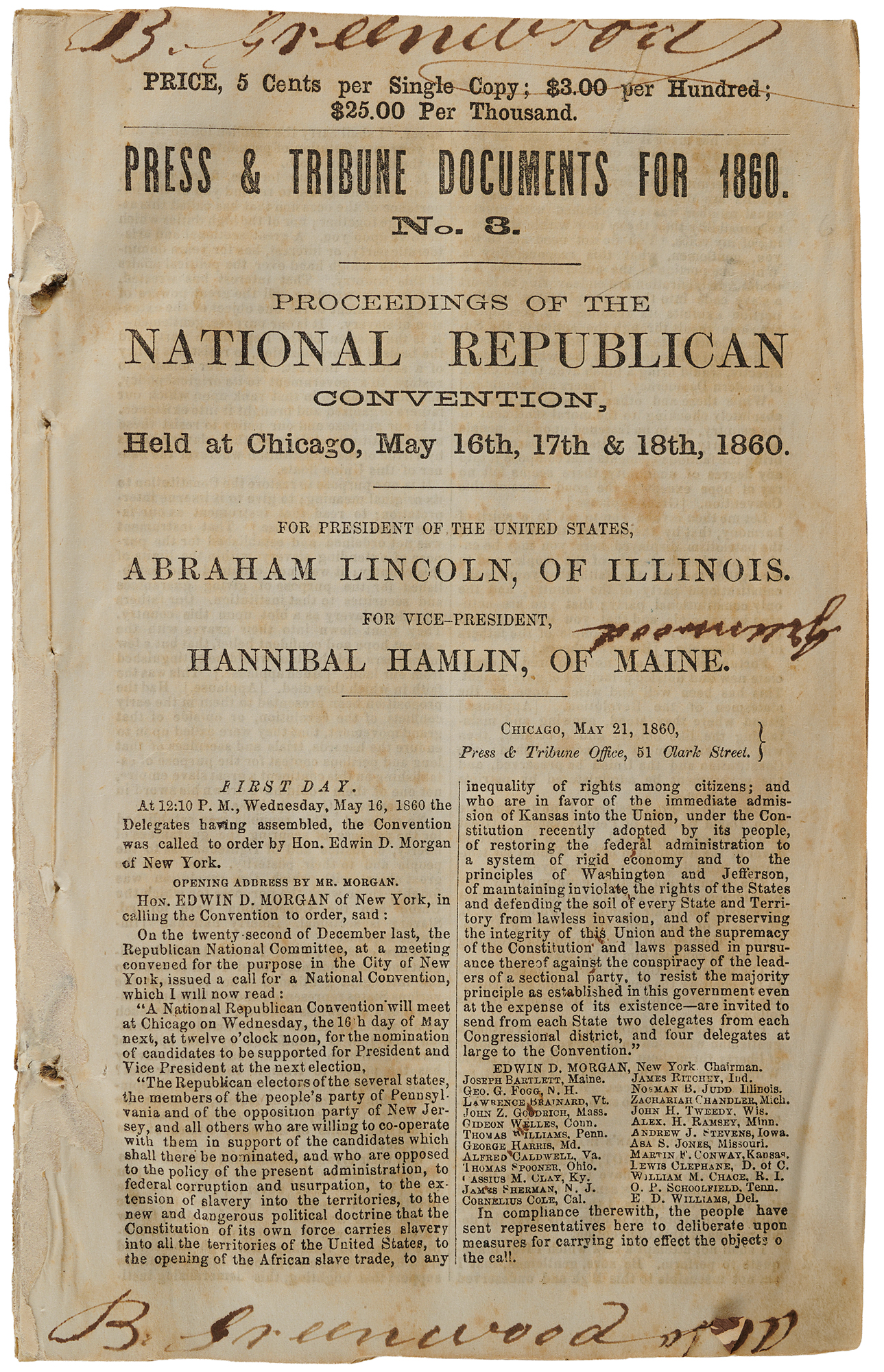 String-bound pamphlet entitled “Proceedings of the Republican National Convention Held at Chicago, May 16th, 17th & 18th, 1860. For President of the United States, Abraham Lincoln, of Illinois. For Vice-President, Hannibal Hamlin, of Maine.” Published by the Chicago Press & Tribune newspaper, the pamphlet, 44 pages, 5.5 x 8.75, issued as “Press & Tribune Documents for 1860. No. 3.,” contains a detailed synopsis of the convention’s three busy days, culminating in the dramatic events that secured Lincoln’s rise to national prominence.