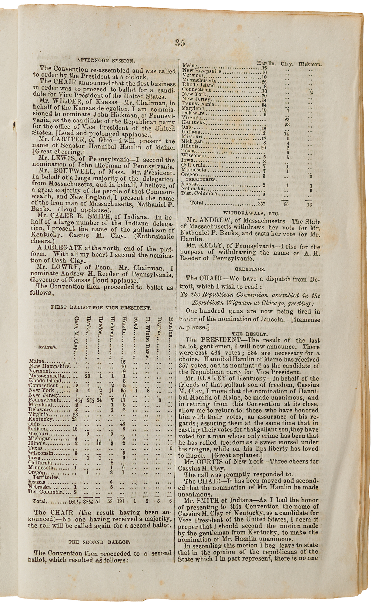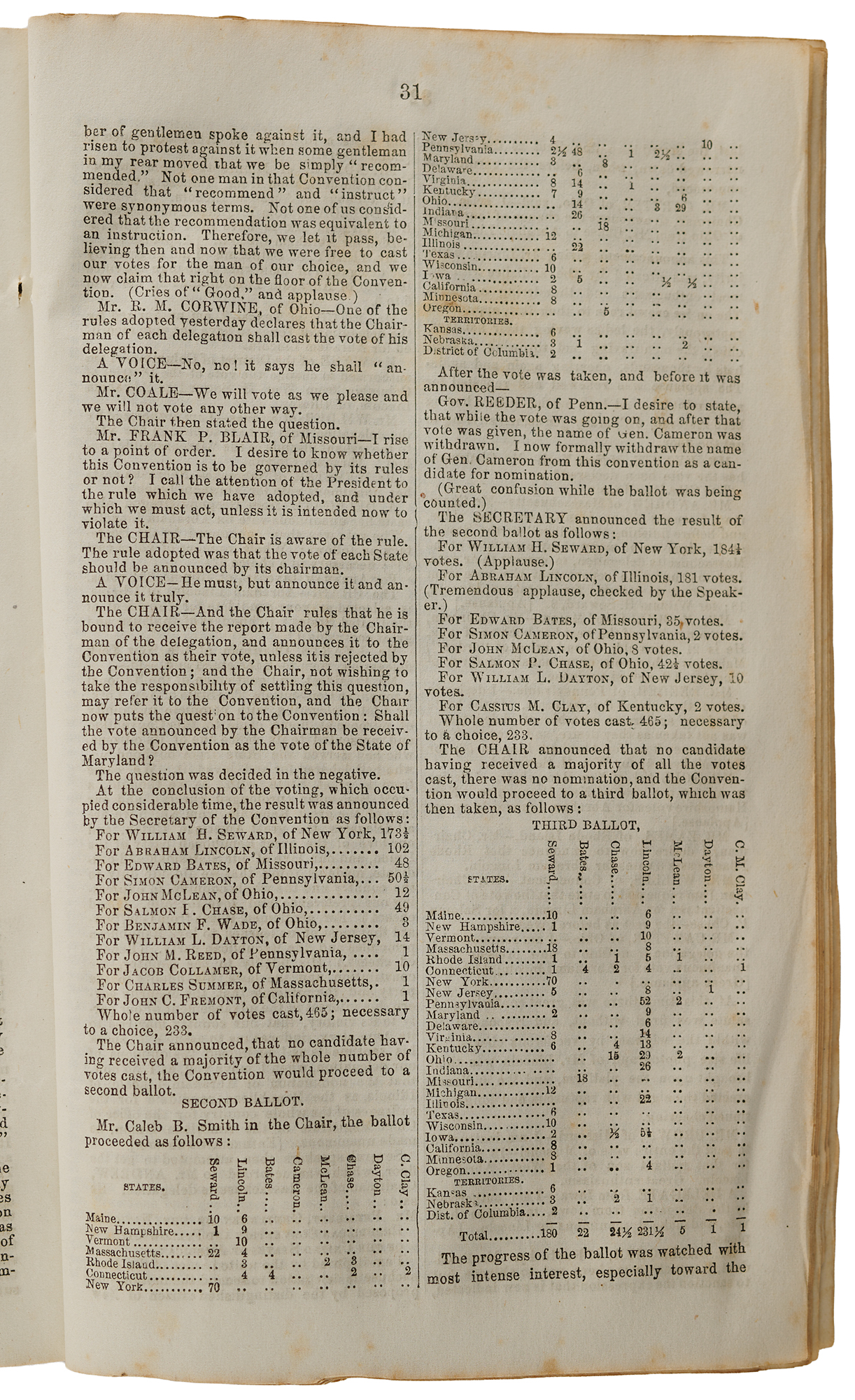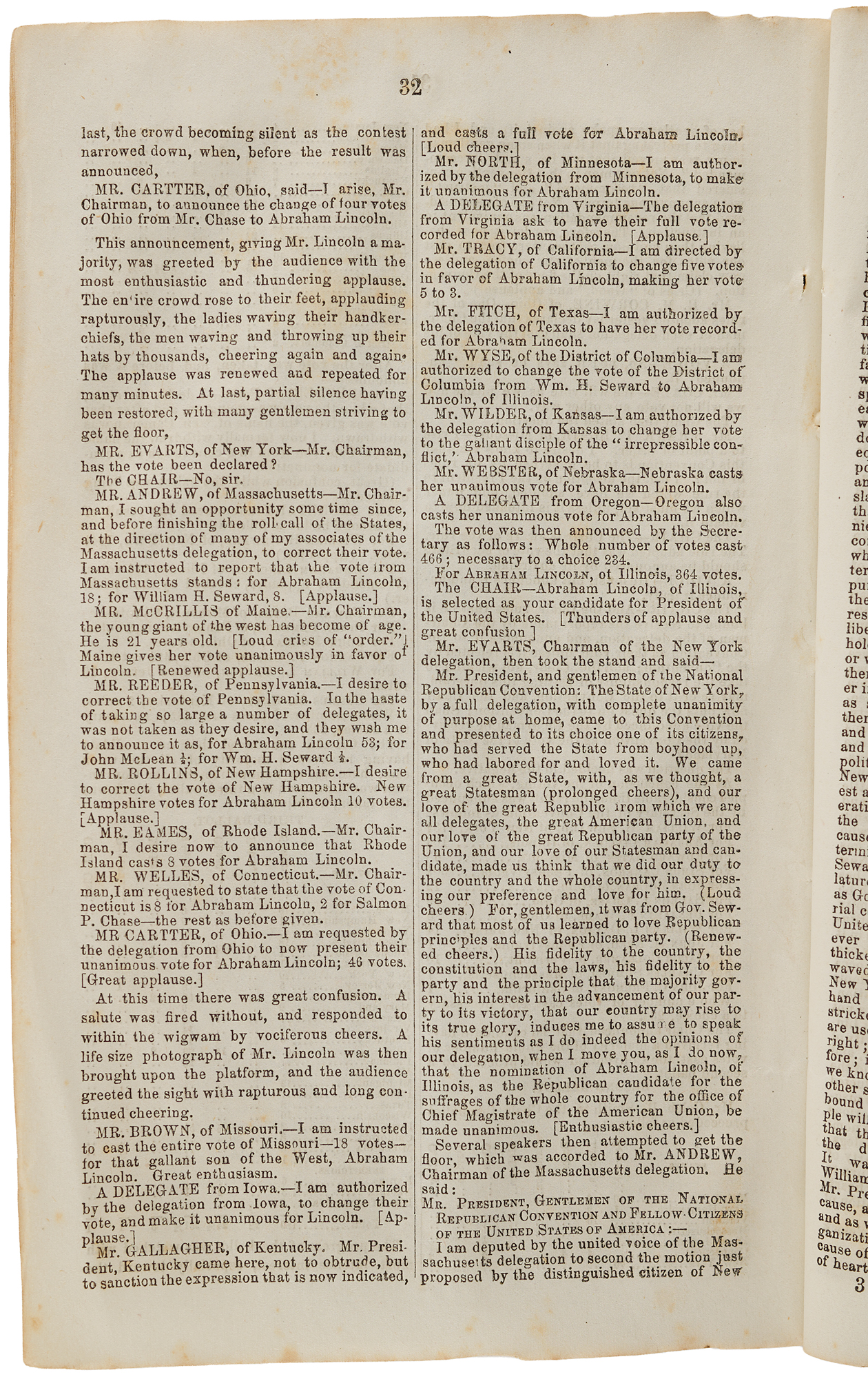 Day 3, May 18, 1860, was the decisive and dramatic climax of the Republican National Convention in Chicago, when Abraham Lincoln secured the presidential nomination after three intense ballots. Entering the day, William H. Seward led but lacked a majority; on the first ballot, he held a strong advantage, yet Lincoln surged on the second as delegates from key states shifted their support to the more broadly acceptable Illinois candidate. On the third ballot, Lincoln reached 231½ votes—just shy of the required majority—before several delegates switched their votes, pushing him over the threshold and igniting an eruption of cheers, shouting, and celebration. The nomination was then made unanimous, and later that day, Hannibal Hamlin of Maine was chosen as the vice-presidential candidate, completing the ticket that would win the 1860 election and alter the course of American history. The first page bears ink ownership notations. Housed in a custom-bound slipcase with matching chemise. In very good to fine condition, with scattered light foxing and staining, and trimming to the top and bottom edges.
