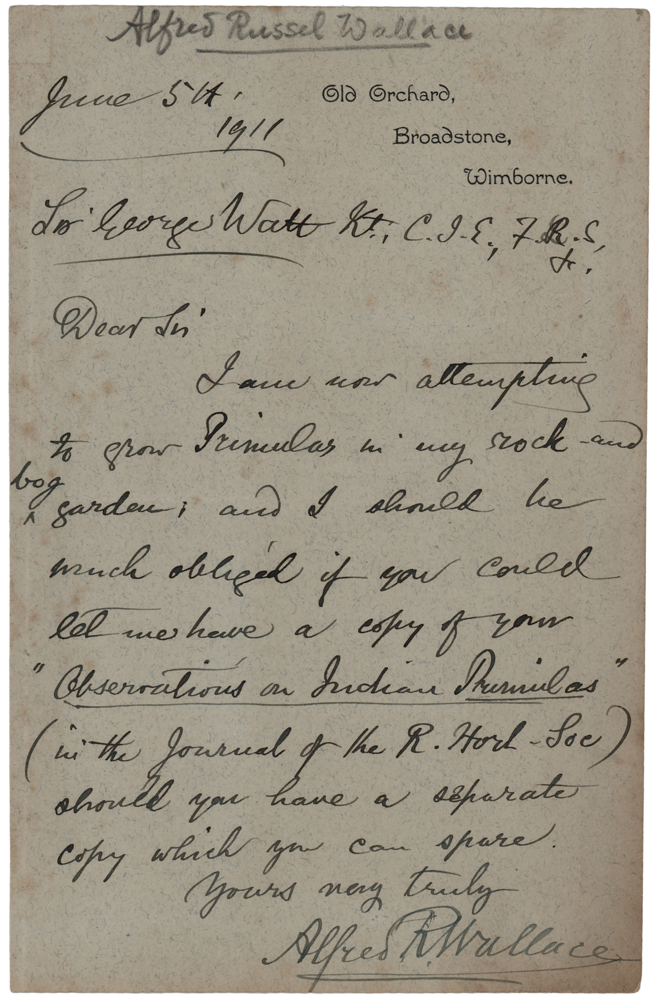 British naturalist, explorer, and biologist (1823–1913) best known for proposing a theory of natural selection which prompted Charles Darwin to publish his own. ALS signed “Alfred R. Wallace,” one page, 4.5 x 7, personal letterhead, June 5, 1911. Handwritten letter to physician and botanist George Watt, in full: "I am now attempting to grow Primulas in my stock and bog garden; and I should be much obliged if you could let me have a copy of your 'Observations on Indian Primulas' (in the Journal of the R. Hort. Soc.) should you have a separate copy which you can spare." In fine condition, with scattered light foxing.