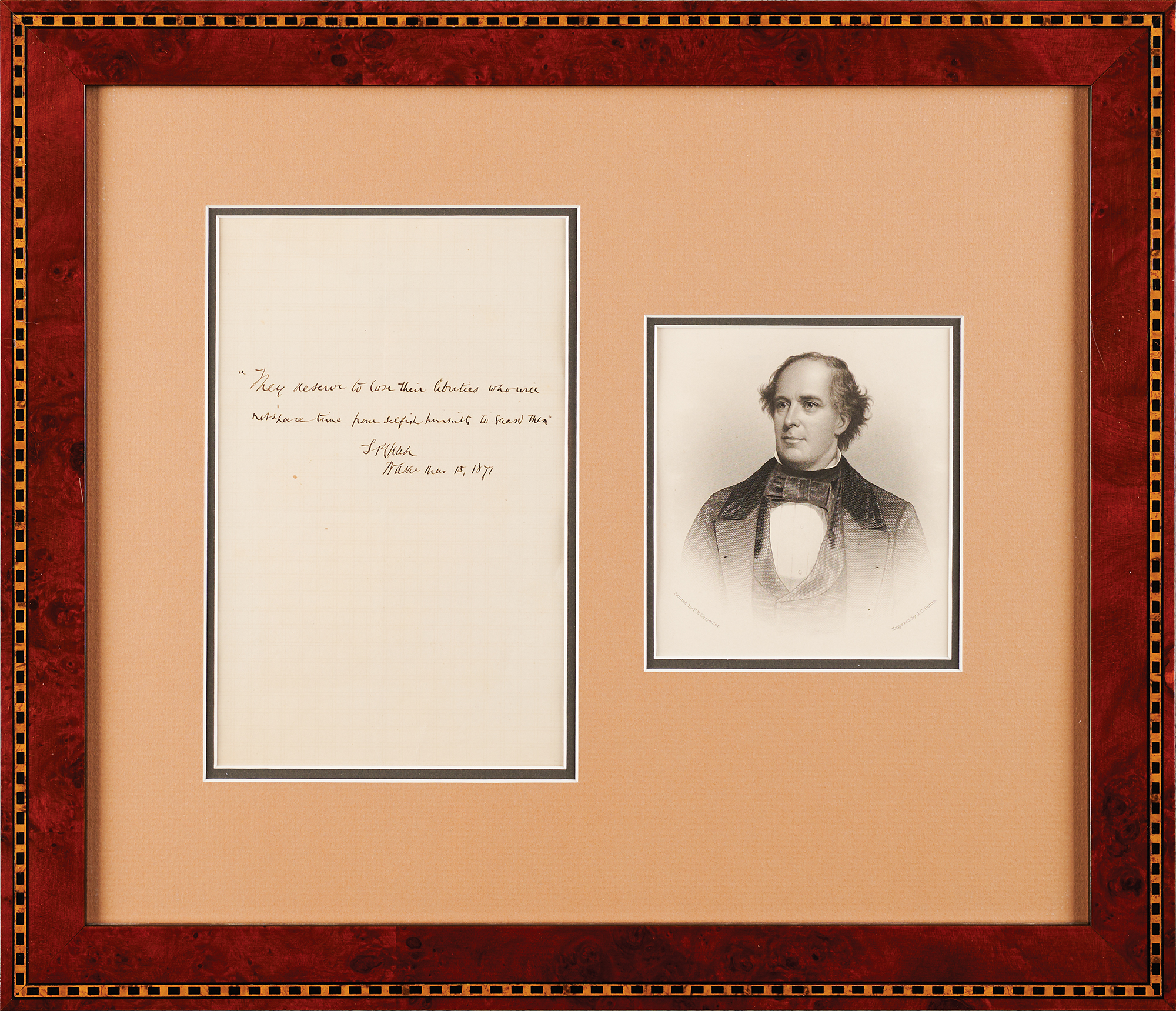 Politician (1808-1873) who served as secretary of the treasury for the first three years of Abraham Lincoln's term, after which Lincoln appointed him chief justice of the Supreme Court. In that role Chase presided over the 1868 impeachment trial of President Andrew Johnson. AQS on an off-white 4.75 x 7.5 sheet, signed at the conclusion in ink, "S. P. Chase, Wash'n Mar. 15, 1871." Chase pens a quote from 'Zenobia; Or, the Fall of Palmyra' by William Ware, in full: "They deserve to lose their liberties, who will not spare time from selfish pursuits to guard them." Nicely double-matted and framed with an engraved portrait to an overall size of 16 x 13.75. In fine condition, with a light diagonal bend across the top blank area.