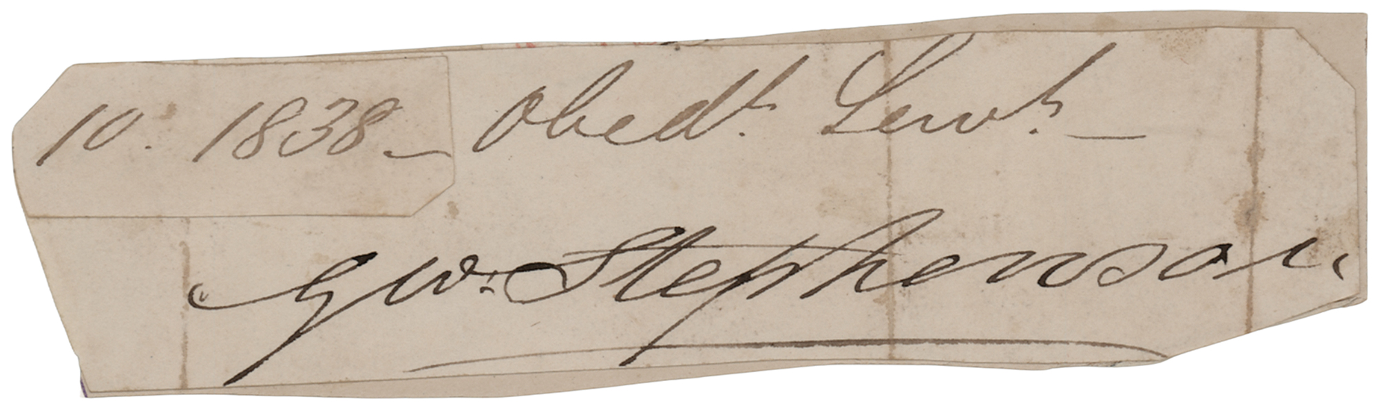 Civil and mechanical engineer (1781–1848) who built the first public rail line using steam locomotives. Ink signature, "Geo: Stephenson,” on an off-white 4.5 x 1 slip bearing an affixed date tab of "1838." Applied to a slightly larger cardstock mount and in very good to fine condition, with irregular trimming and several vertical folds.