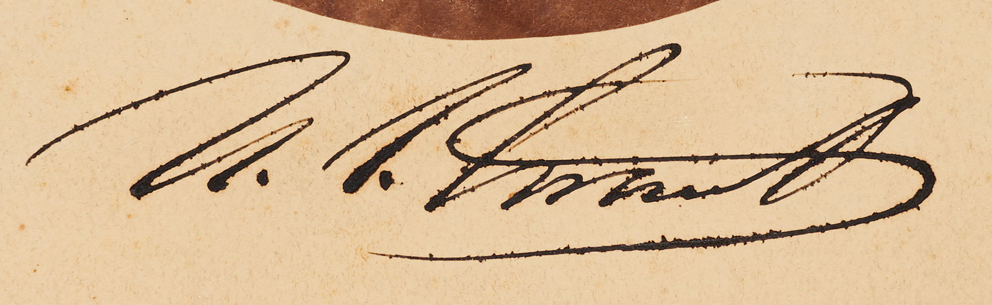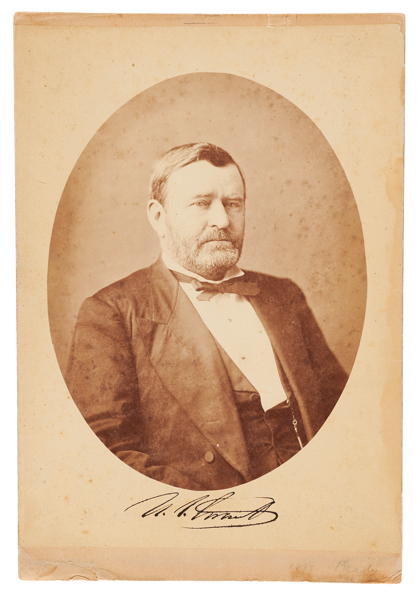 Rare oversized 7.25 x 10 albumen photo of Ulysses S. Grant, affixed to a 7.25 x 11 mount, signed below the image in bold ink, "U. S. Grant." Annotated on the reverse in ink, "Washington D.C., Aug. 4, 1876." A pencil notation on the mount attributes the photograph to Mathew Brady. In very good to fine condition, with scattered light foxing, staining along the right edge of the image, and short tears to the top and bottom edges of the mount. An unusually large signed photograph of the Civil War hero.