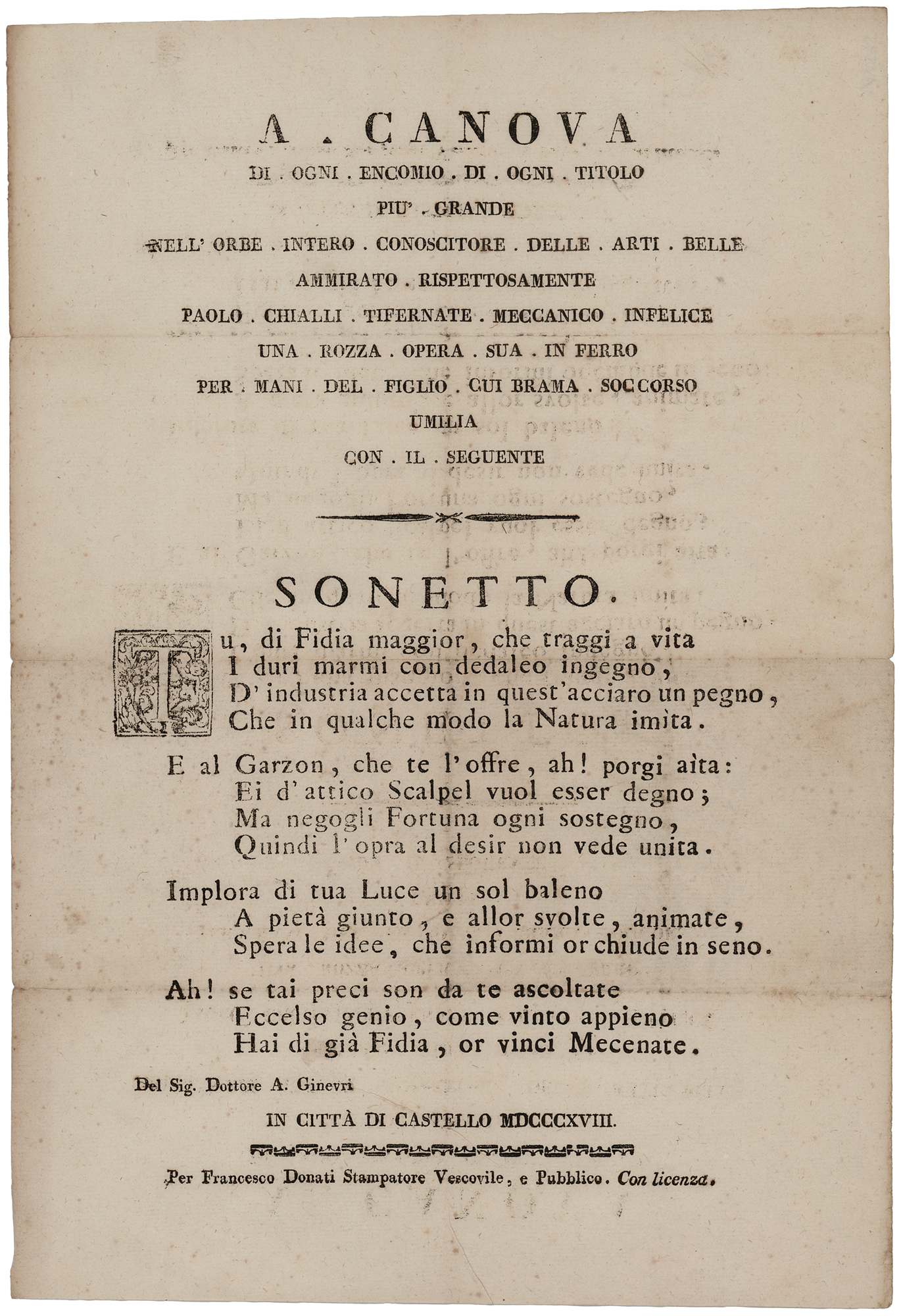 Italian sculptor (1757–1822) known for his neoclassical marble nudes. ALS in Italian, one page, 7.5 x 9.75, May 29, 1807. Handwritten letter of recommendation by Antonio Canova, in part (translated): "I received with particular cordiality what I gratefully accepted from you by way of recommendation on behalf of the young Mr. Landini, an award-winning student of Architecture. I shall offer myself to him with true sincerity, so that I may be freely employed in matters of his service and assist him wherever I may judge that my work can be of use." In very good to fine condition, with some light staining. Accompanied by an 1818 broadside printing of a sonnet dedicated to Canova.