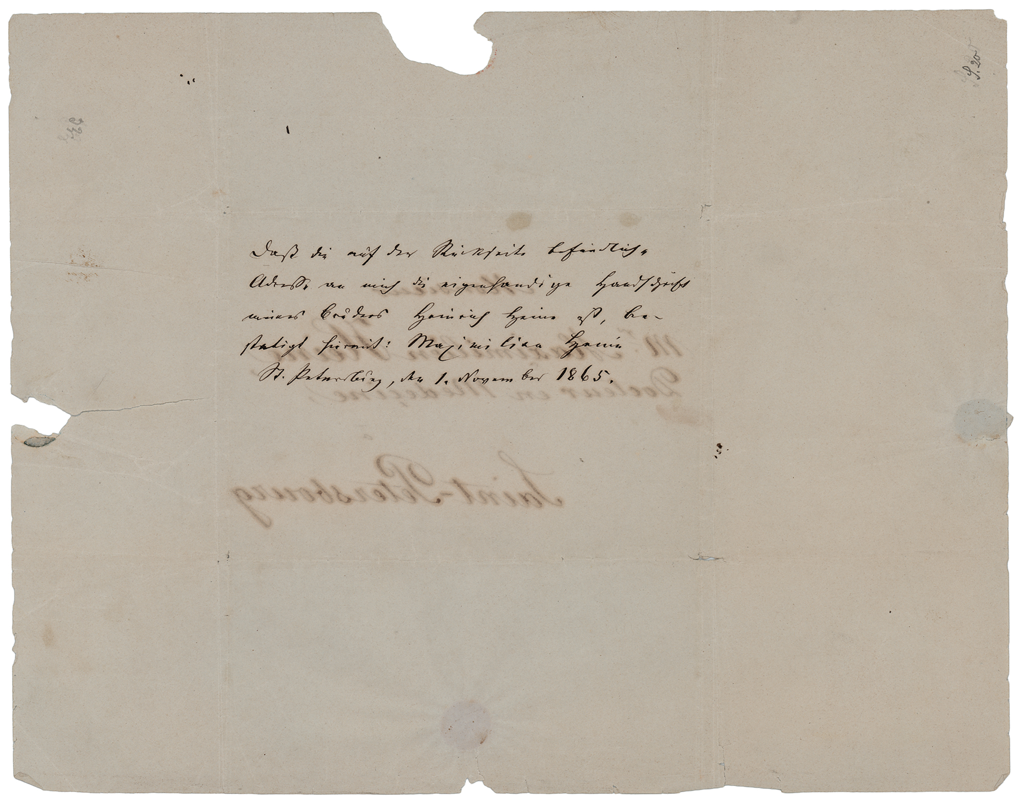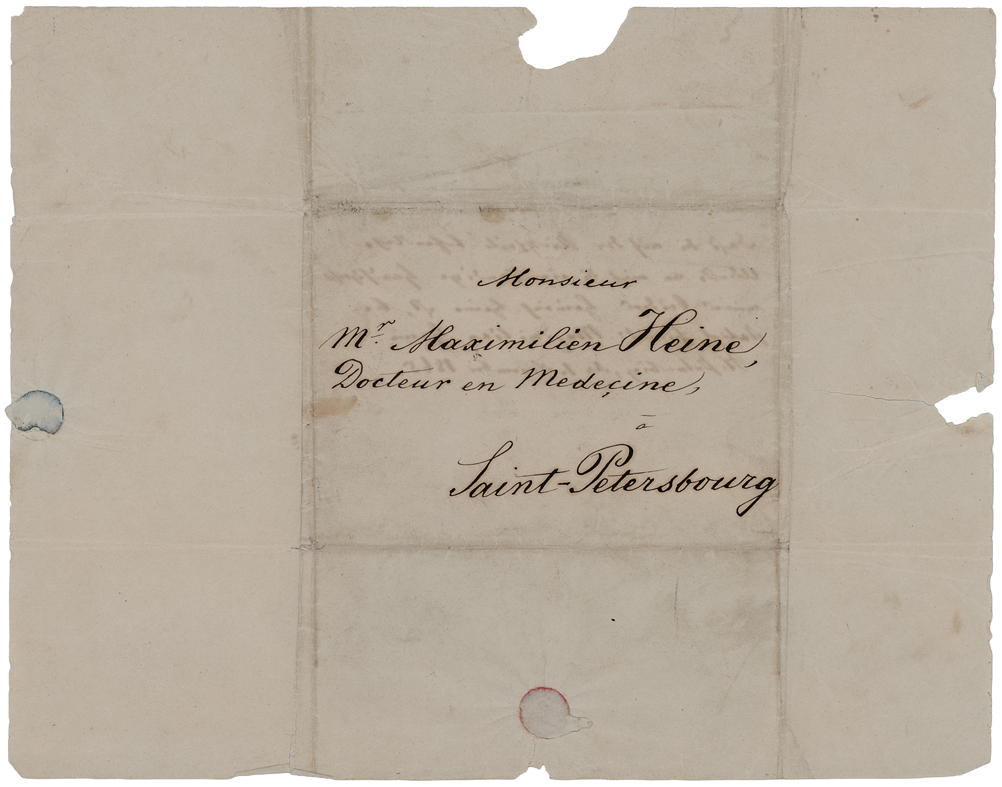 Eminent German poet (1797-1856), one of the leading literary figures of the Romantic era, whose verses were set to music by such composers as Schubert, Mendelssohn, Schumann, Brahms, Wolf, Strauss, and Wagner. Hand-addressed mailing cover accomplished by Heinrich Heine, measuring 10.5 x 8.5 open, with a central panel of 5 x 3.75, addressed by Heine to his brother: "Monsieur Mr. Maximilien Heine, Docteur en Medecine, Saint-Petersbourg." On the reverse is a handwritten note by Maximilian Heine, dated November 1865, identifying the handwriting as that of his brother. In fine condition, with tears and seal-related loss to the wide borders.