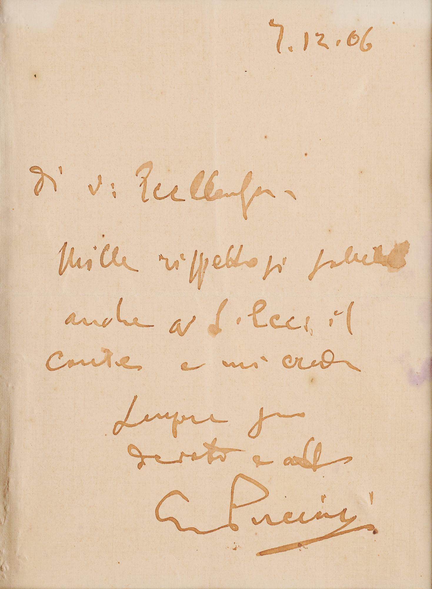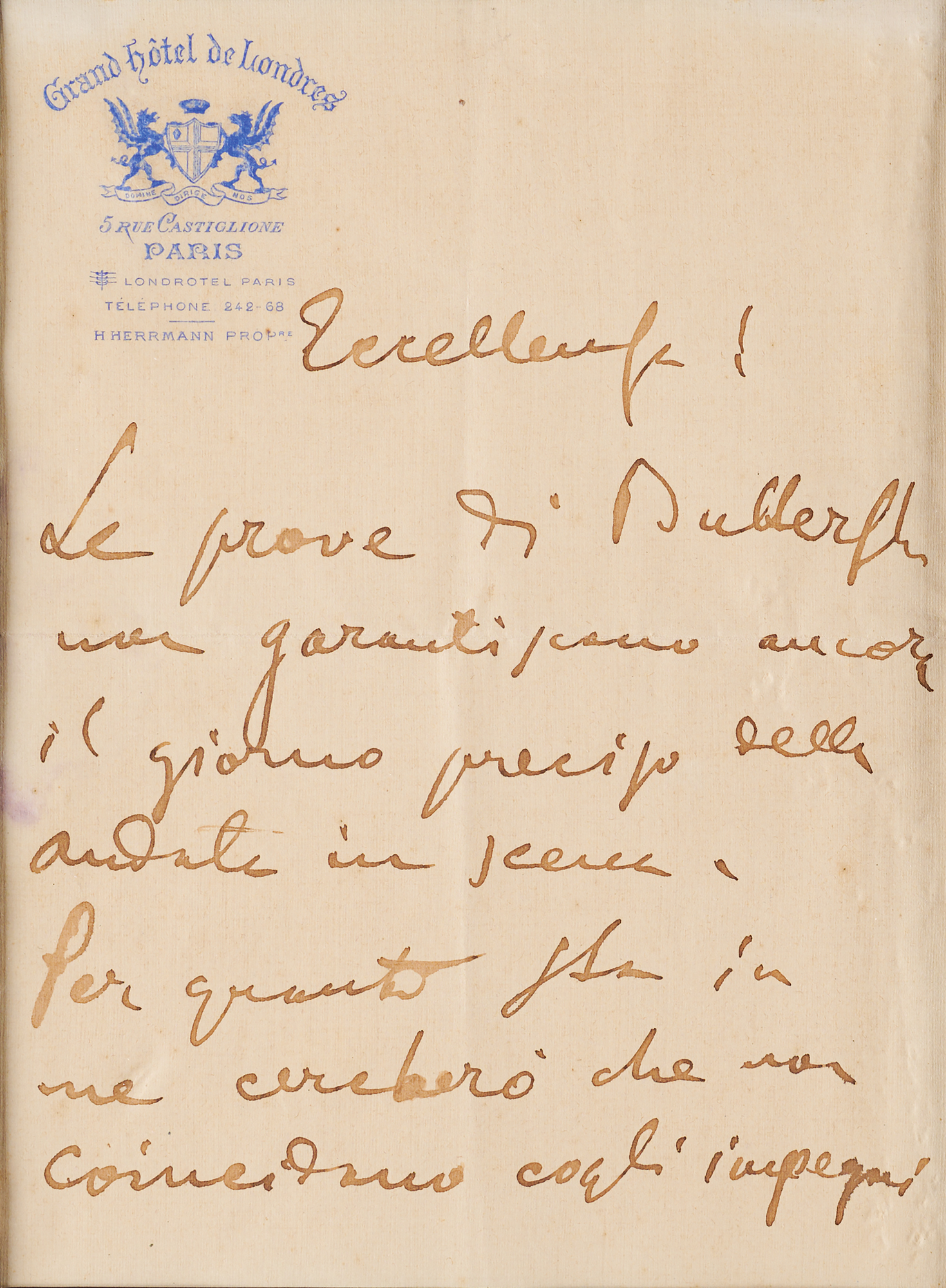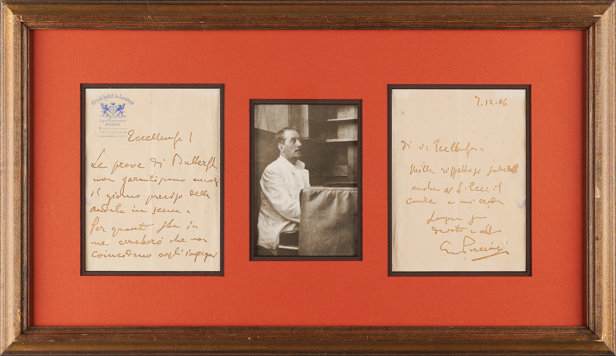 ALS in Italian, signed “G. Puccini,” two pages, 4.75 x 6.5, Grand Hotel de Londres (Paris) letterhead, December 7, 1906. Untranslated handwritten letter from the revered composer regarding his legendary opera Madama Butterfly. Archivally double-matted and framed with a photo of Giacomo Puccini to an overall size of 22.5 x 13. In fine condition, with a couple of small stains to the last page. In 1907, Puccini completed his final revisions to the opera, creating a fifth version that became known as the 'standard version.' Today, this standard version is the one most frequently performed around the world.