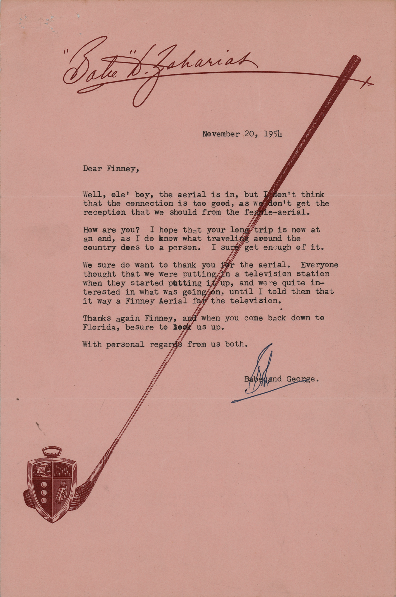 TLS signed “Babe,” one page, 7 x 10.5, personal letterhead, November 20, 1954. Letter to M. L. Finneburgh, in part: "Well, ole' boy, the aerial is in, but I don't think that the connection is too good, as we don't get the reception that we should from the fennie-aerial. How are you? I hope that your long trip is now at an end, as I do know what traveling around the country does to a person…We sure do want to thank you for the aerial. Everyone thought that we were putting in a television station when they started putting it up, and were quite interested in what was going on, until I told them that it wa[s] a Finney Aerial for the television." In fine condition, with staple holes to the upper left corner. Accompanied by the original mailing envelope.