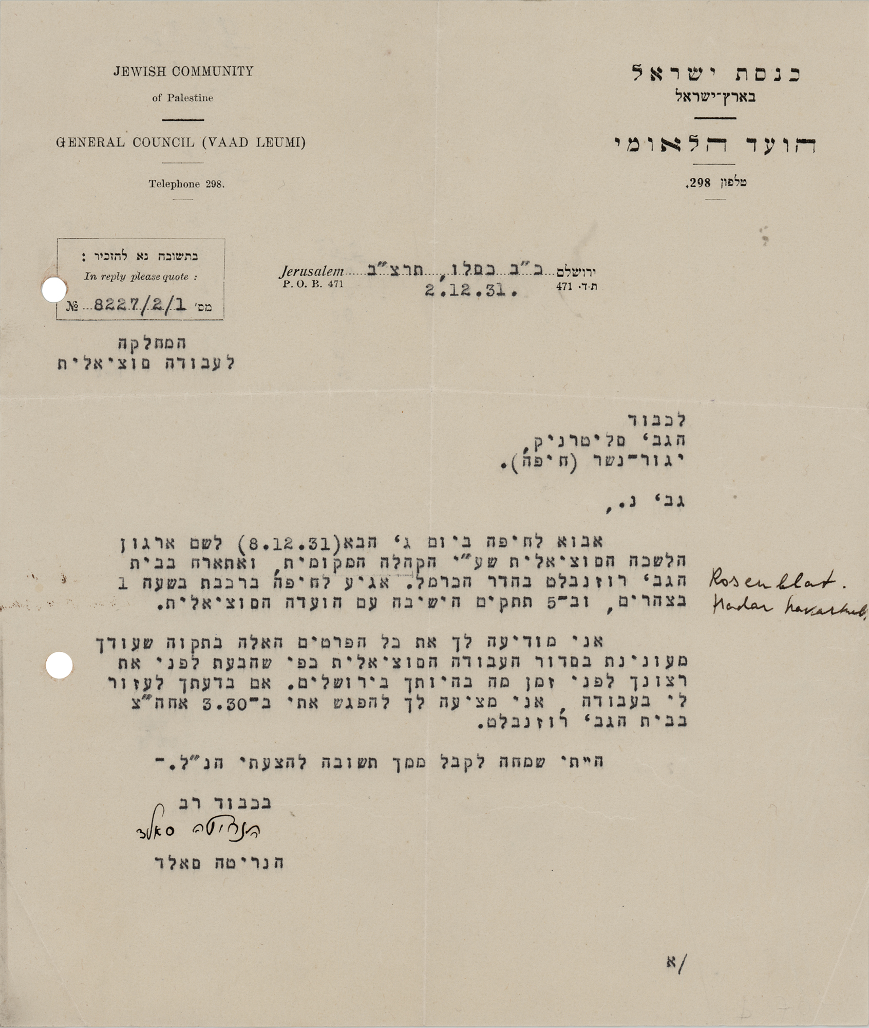 Zionist leader (1860–1945) who worked for the Jewish Publishing Society of America before she founded Hadassah in 1912. TLS in Hebrew, one page, 7.25 x 8.5, Jewish Community of Palestine, General Council letterhead, December 2, 1931. Letter to an activist colleague, in part (translated): "I will come to Haifa…to organize the local social department…If you still want to help me, meet with me." In fine condition.