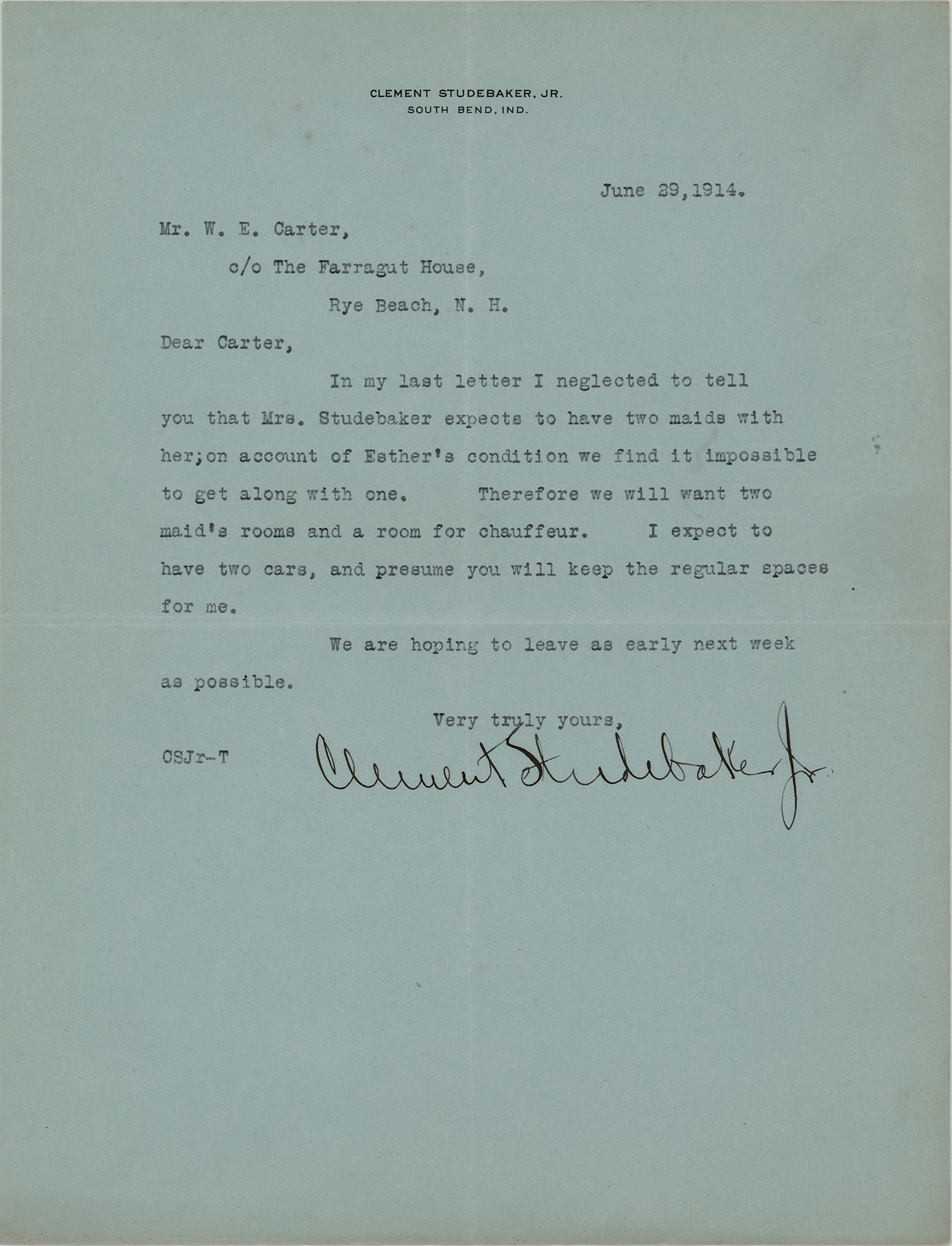 Son of the founder of the Studebaker Corporation who held several executive positions in the family's automobile business (1871-1932). TLS, one page, 8.5 x 11, personal letterhead, June 29, 1914. Letter to W. E. Carter, in part: "In my last letter I neglected to tell you that Mrs. Studebaker expects to have two maids with her; on account of Esther's condition we find it impossible to get along with one. Therefore we will want two maid's rooms and a room for chauffeur. I expect to have two cars, and presume you will keep the regular spaces for me." In fine condition.