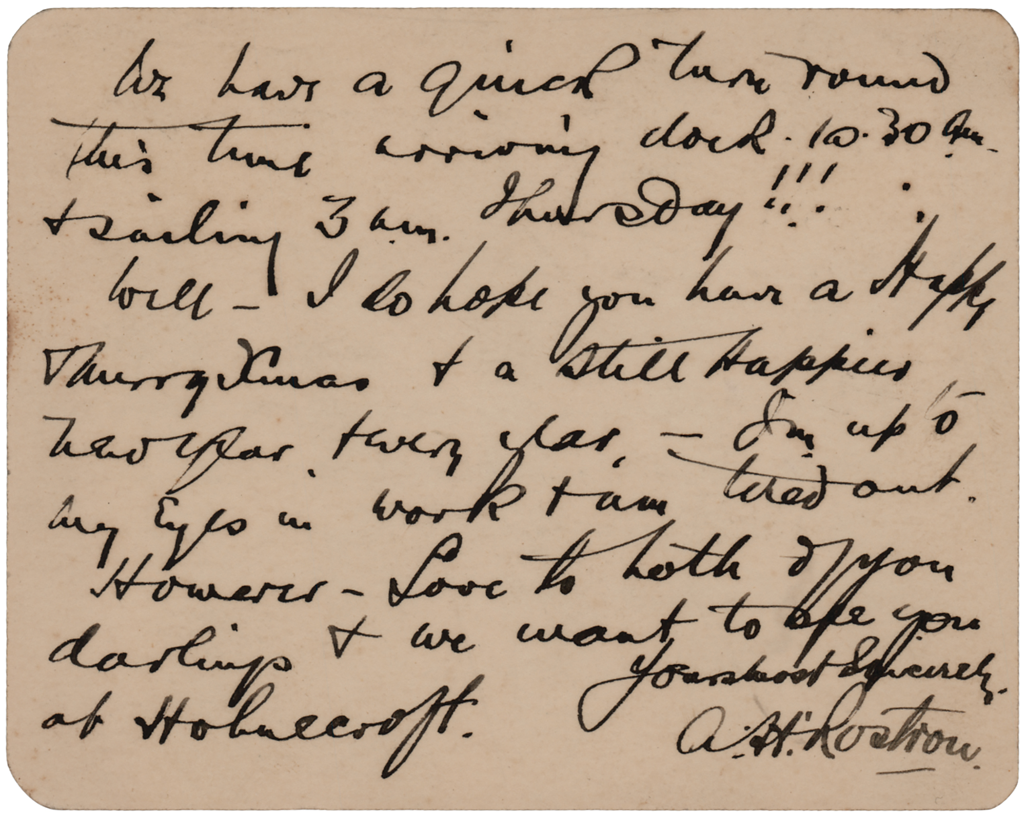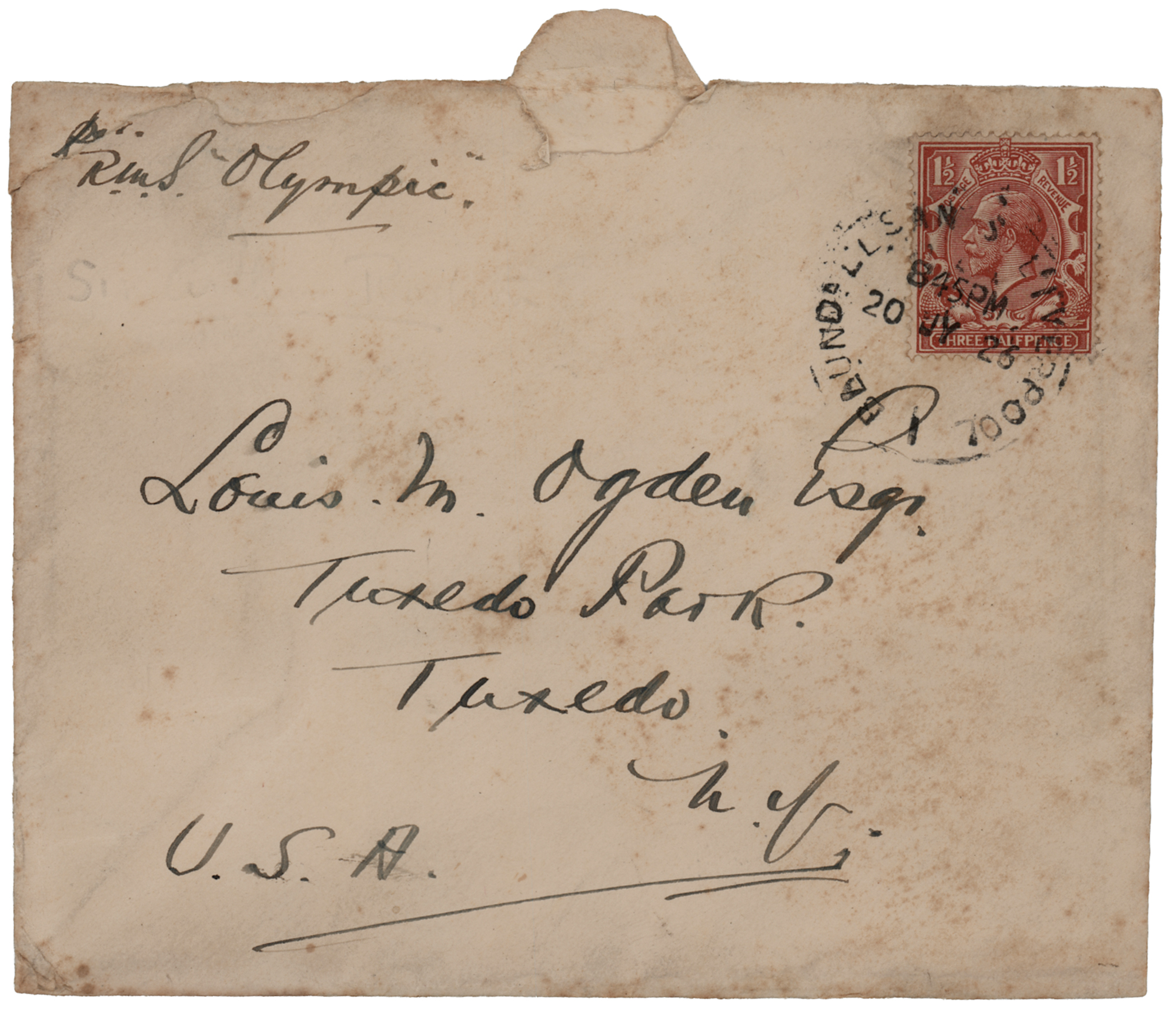 Captain of the Carpathia (1869–1940) responsible for rescuing Titanic survivors on the morning of April 15, 1912. ALS signed "A. H. Rostron," one page both sides, 4.25 x 3.5, "On Board the Cunard, RMS Berengaria" letterhead, January 20, 1926. Handwritten letter to his friend Louis M. Ogden, a New York socialite who was aboard the RMS Carpathia during the Titanic disaster and who helped to photograph, document, and assist the survivors. In full: "Thank you for your letter and kind Xmas present for Margaret—Minnie was upset because I told her you'd be away for Xmas & so she couldn't send you anything. Any way I brought out a card on off chance–thank goodness. We have a quick turn round this time arriving dock 10:30 a.m. & sailing 3 a.m. Thursday!!! Well—I do hope you have a Happy & Merry Xmas & a still happier New Year & every year. I'm up to my eyes in work & am tired out. However—love to both of you darlings & we want to see you." In very fine condition. Accompanied by the original mailing envelope, addressed in Rostron's own hand, with "RMS Olympia" written in the return address area.